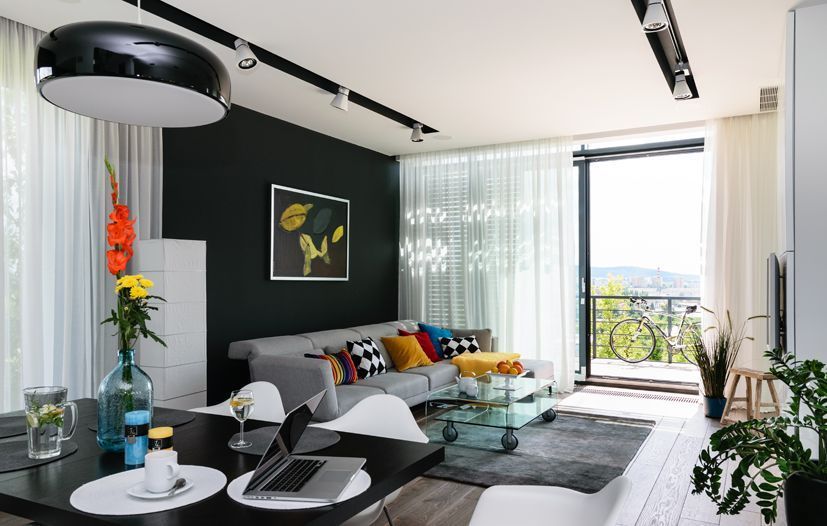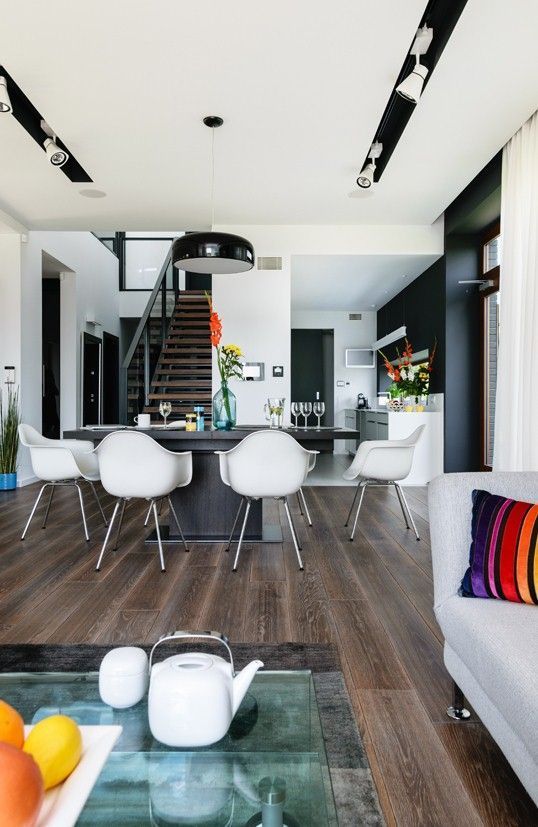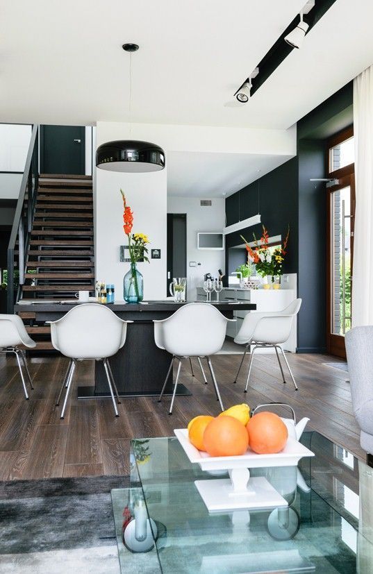 Inspiracje dla tego wyjątkowego domu były jasno określone – odejście od typowych dla polskiego krajobrazu, rustykalnych rozwiązań na rzecz minimalistycznej architektury inspirowanej stylem skandynawskim. Projekt architektoniczny autorstwa Wojtka Kurzaka został konsekwentnie rozwinięty przez Dorotę Gwizdak, odpowiedzialną za wnętrza, oraz Gabrysię Kijewicz, projektantkę ogrodu, co pozwoliło stworzyć spójną, harmonijną całość. Ograniczenia planistyczne narzuciły zastosowanie dwuspadowego dachu, jednak brak okapów oraz niemal całkowicie przeszklona elewacja południowa otworzyły spektakularną panoramę miasta. Dzięki temu dom zyskał nowoczesny charakter, bliski idei, jaką reprezentuje nowoczesna stodoła, przy jednoczesnym zachowaniu lekkości formy i funkcjonalności.