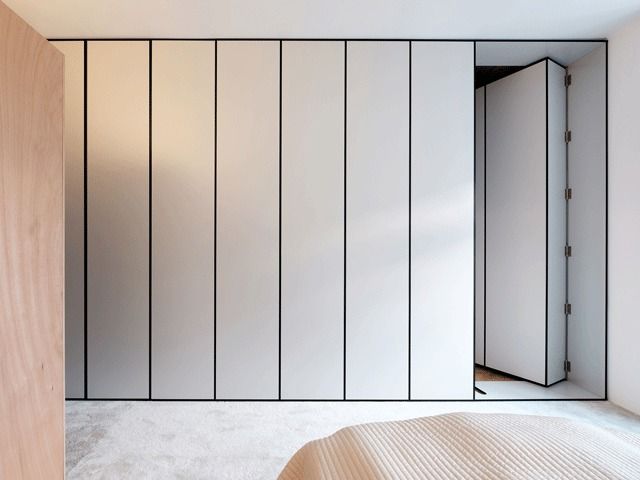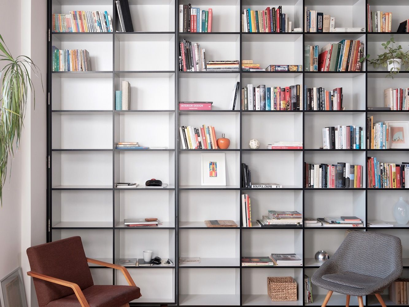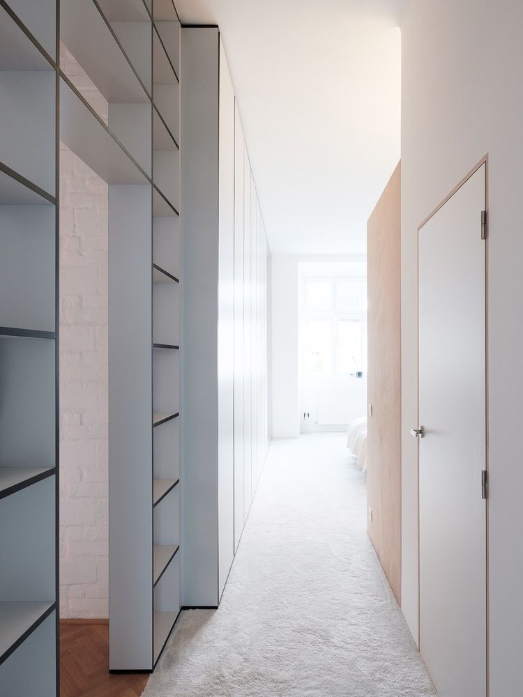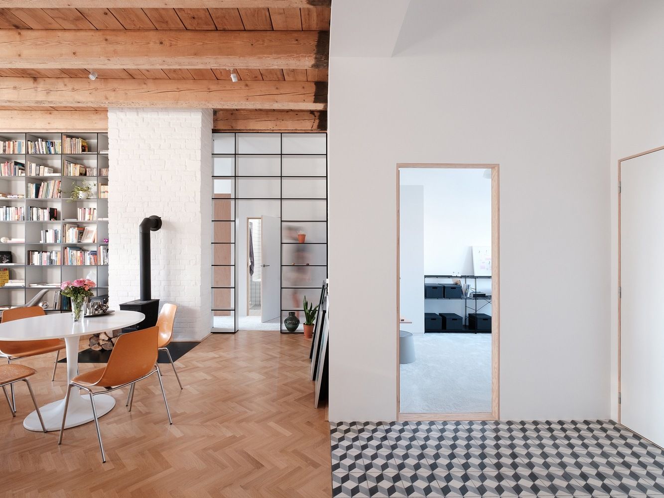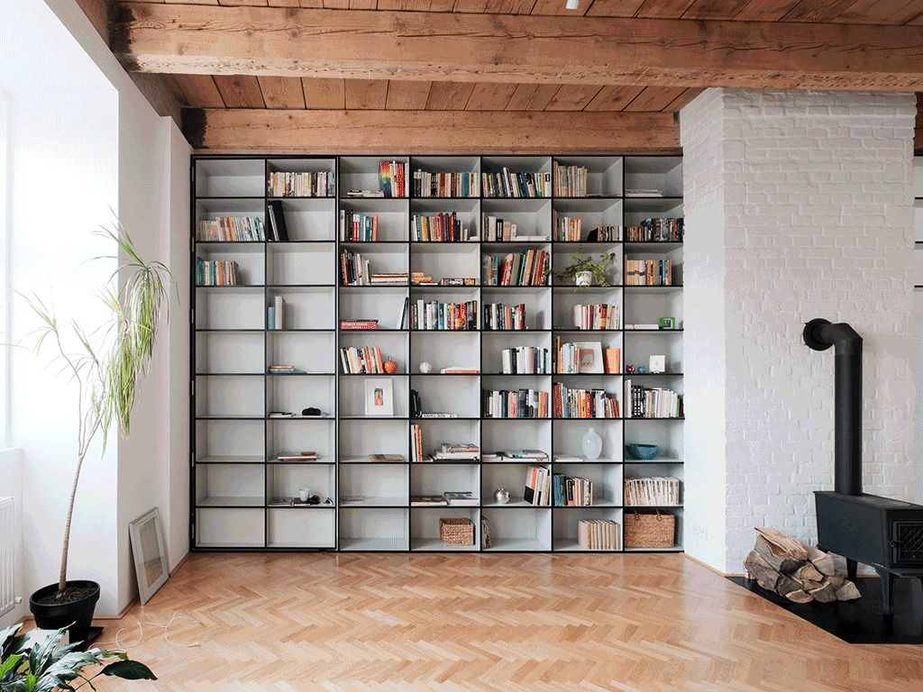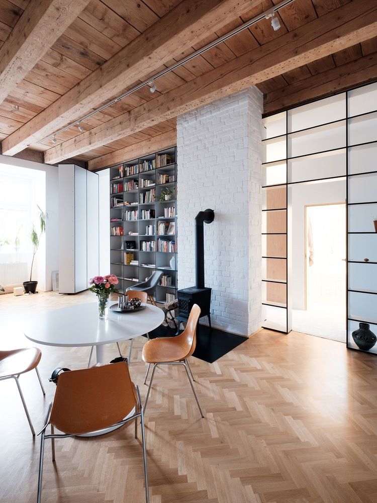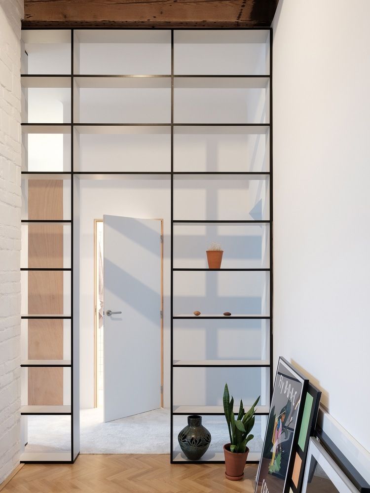 Główną częścią mieszkania jest salon z hallem o wysokości 3,6 m, w którym odkryto oryginalne belki sufitowe. Architekci dodali bibliotekę na pełną wysokość pomieszczenia, która częściowo pełni rolę sekretnego przejścia do sypialni, zapewniając płynne połączenie między strefami mieszkania.