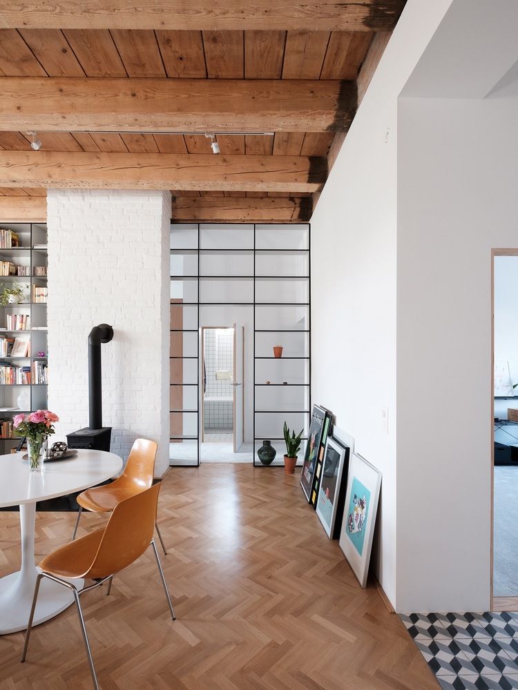 Mieszkanie znajduje się w starym klasztorze z 1719 roku, który w połowie XX wieku przekształcono w budynek mieszkalny. Projekt miał na celu stworzenie funkcjonalnej i minimalistycznej przestrzeni dla młodej pary.
