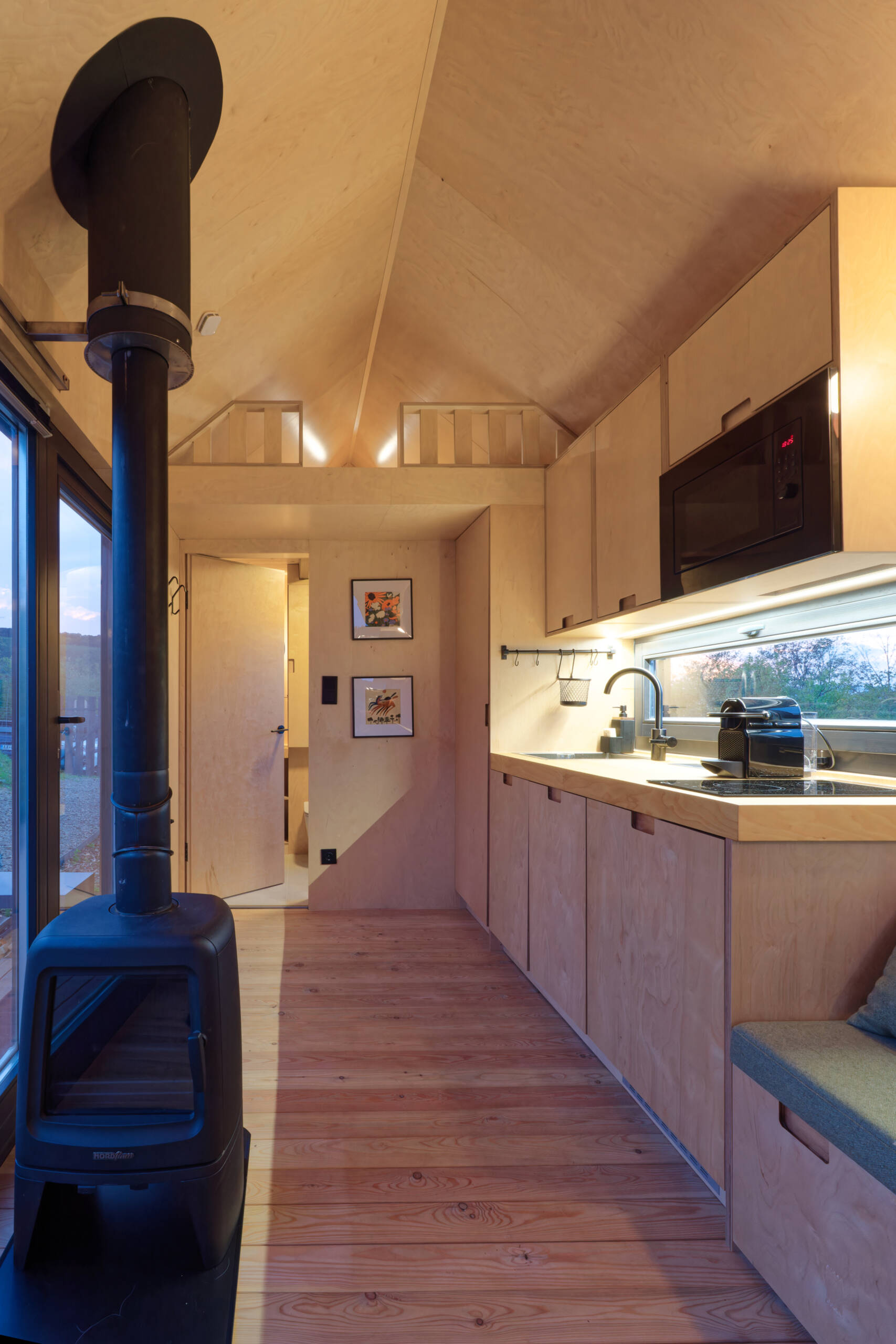 Najbardziej charakterystycznym elementem jest trapezoidalne okno biegnące wzdłuż dłuższej osi budynku. To ono definiuje relację z krajobrazem i sprawia, że mikro domek wydaje się otwarty i przestronny. W środku znalazło się miejsce na strefę wypoczynku, aneks kuchenny, część sypialnianą, niewielką antresolę oraz łazienkę – wszystko zaprojektowane w sposób maksymalnie efektywny.