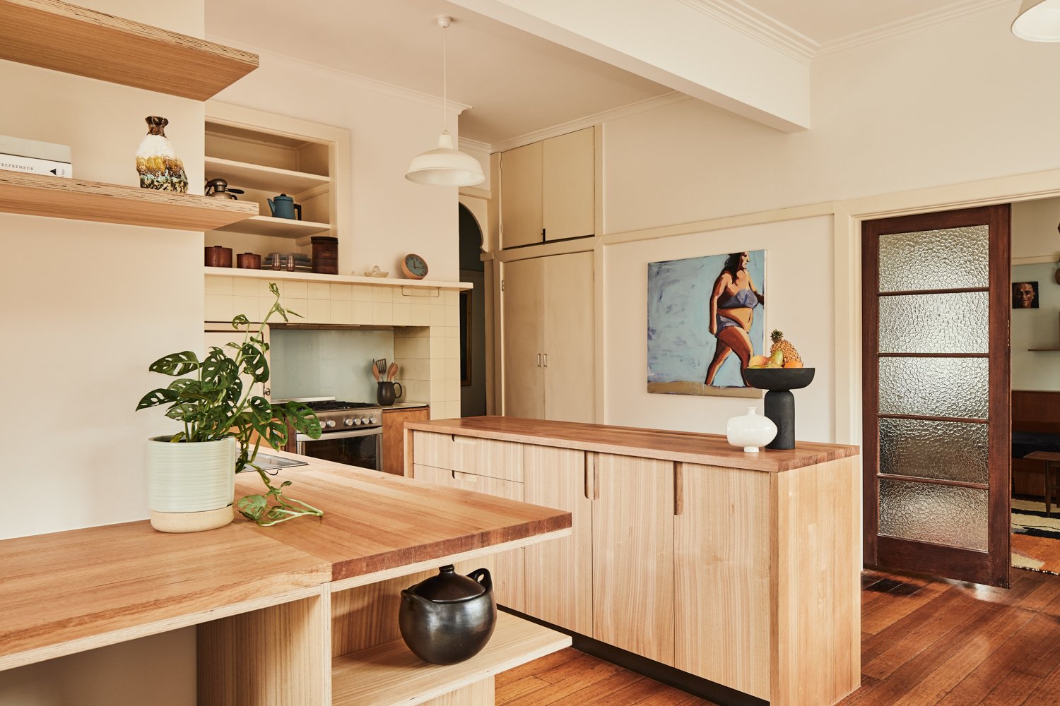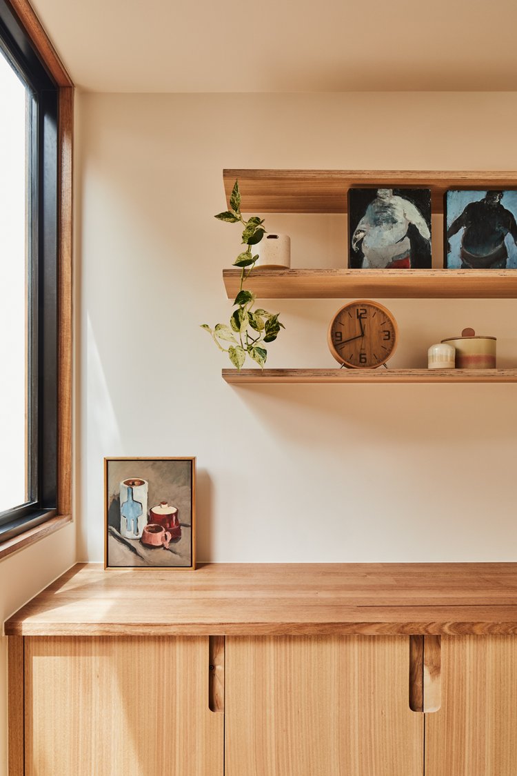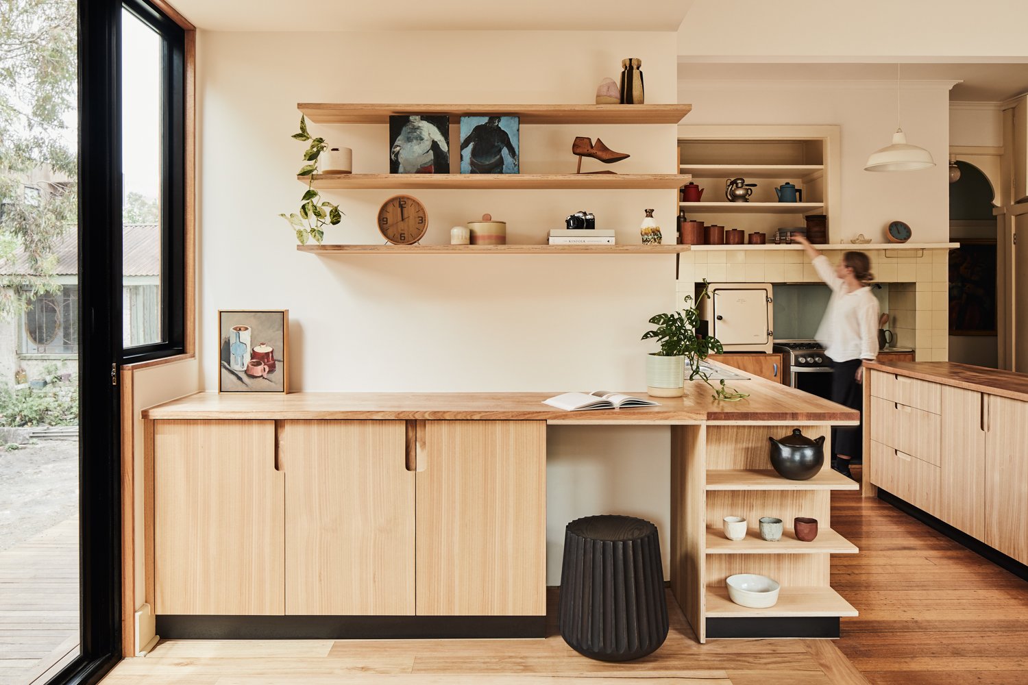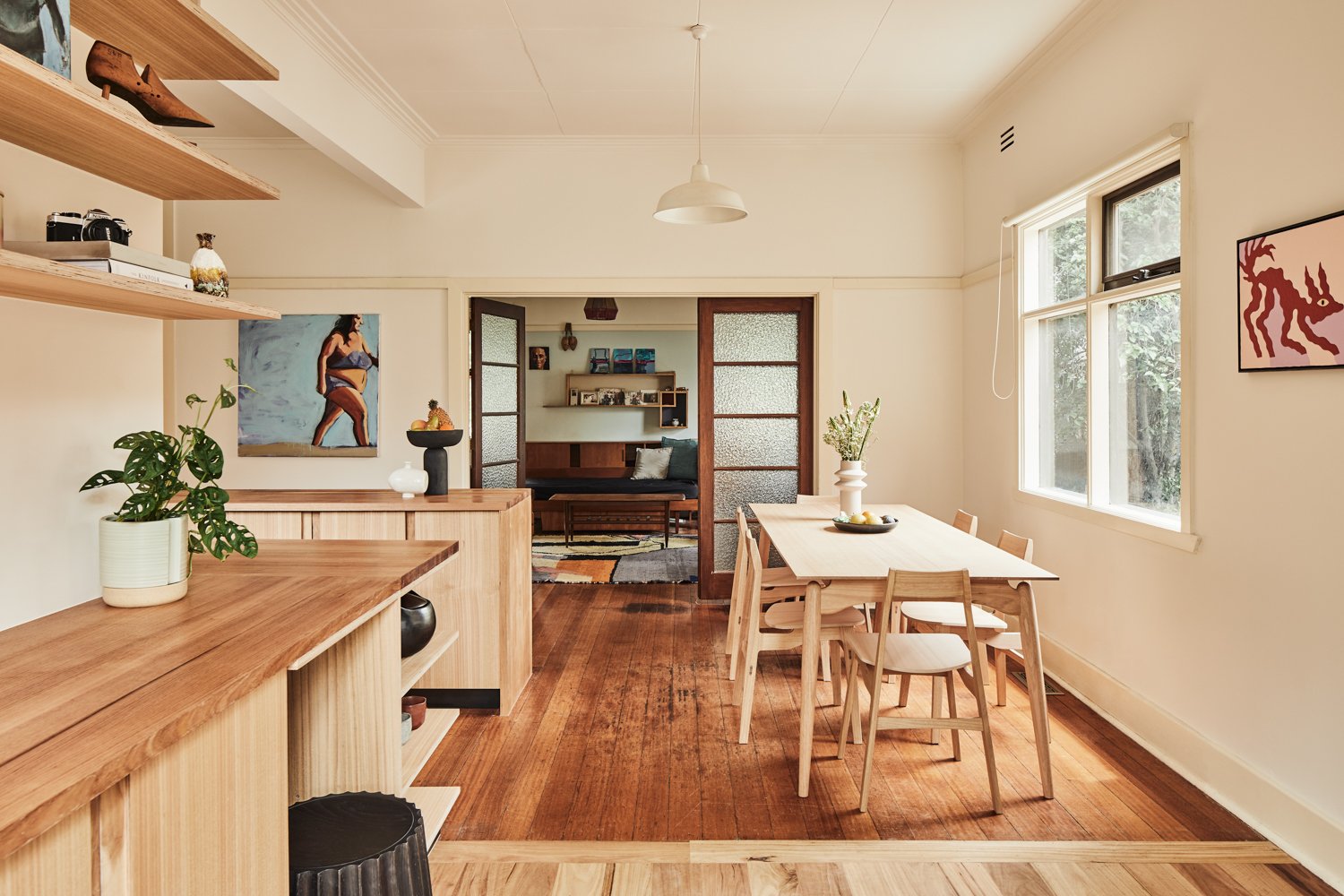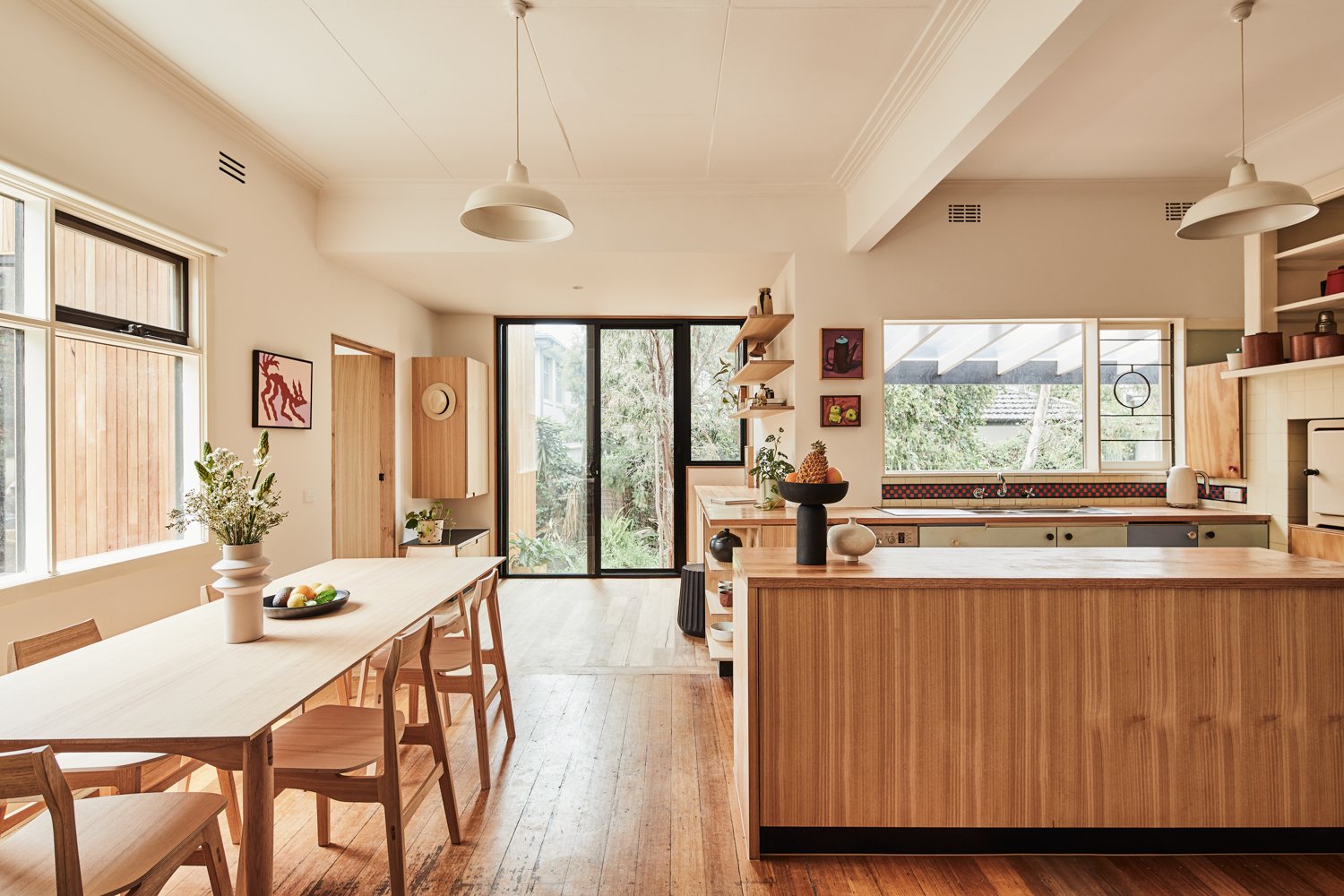 Wnętrze zachowuje oryginalny charakter domu retro, ale zostało otwarte na światło i przestrzeń. Zburzenie ściany między kuchnią a jadalnią umożliwiło stworzenie jednej wspólnej strefy dziennej. Długa, wyspowa ławka w miejscu dawnej przegrody podkreśla granicę między tym, co było, a tym, co nowe – oferując praktyczną przestrzeń oraz ciekawy element stolarski.