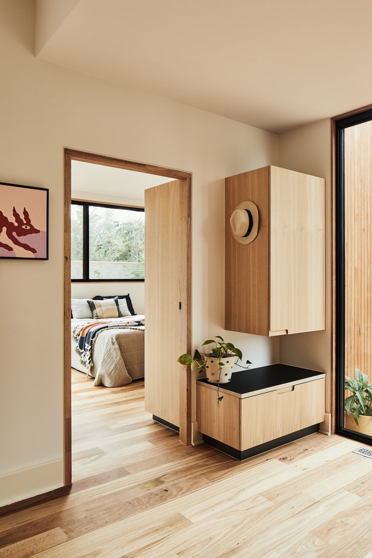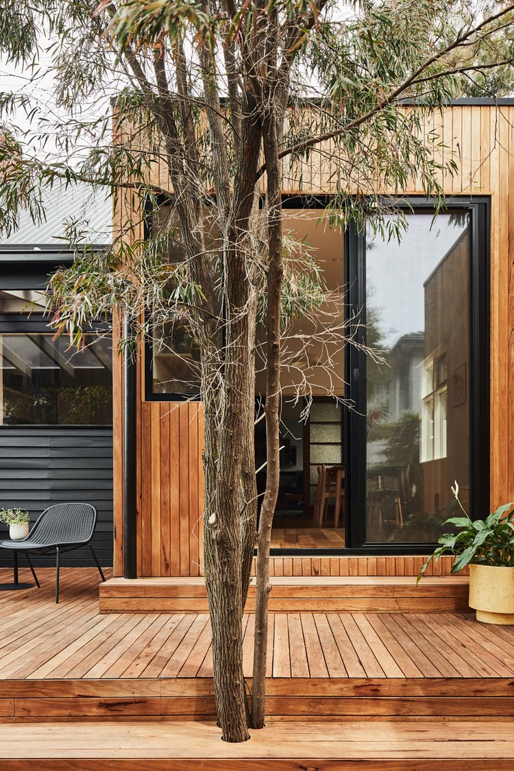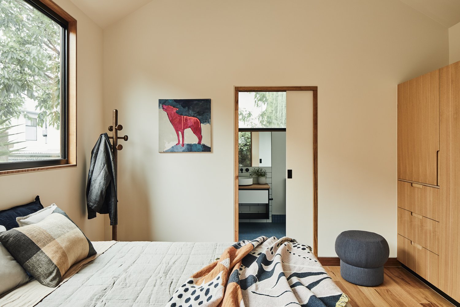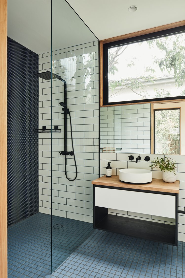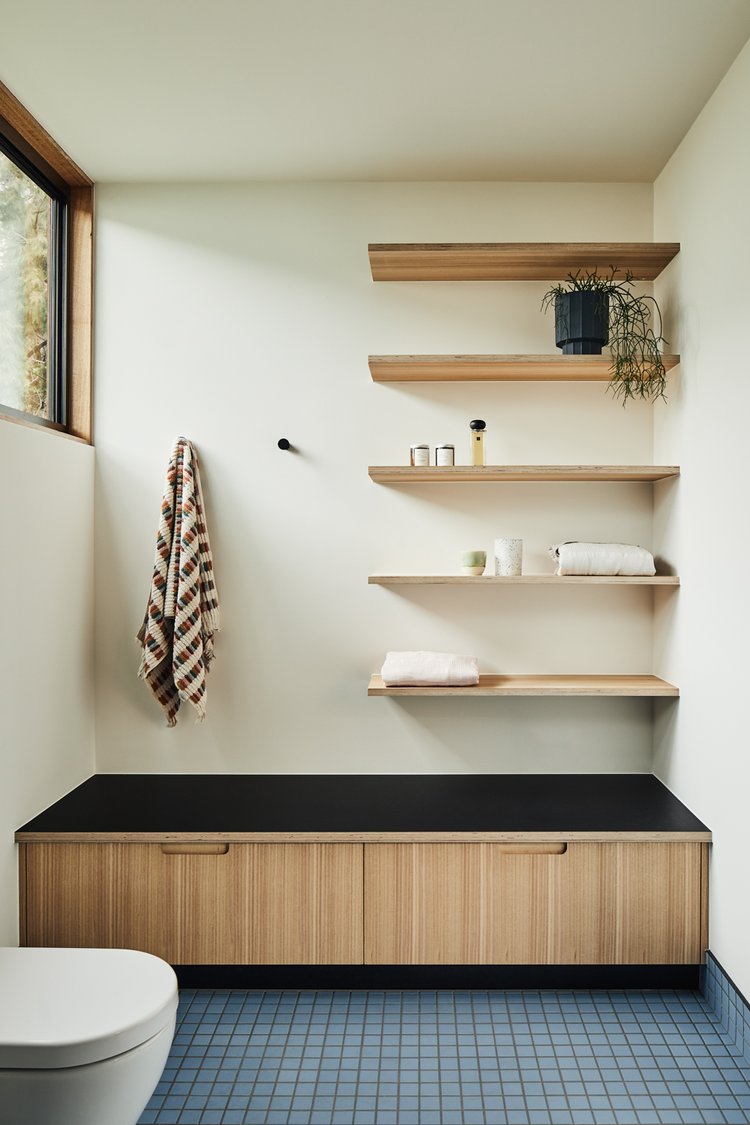 Wnętrze zachowuje oryginalny charakter domu retro, ale zostało otwarte na światło i przestrzeń. Zburzenie ściany między kuchnią a jadalnią umożliwiło stworzenie jednej wspólnej strefy dziennej. Długa, wyspowa ławka w miejscu dawnej przegrody podkreśla granicę między tym, co było, a tym, co nowe – oferując praktyczną przestrzeń oraz ciekawy element stolarski.