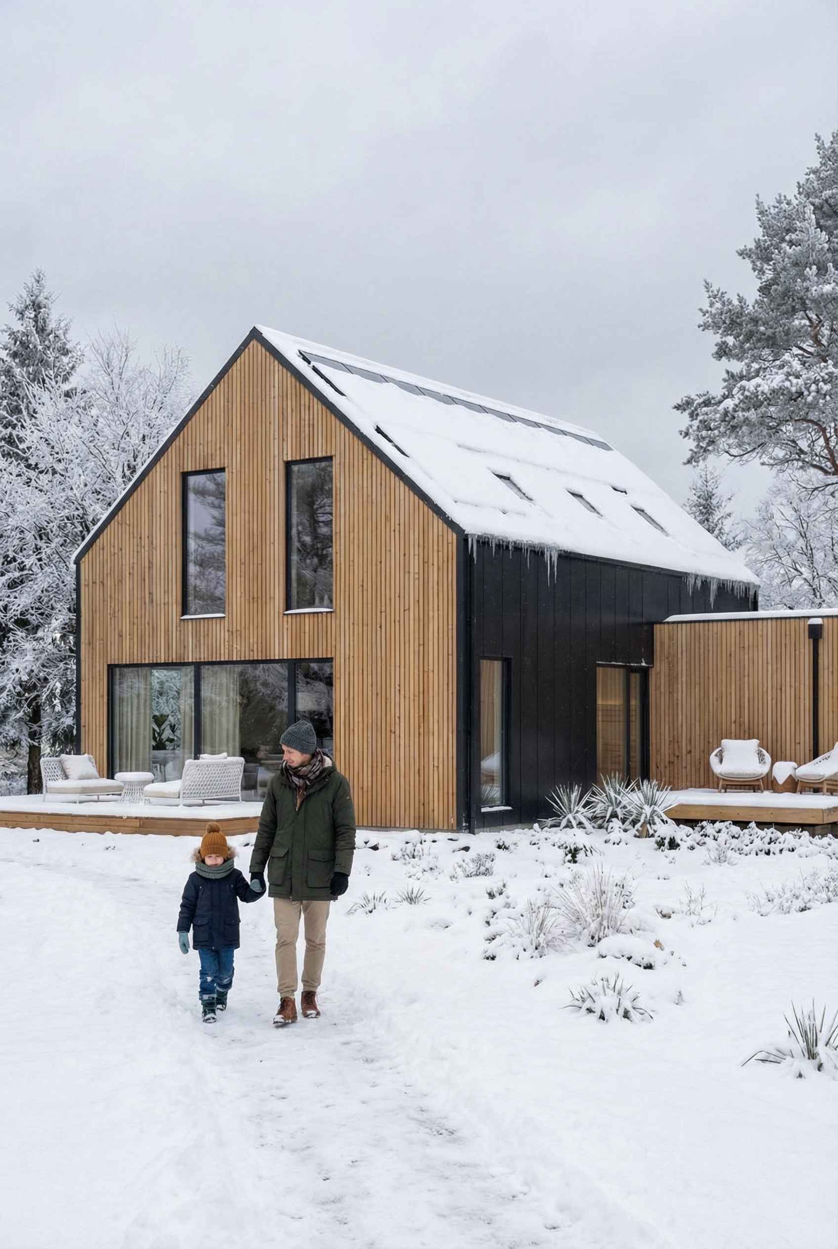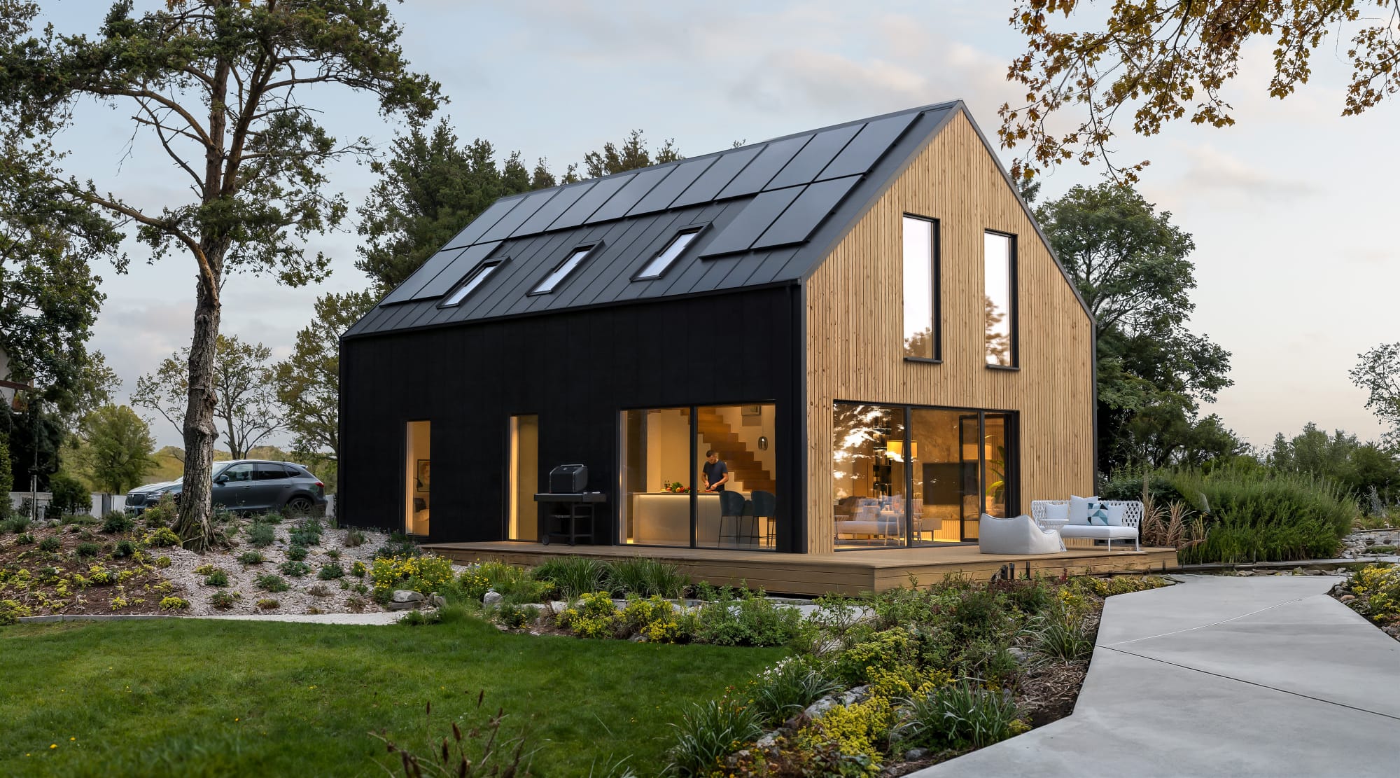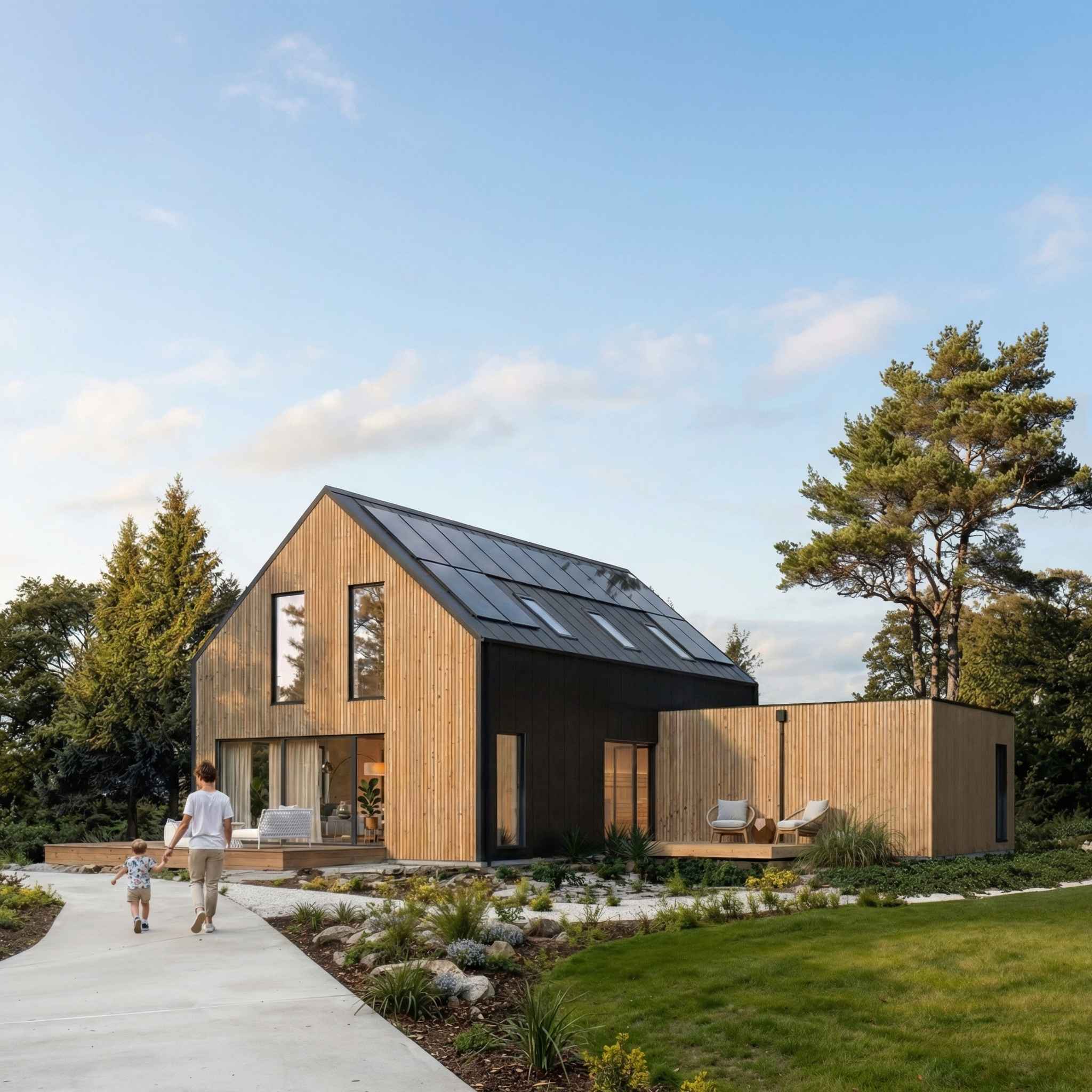 Bryła pozostaje prosta i czytelna — dwuspadowy dach, zwarte proporcje i oszczędna forma, która dobrze wpisuje się w kontekst współczesnej architektury jednorodzinnej. Kluczową rolę odgrywa tu jednak nie tylko estetyka, ale technologia: konstrukcja modułowa pozwala przenieść większość procesu budowy do fabryki, co przekłada się na krótszy czas realizacji i większą kontrolę jakości.