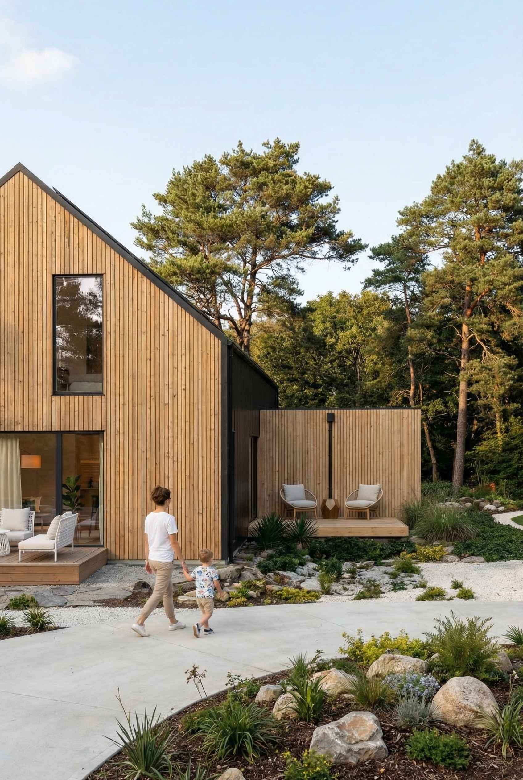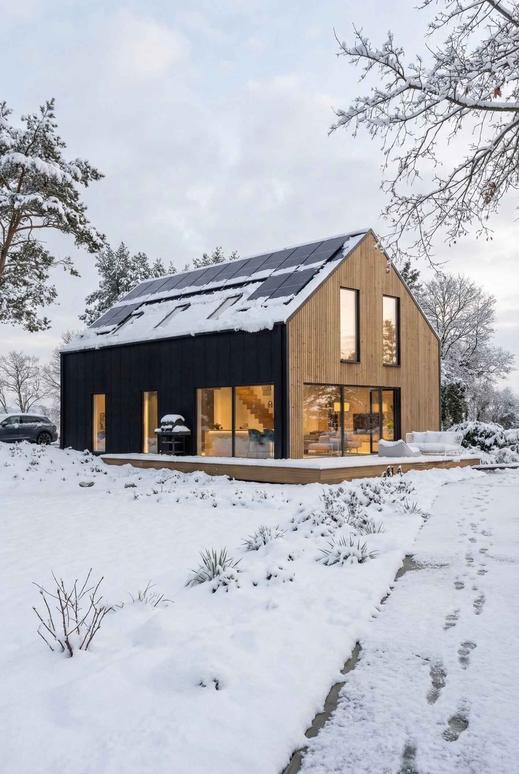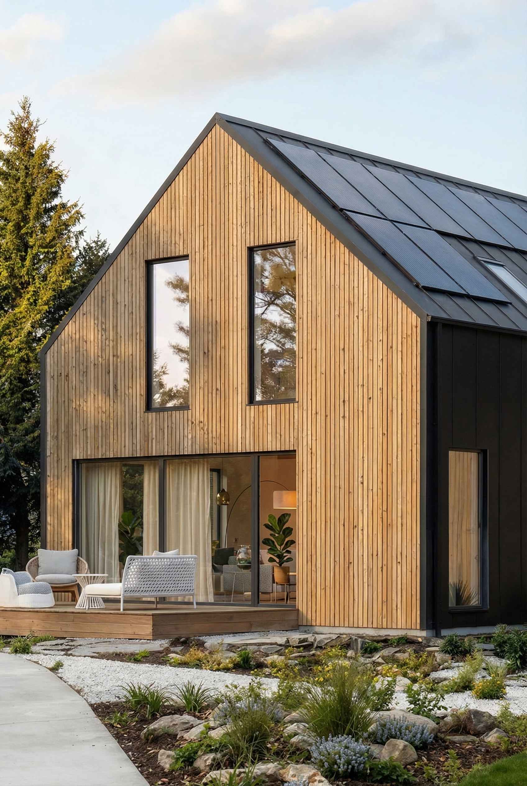 Bryła pozostaje prosta i czytelna — dwuspadowy dach, zwarte proporcje i oszczędna forma, która dobrze wpisuje się w kontekst współczesnej architektury jednorodzinnej. Kluczową rolę odgrywa tu jednak nie tylko estetyka, ale technologia: konstrukcja modułowa pozwala przenieść większość procesu budowy do fabryki, co przekłada się na krótszy czas realizacji i większą kontrolę jakości.