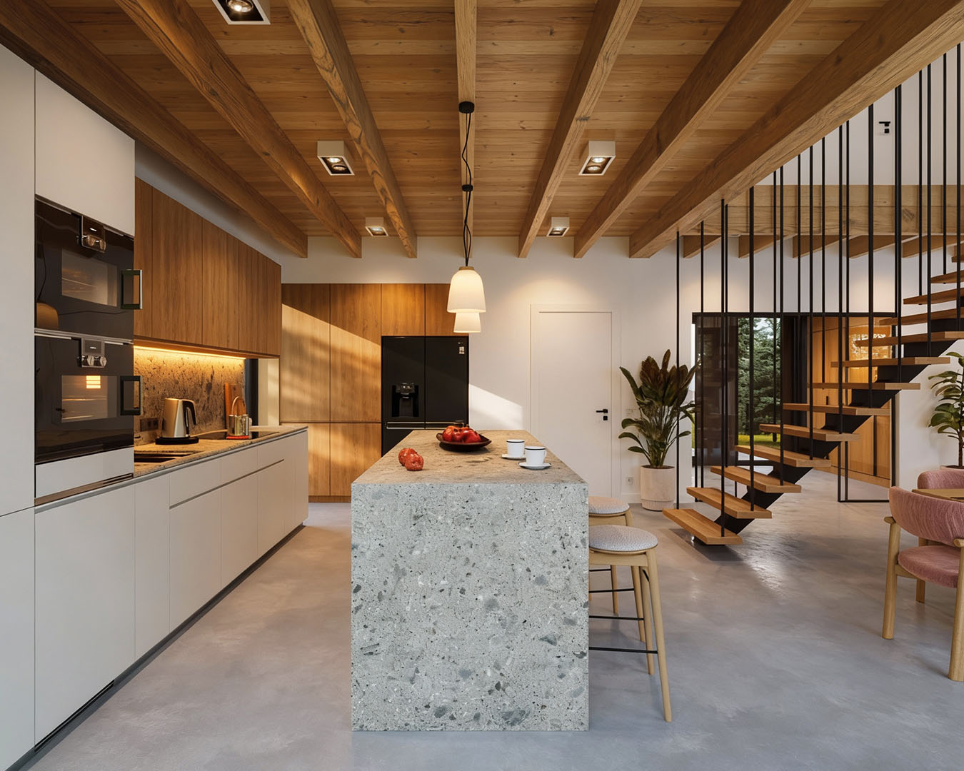 Dom zaprojektowano jako energooszczędny — z pompą ciepła, wentylacją mechaniczną z rekuperacją i dobrymi parametrami izolacyjnymi przegród. To rozwiązanie, które nie tylko upraszcza użytkowanie, ale realnie ogranicza koszty eksploatacji w dłuższej perspektywie.
