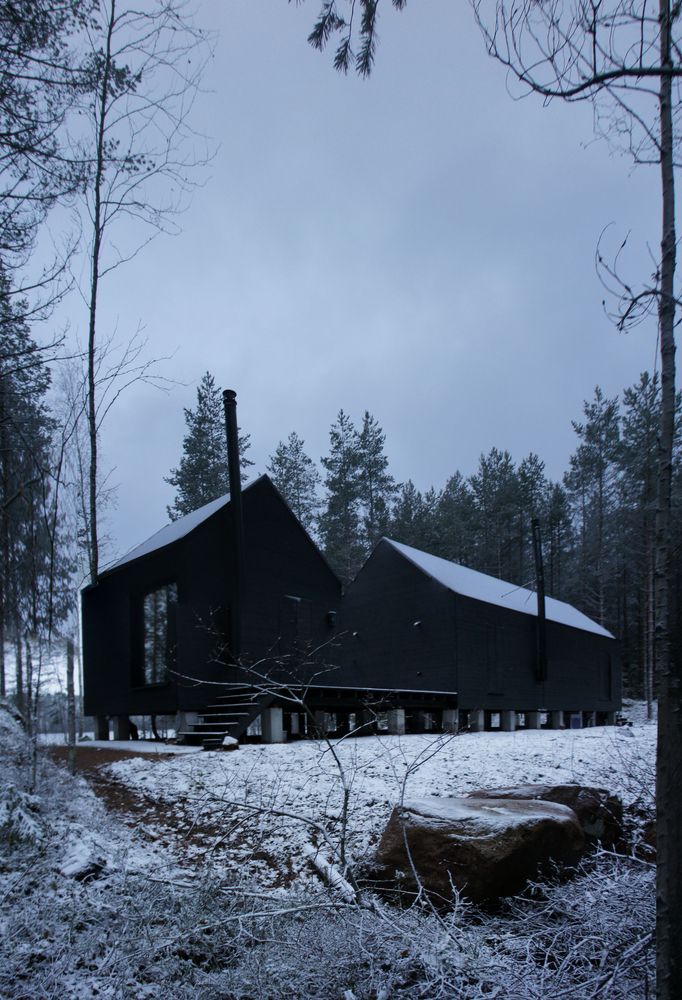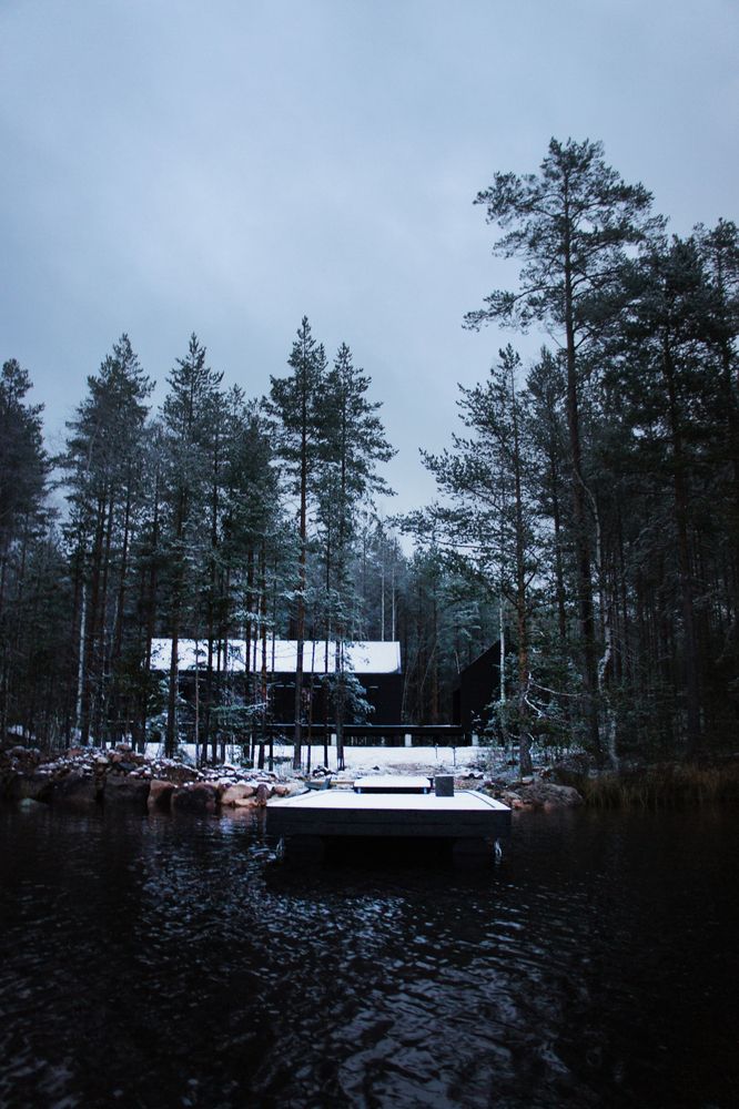 Fińskie słowo Mökki oznacza niewielki, wiejski domek nad jeziorem, będący symbolem prostoty, ciszy i życia blisko natury. Mökki Santara, położony w sercu Karelii, z dala od cywilizacji i po wielogodzinnej podróży z Helsinek, doskonale wpisuje się w tę tradycję. Domek stanowi miejsce odpoczynku od miejskiego rytmu, pozbawione zbędnych luksusów, a jednocześnie głęboko zakorzenione w krajobrazie lasów i jezior. Zgodnie z tradycyjną koncepcją przestrzenną, funkcje mieszkalne zostały oddzielone od strefy mycia i sprzątania, tworząc dwa osobne budynki osadzone na wspólnej, lekko podniesionej platformie. Całość otwiera się na południowy zachód, oferując spektakularne widoki na jezioro Santara i wpisując się w ideę prostej, współczesnej formy, jaką może przyjmować nowoczesna stodoła w północnym krajobrazie.