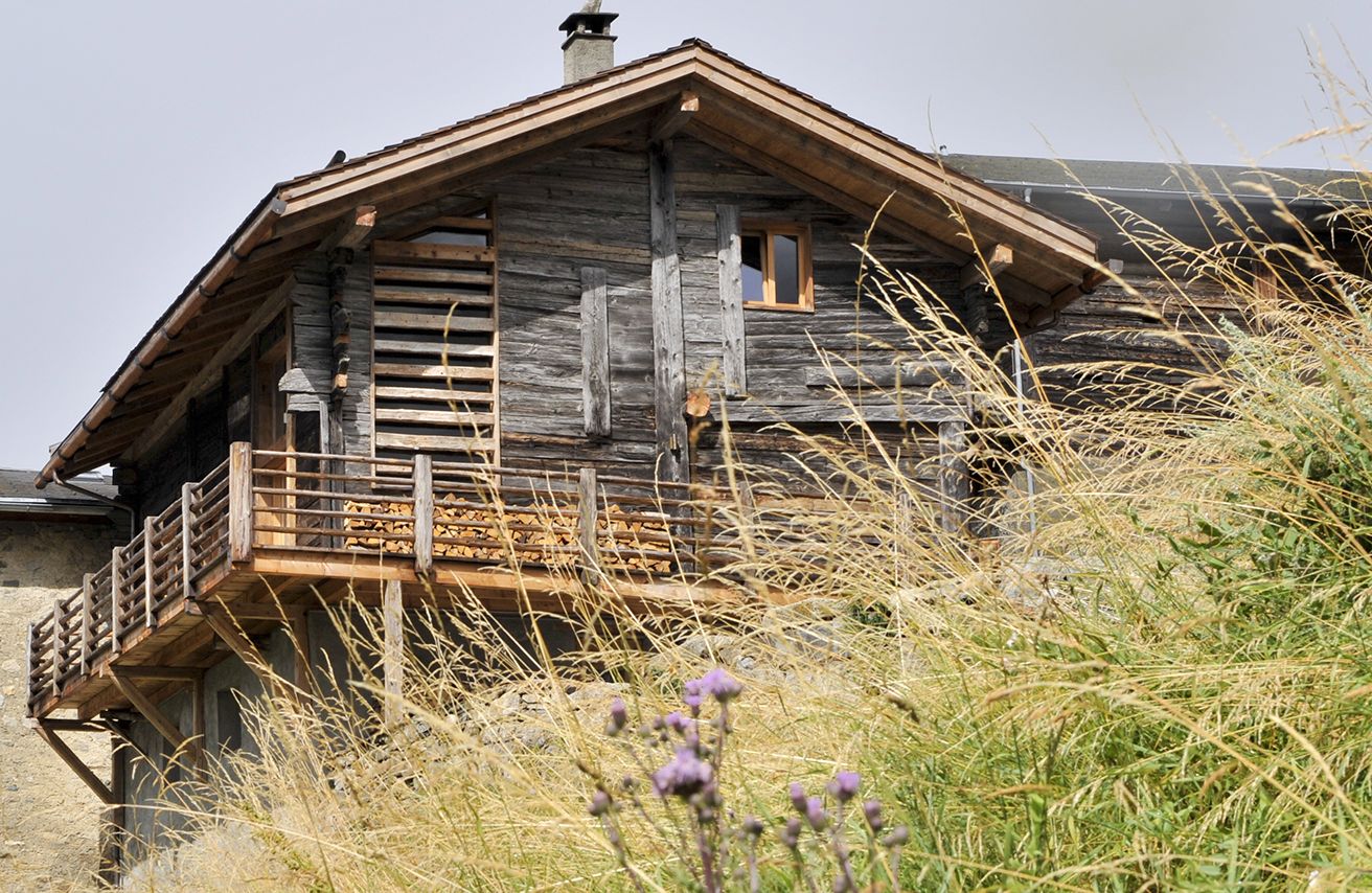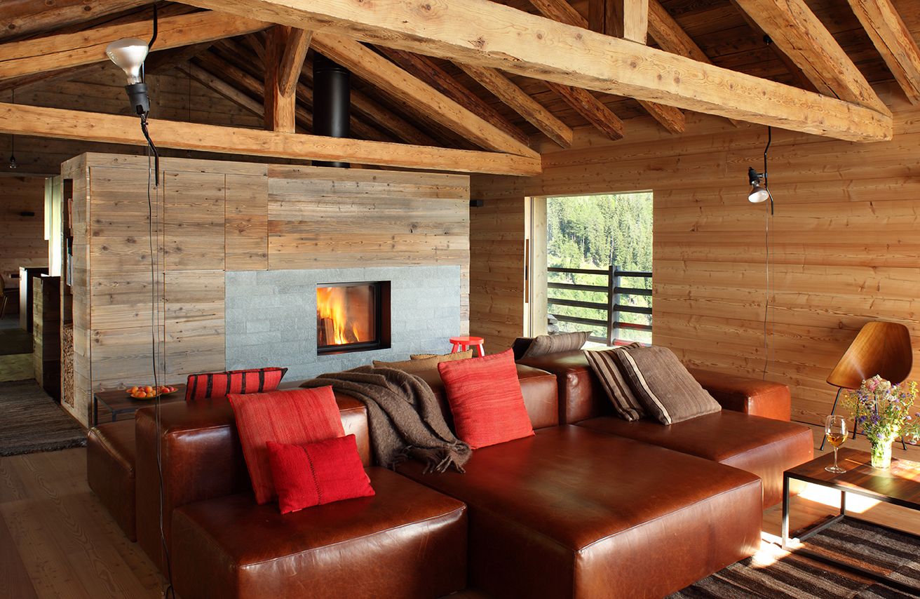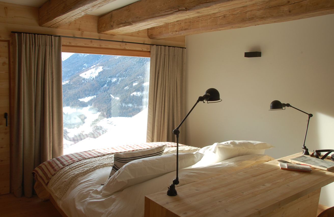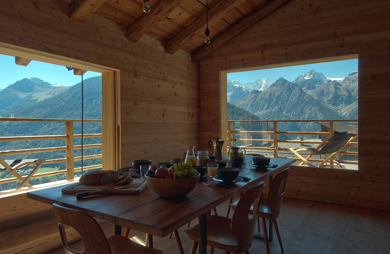 Z oryginalnych budynków zachowano kamień i drewno, uzupełniając je dużymi, prostokątnymi przeszkleniami, które harmonijnie współgrają z tradycyjną konstrukcją. Specjalne nacięcia w drewnianych elementach pełnią funkcję wentylacyjną, filtrują światło i podkreślają strukturę materiału. Dzięki ogromnym oknom wnętrza otwierają się na łańcuch górski i dolinę, a przyroda niemal fizycznie wnika do środka. Wysoka jakość naturalnych materiałów, połączona z nowoczesnymi technologiami, energią słoneczną i kominkami o dużej zdolności rekuperacji, zapewnia niezależność energetyczną oraz komfort. Dawne stodoły zachowały swój autentyczny klimat, stając się jasnymi, spokojnymi i nowoczesnymi przestrzeniami idealnymi do wypoczynku.