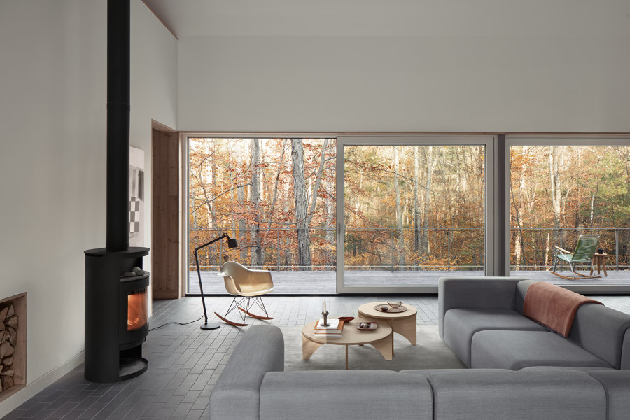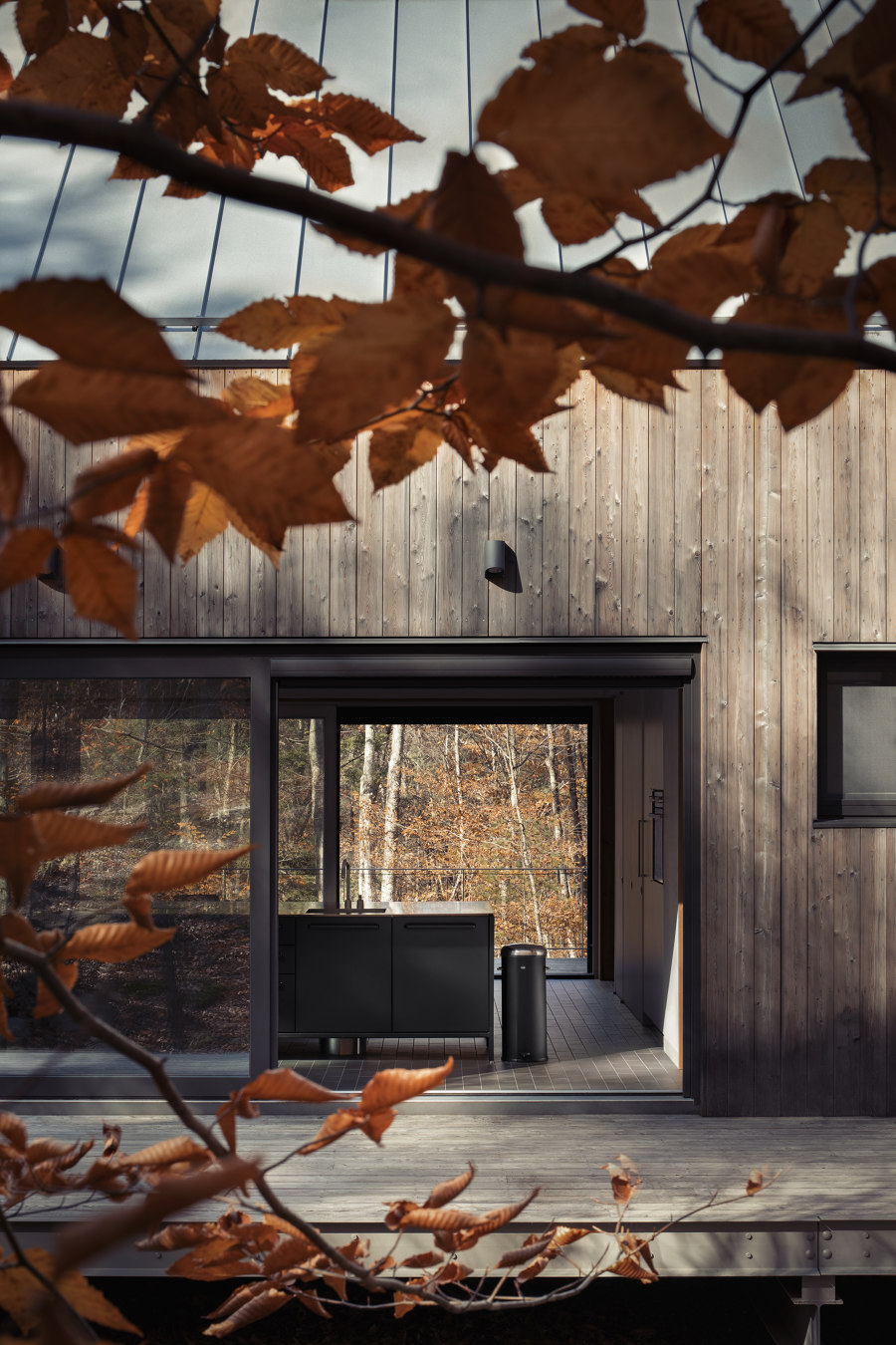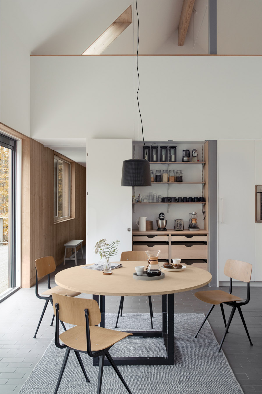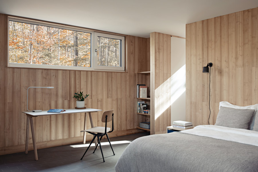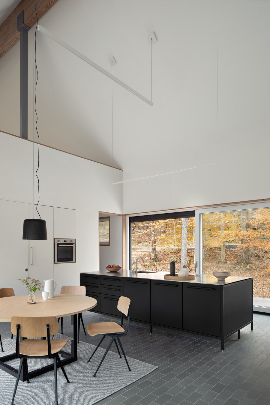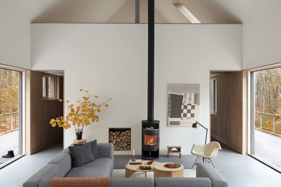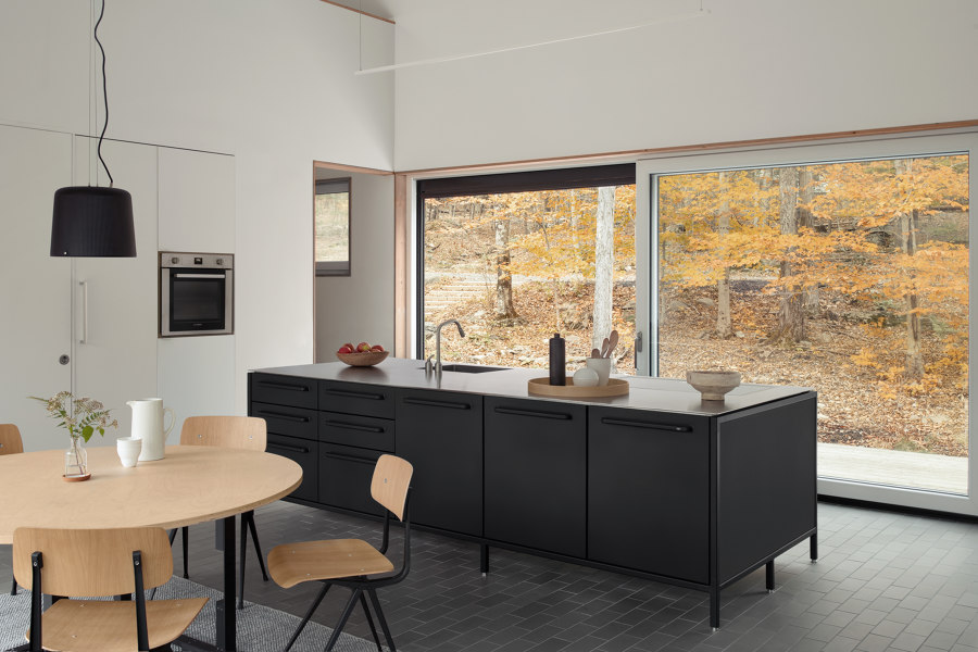 Maria i Todd zaprojektowali większość mebli i detali we wnętrzu, takich jak stół jadalniany, drewniane panele, zabudowy kuchenne, okiennice czy wbudowane szafy. Największą radość sprawiają im ogromne przesuwne okna, które pozwalają cieszyć się widokiem na drzewa i wpuszczają mnóstwo światła: „To niesamowite – możesz spojrzeć przez cały dom na otaczającą naturę,” mówi Todd.
