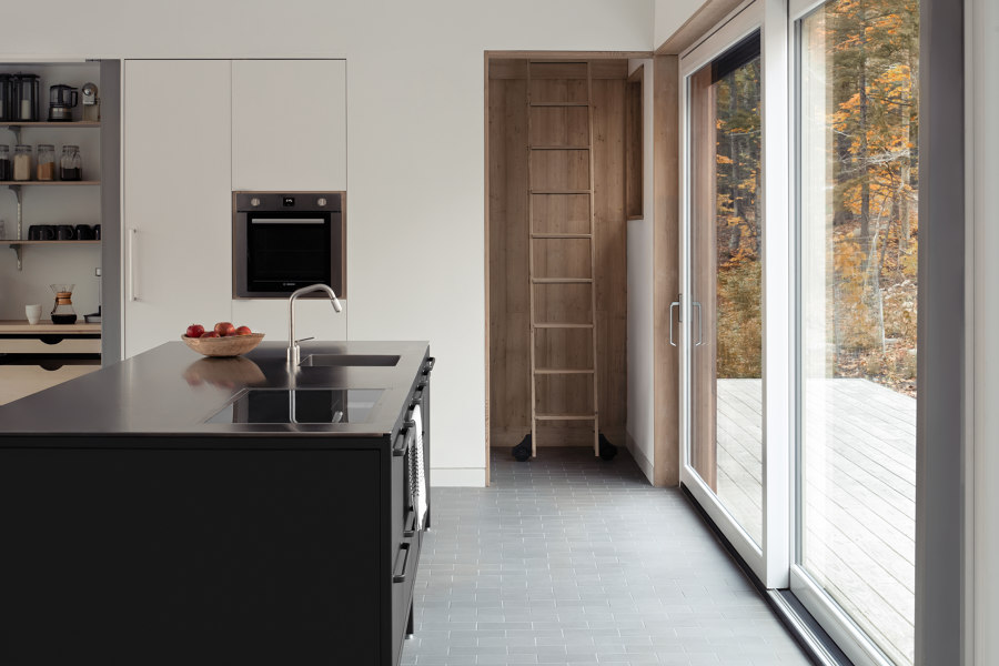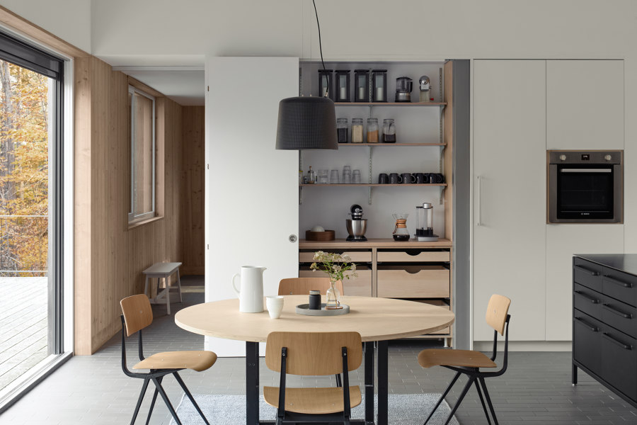 Otwarta przestrzeń dzienna wymagała starannego doboru kuchni, która nie zakłóciłaby harmonii wnętrza i nie zdominowała przestrzeni. Maria i Todd wybrali wolnostojącą kuchnię Vipp, która doskonale wpasowała się w styl ich pasywnego domu.