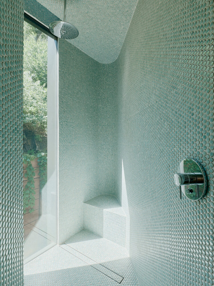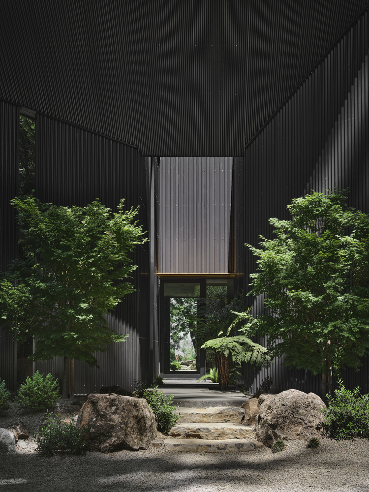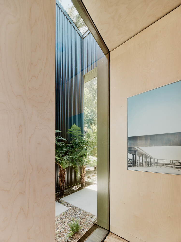 Z przodu domu znajdują się jedynie niewielkie otwory okienne, ukryte wśród paproci drzewiastych i klonów koralowych. Twarde linie architektury współgrają z pionowym ziarnem sekwoi, a otaczające łąki podkreślają relację z krajobrazem. Wchodząc na dziedziniec, odwiedzający natrafiają na daszek w kształcie litery „V” wznoszący się na 9 metrów, wskazujący na niebo. Przeszklone wejście prowadzi do salonu, gdzie gigantyczne okno sięga szczytu sekwoi, zatracając granicę między wnętrzem a lasem.