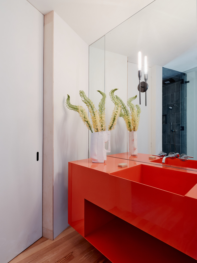 W całym domu zastosowano nietraktowaną sklejkę morską, która nadaje wnętrzom naturalny charakter i zbiera patynę codziennego użytkowania. Podłogi z odzyskanego klonu subtelnie kontrastują z jasnym drewnem ścian. Łazienki stanowią jedyny wyjątek w wykończeniu, gdzie zastosowano inne materiały. Daszki wejściowe w głębokim odcieniu żółci odbijają światło w ciągu dnia, a w deszczu rezonują jak kamerton, przypominając o znaczeniu wody.