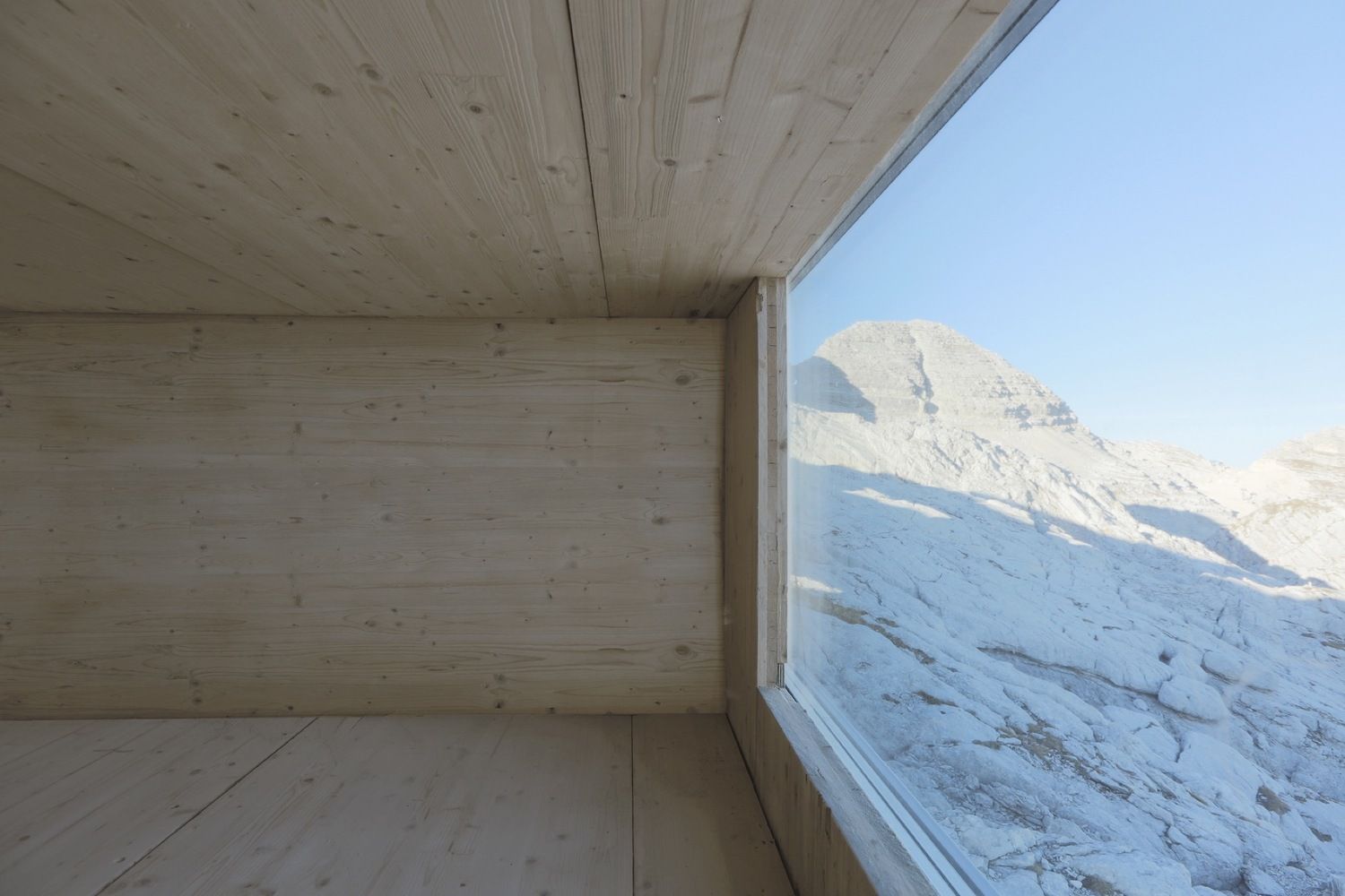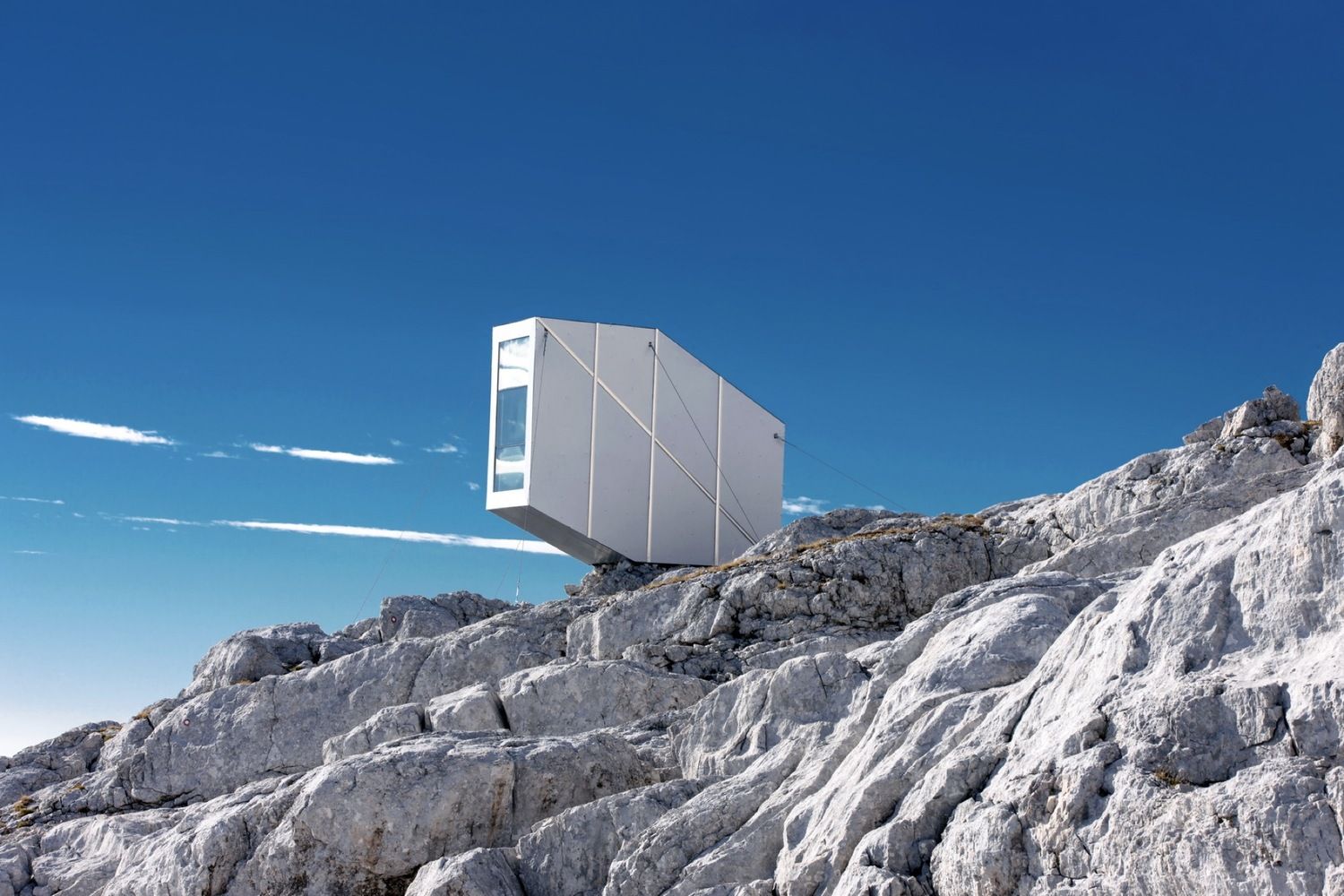 Kanin Winter Cabin to kompaktowy, drewniany obiekt oparty na trzech platformach, zawieszonych nad doliną i oferujących spektakularne panoramiczne widoki na Triglav, dolinę Soczy oraz Morze Adriatyckie. Bazowa część konstrukcji delikatnie opiera się na zboczu, zapewniając stabilność nawet przy kilkumetrowej pokrywie śnieżnej, która potrafi utrzymywać się tu ponad pół roku. Wnętrze schroniska jest minimalistyczne i maksymalnie funkcjonalne, oferując nocleg dla dziewięciu osób – wspinaczy, alpinistów, grotołazów i miłośników górskiej przyrody. Transport i montaż obiektu, realizowany przy wsparciu słoweńskiego wojska, wymagał kilku prób i ogromnej precyzji. Dziś schronisko stanowi wzorcowy przykład architektury wysokogórskiej, gdzie prostota formy, odporność konstrukcji i idea nowoczesnej stodoły spotykają się w najbardziej surowych warunkach naturalnych.