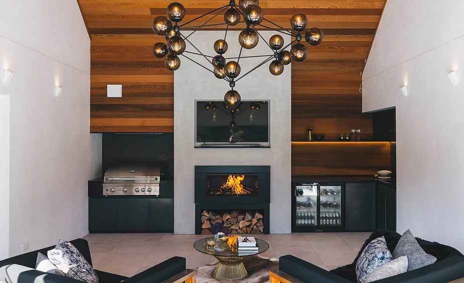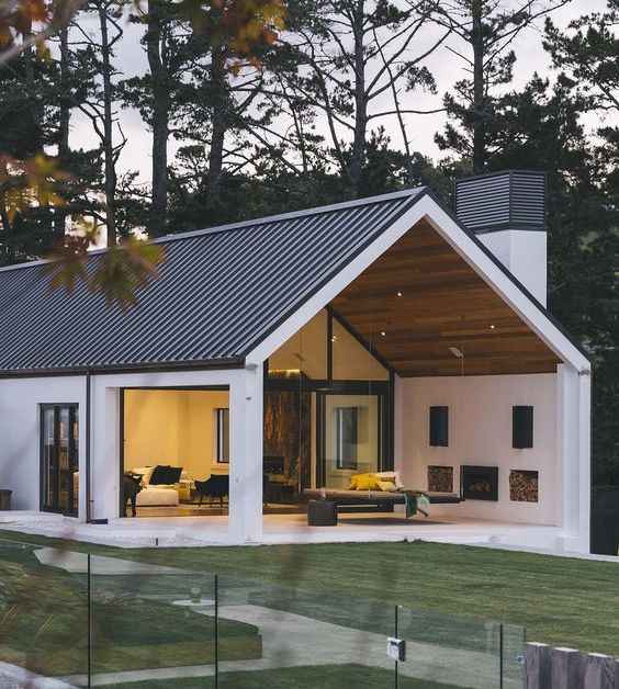 Od strony basenu rezydencja prezentuje się najbardziej efektownie, ukazując charakterystyczną formę, jaką przyjmuje nowoczesna stodoła – prostą, elegancką i pełną światła. Kontrast między drewnem cedrowym a gładkim, białym tynkiem na elewacji nadaje bryle lekkości i wyrafinowania, a dach z ciemnej blachy na rąbek dopełnia całości. To doskonały przykład, jak współczesna architektura potrafi połączyć minimalizm, luksus i naturalne materiały, tworząc przestrzeń, która inspiruje i zachwyca.