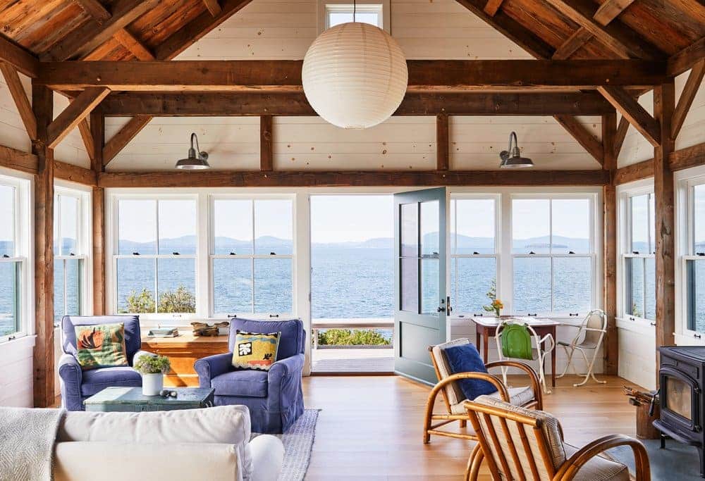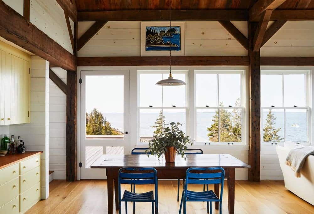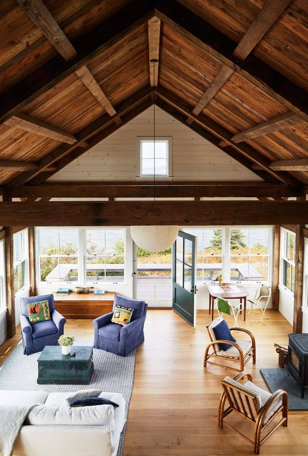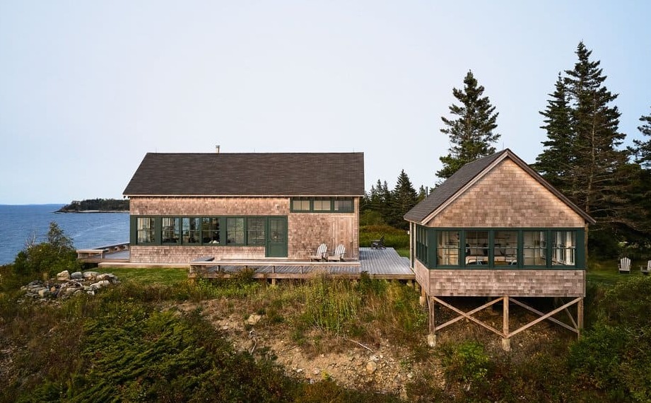 Wnętrza łączą w sobie utylitarny minimalizm i rustykalną prostotę, przywodząc na myśl klasyczną estetykę północnoamerykańskich domów wakacyjnych. Zastosowano tu naturalne materiały, takie jak drewno, kamień i stal, które podkreślają surowy krajobraz wyspy. Jasne, przestronne pomieszczenia zachęcają do odpoczynku, a duże przeszklenia zapewniają stały kontakt z otaczającą przyrodą. To nowoczesna stodoła w nadmorskim stylu – funkcjonalna, minimalistyczna, ale pełna ciepła i przytulności.