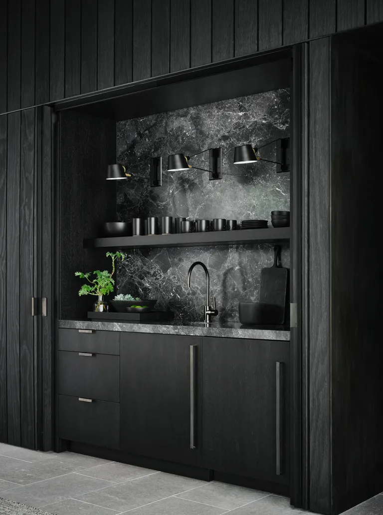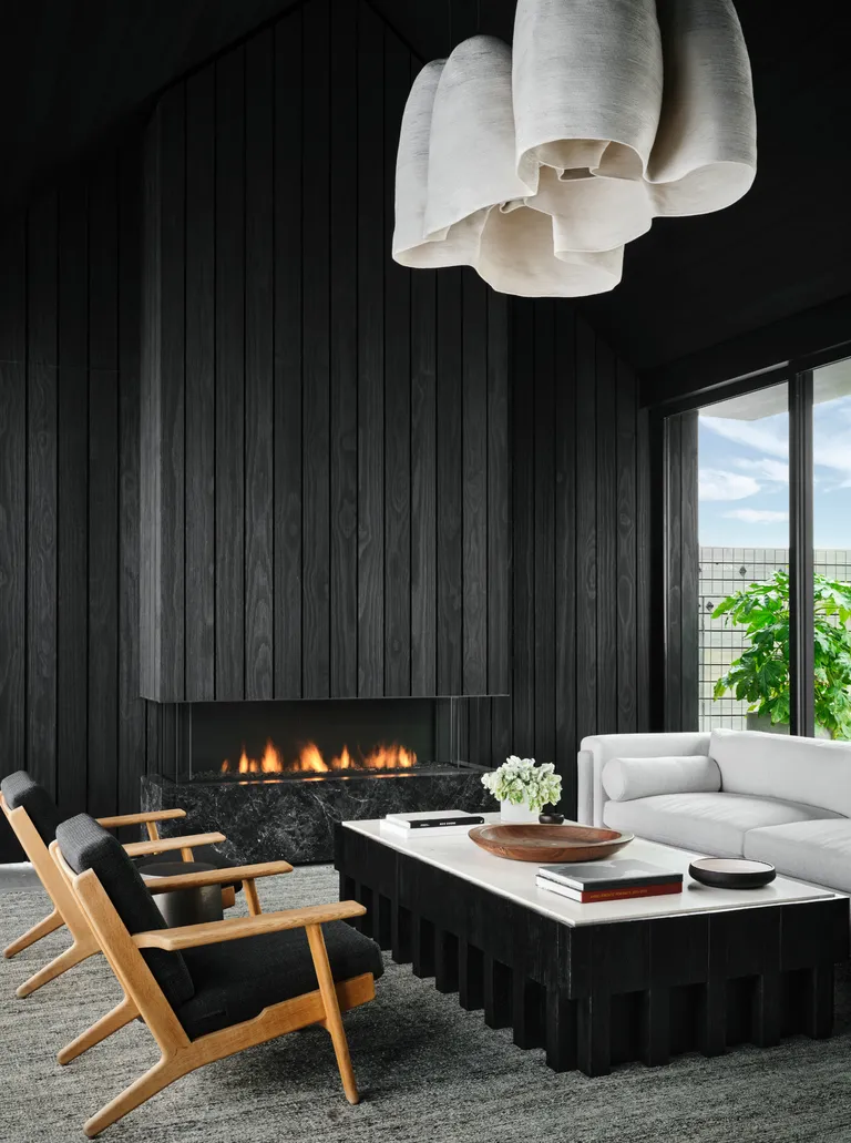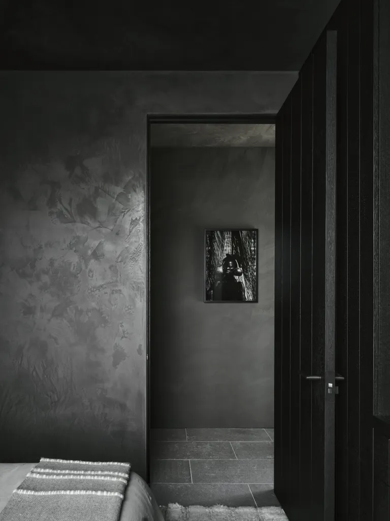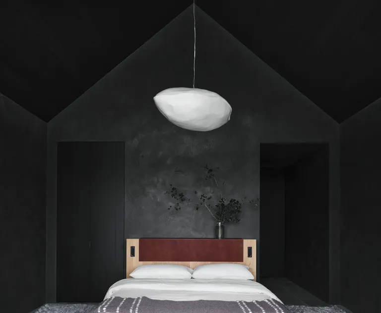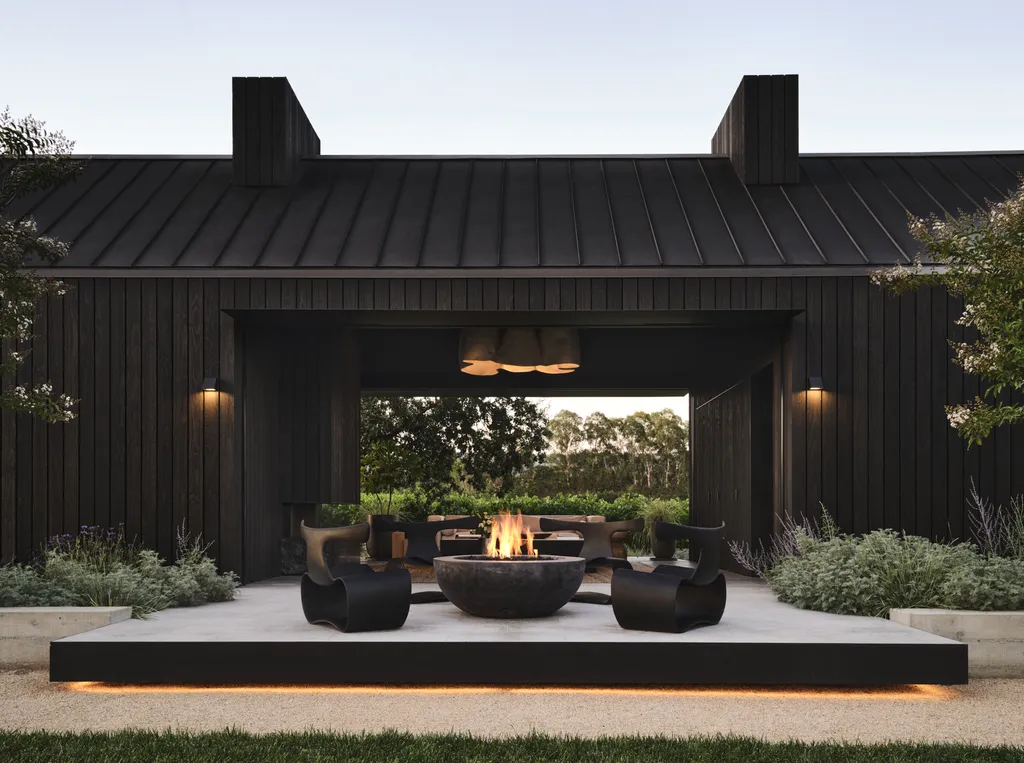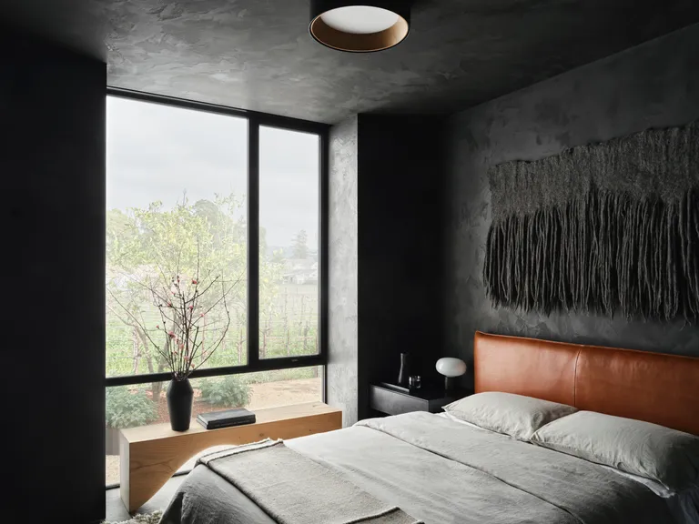 Projekt opiera się na wyraźnych liniach architektonicznych i organicznej palecie materiałów, które nadają przestrzeni unikalny, wyrafinowany charakter. Elewacje z drewna Shou Sugi Ban i ciemnego integralnego tynku doskonale harmonizują z naturalnym otoczeniem Napa Valley. Dzięki temu pensjonat wpisuje się w ideę nowoczesnej stodoły, łącząc estetykę z funkcjonalnością.