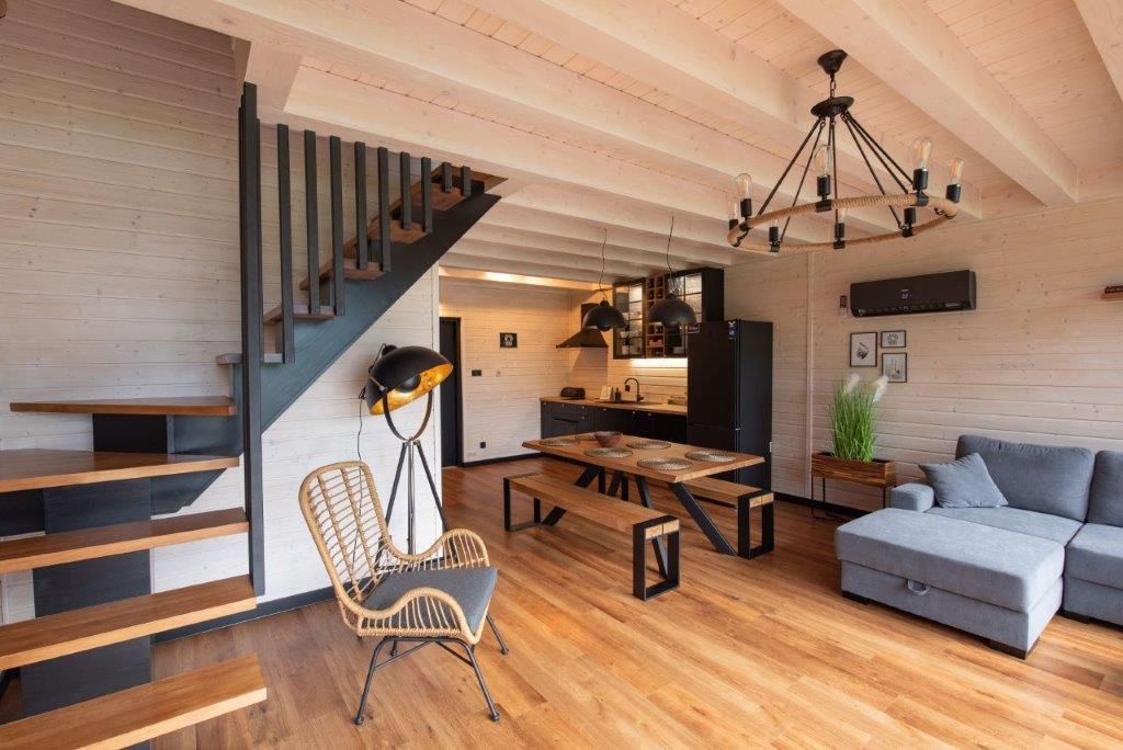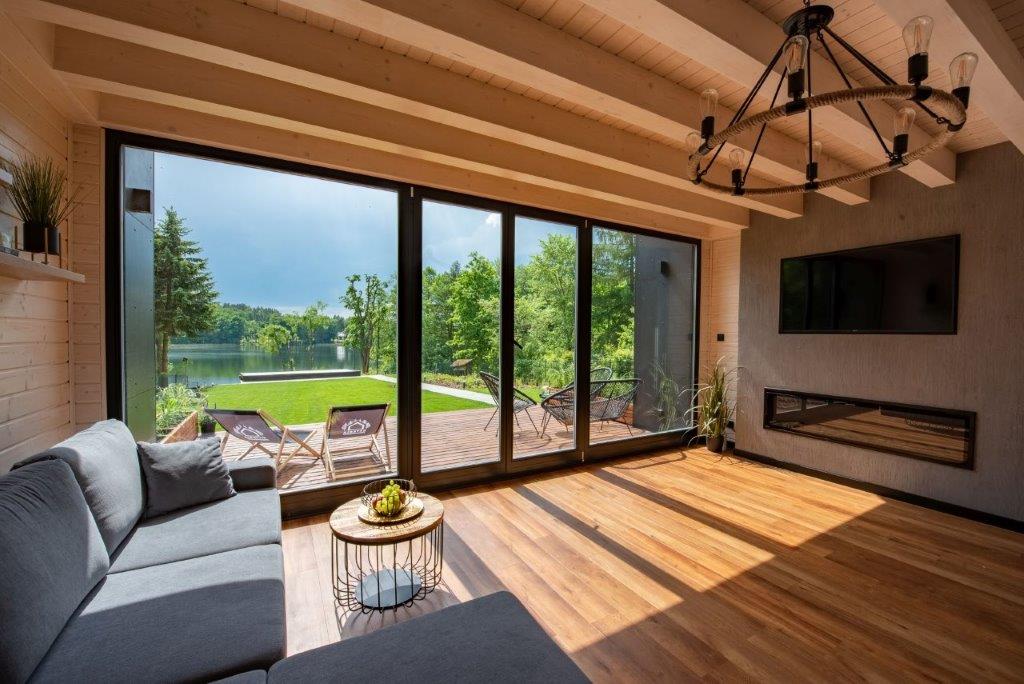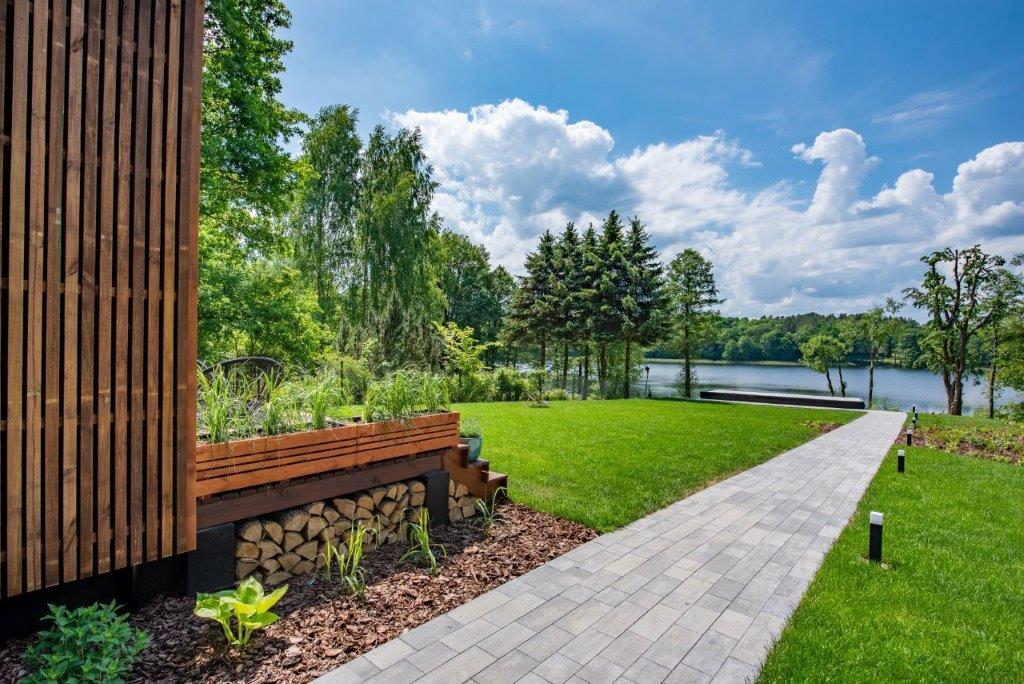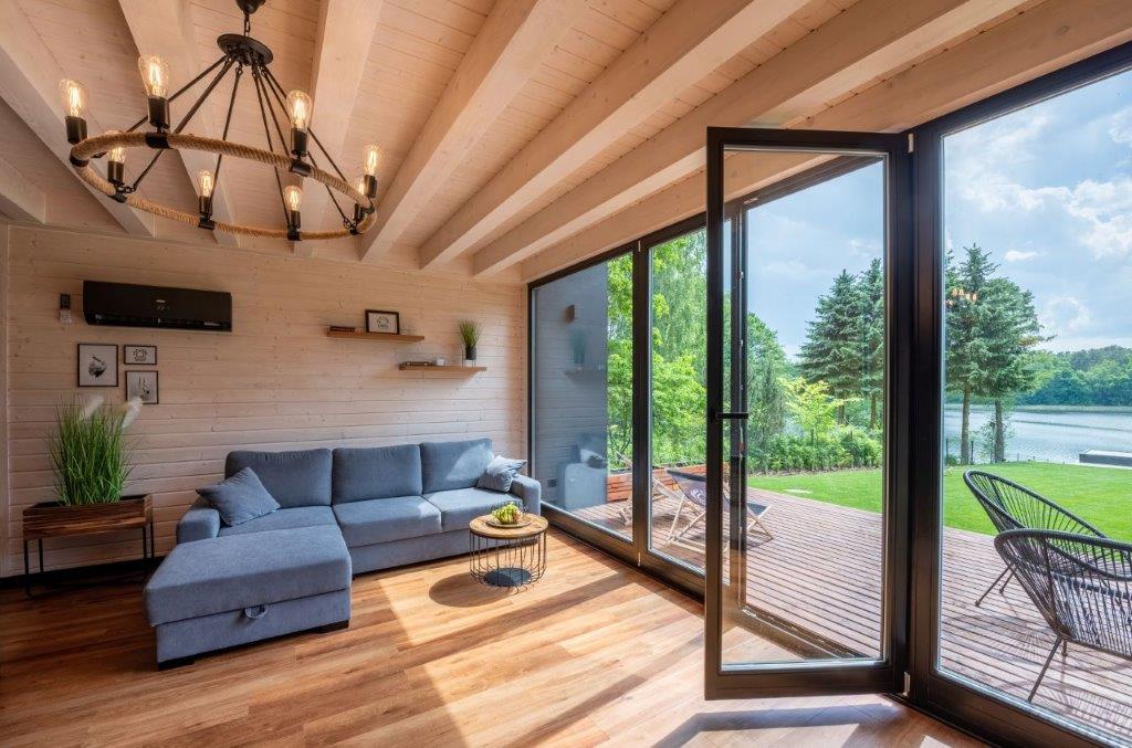 Inwestor spod Olsztyna na swojej niewielkiej działce nad jeziorem chciał odejść od chaotycznej zabudowy warmińskiej miejscowości i stworzyć nowoczesne siedlisko, w którym on czy jego goście będą mogli wypocząć. Jednocześnie zależało mu na czasie i nie chciał przechodzić wielomiesięcznego procesu z architektem. Zdecydował się na nietypowe rozwiązanie – ok. 60-metrowy prefabrykowany dom drewniany w technologii szkieletowej, którego budowa zajęła wyspecjalizowanej firmie z Ostródy 8 tygodni.