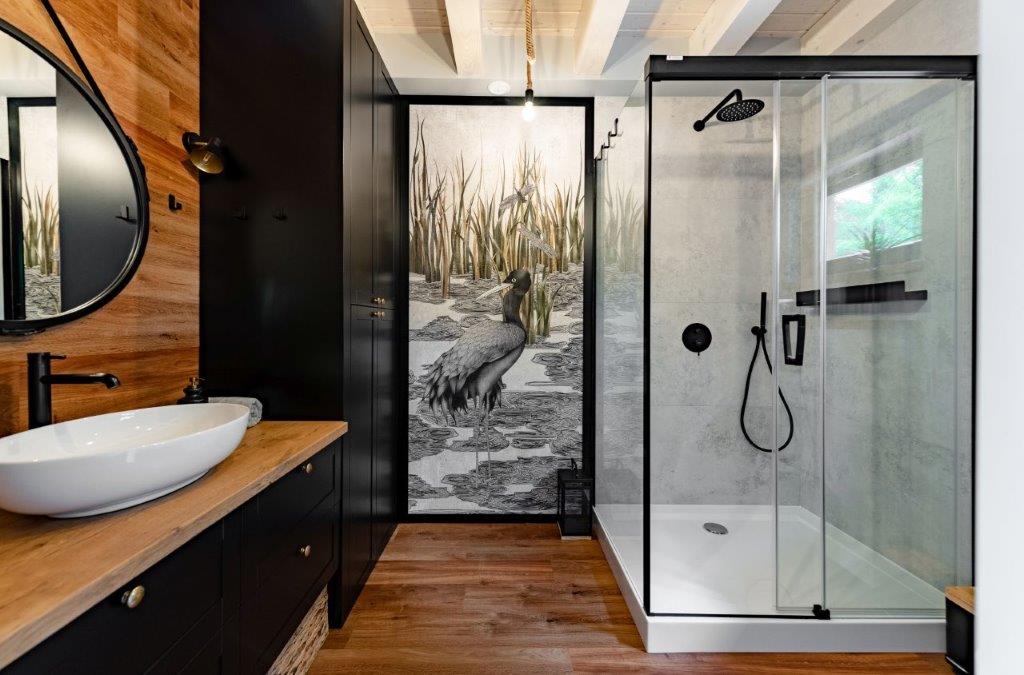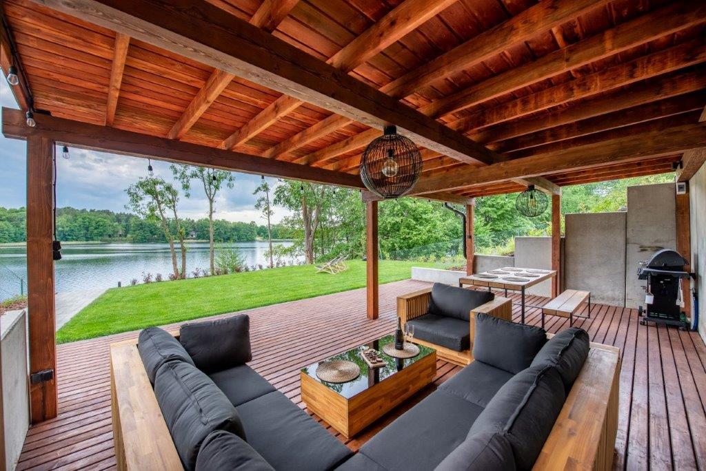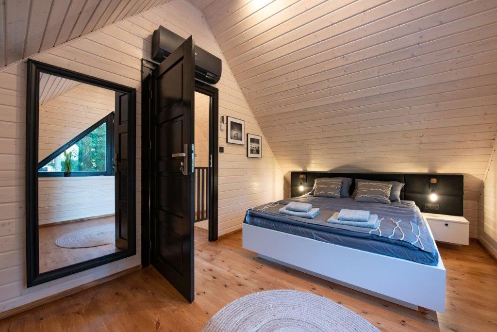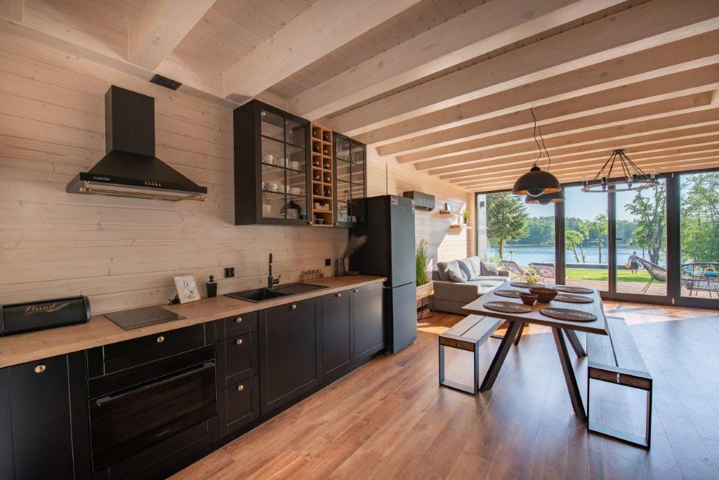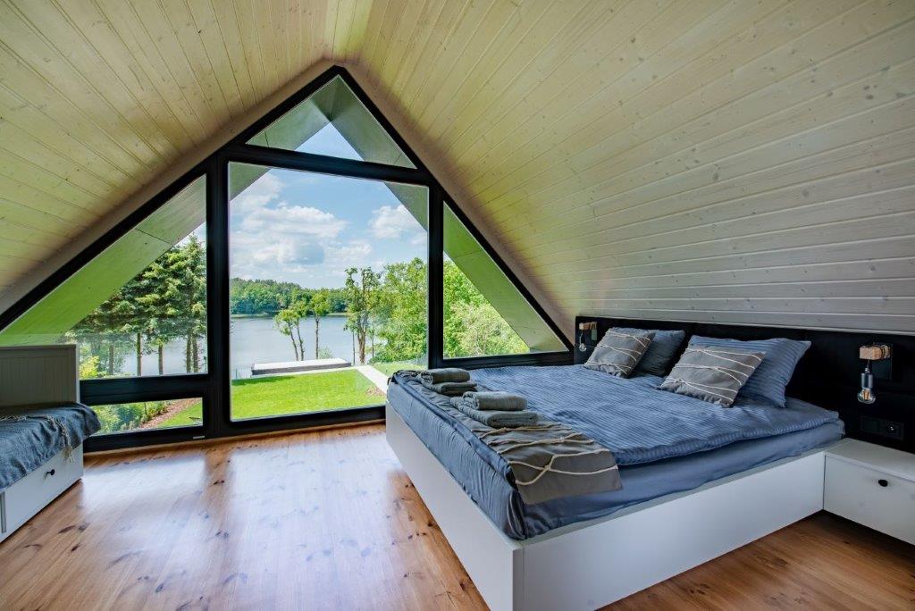 W tym czasie powstała bardzo funkcjonalna i gotowa do zamieszkania przestrzeń z podziałem na strefę dzienną na parterze i sypialnie na piętrze. Na niewielkiej powierzchni piętra znalazło się miejsce na aż trzy sypialnie, co świetnie sprawdza się zarówno w wykorzystaniu rekreacyjnym, jak i na co dzień. Wysoki standard drewnianych wykończeń jest w harmonii z widokiem na jezioro i las, jaki rozpościera się z zajmujących całą ścianę domu dużych przeszkleń. To rozwiązanie sprawia, że nowoczesna stodoła idealnie wtapia się w przestrzeń, a drewniany, niski taras tuż nad wodą pogłębia to wrażenie. Zachowano charakterystyczny dla projektów typu dom-stodoła podział na przeszkloną elewację w strefie relaksu na tyłach domu i zabudowaną od frontu. Od strony drogi przechodnie mogą więc zobaczyć tylko zwartą, drewnianą elewację, a mieszkańcy mają dzięki temu pełną prywatność. Wewnątrz zadbano o komfortowe rozwiązania takie jak klimatyzacja czy ogrzewanie podłogowe, a sam dom jest energooszczędny. Nad jeziorem Świętajno powstała oaza spokoju, która już od kilku lat służy swoim mieszkańcom.