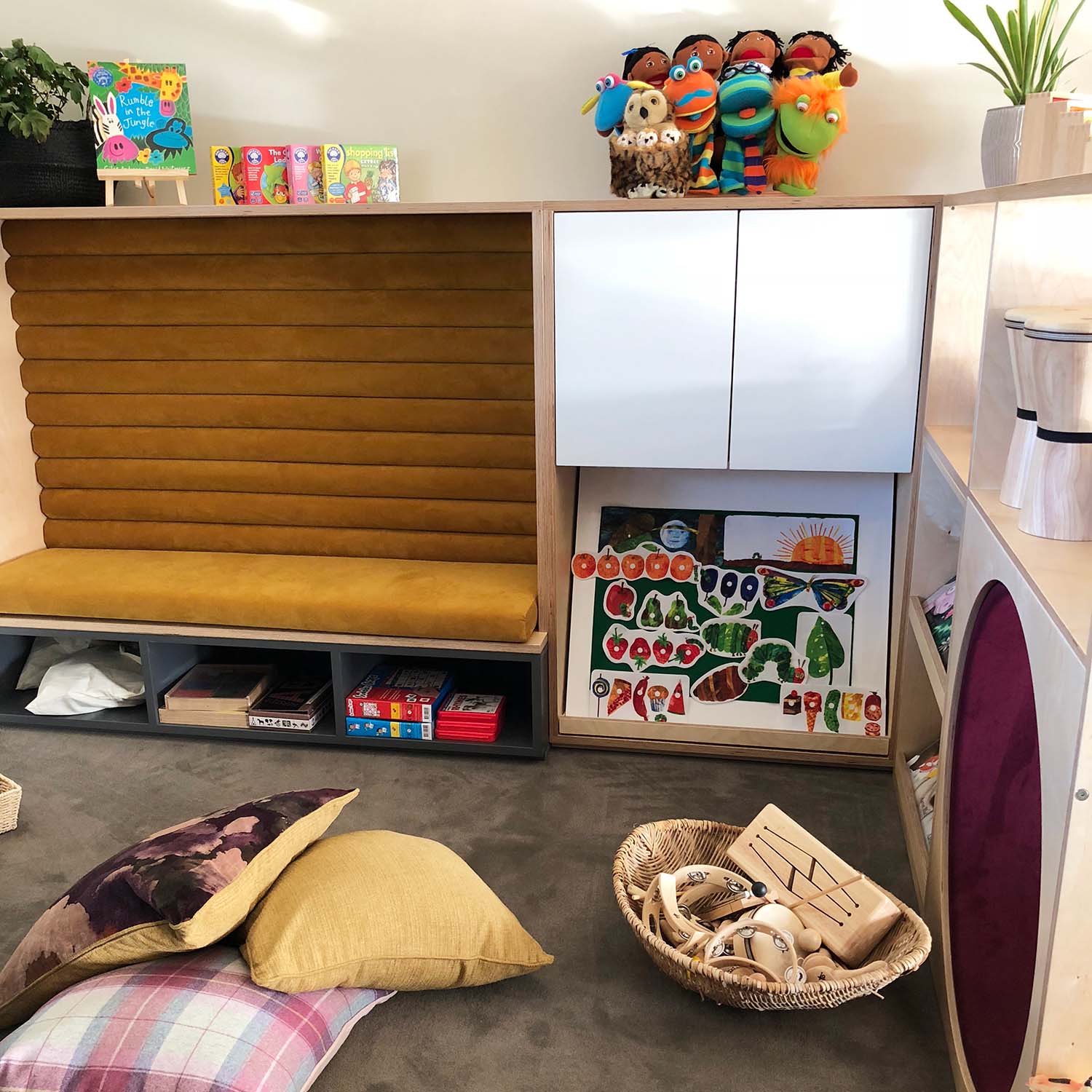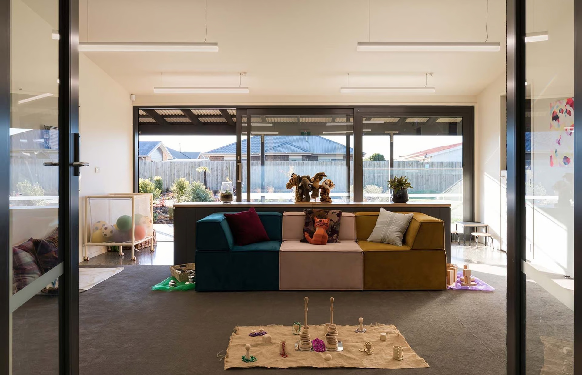 Centrum, zaprojektowane z myślą o 95 dzieciach w wieku od niemowląt do przedszkolaków, oferuje przestronne sale zabaw, które sprzyjają zarówno edukacji, jak i zabawie. Dzięki dużym przeszklonym ścianom, każde pomieszczenie ma silne połączenie z zewnętrznym placem zabaw, co pozwala dzieciom na interakcję z przyrodą i otoczeniem. Naturalne światło wpadające przez przeszklenia oraz odpowiednia wentylacja zapewniają zdrowe i komfortowe warunki do zabawy i nauki.