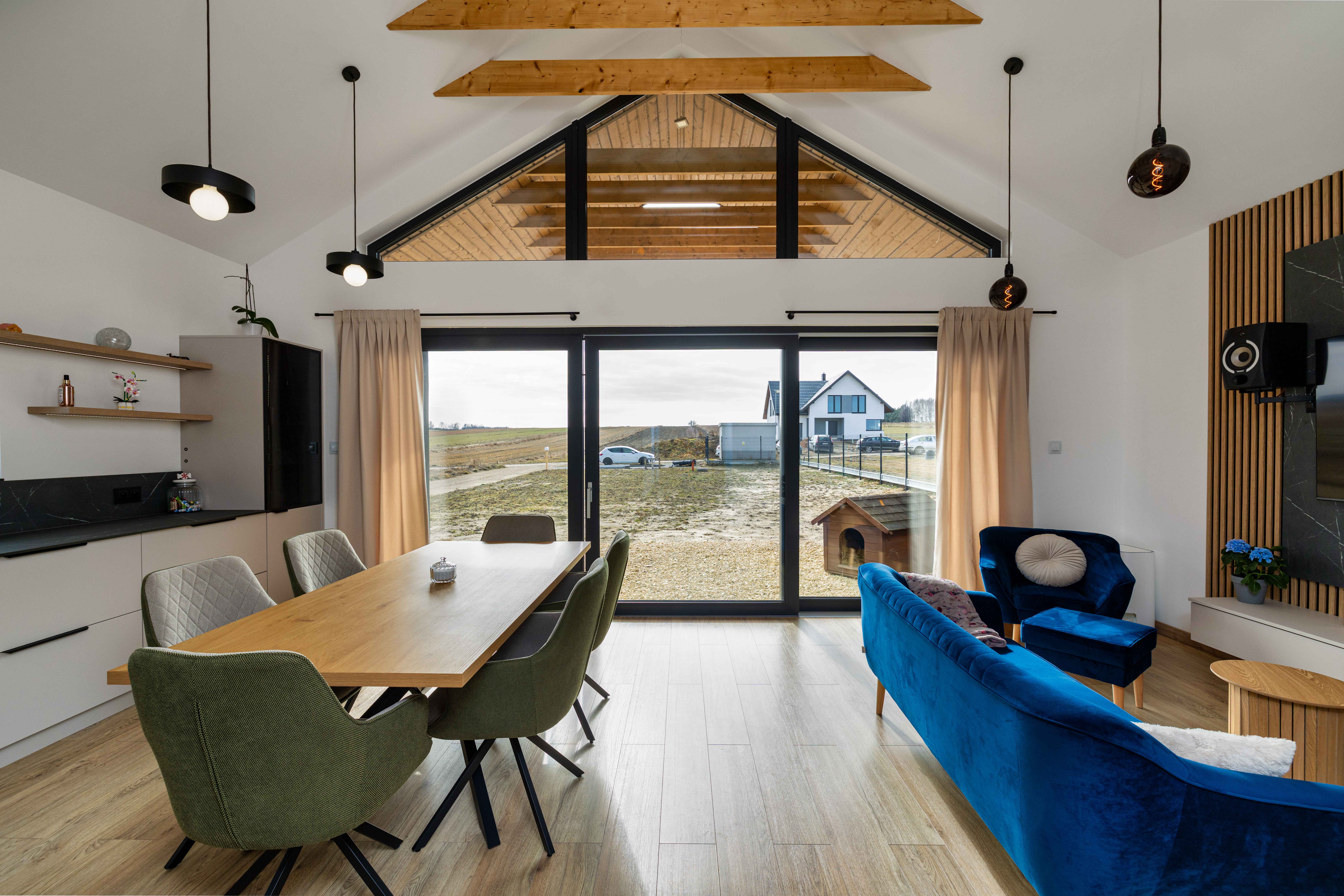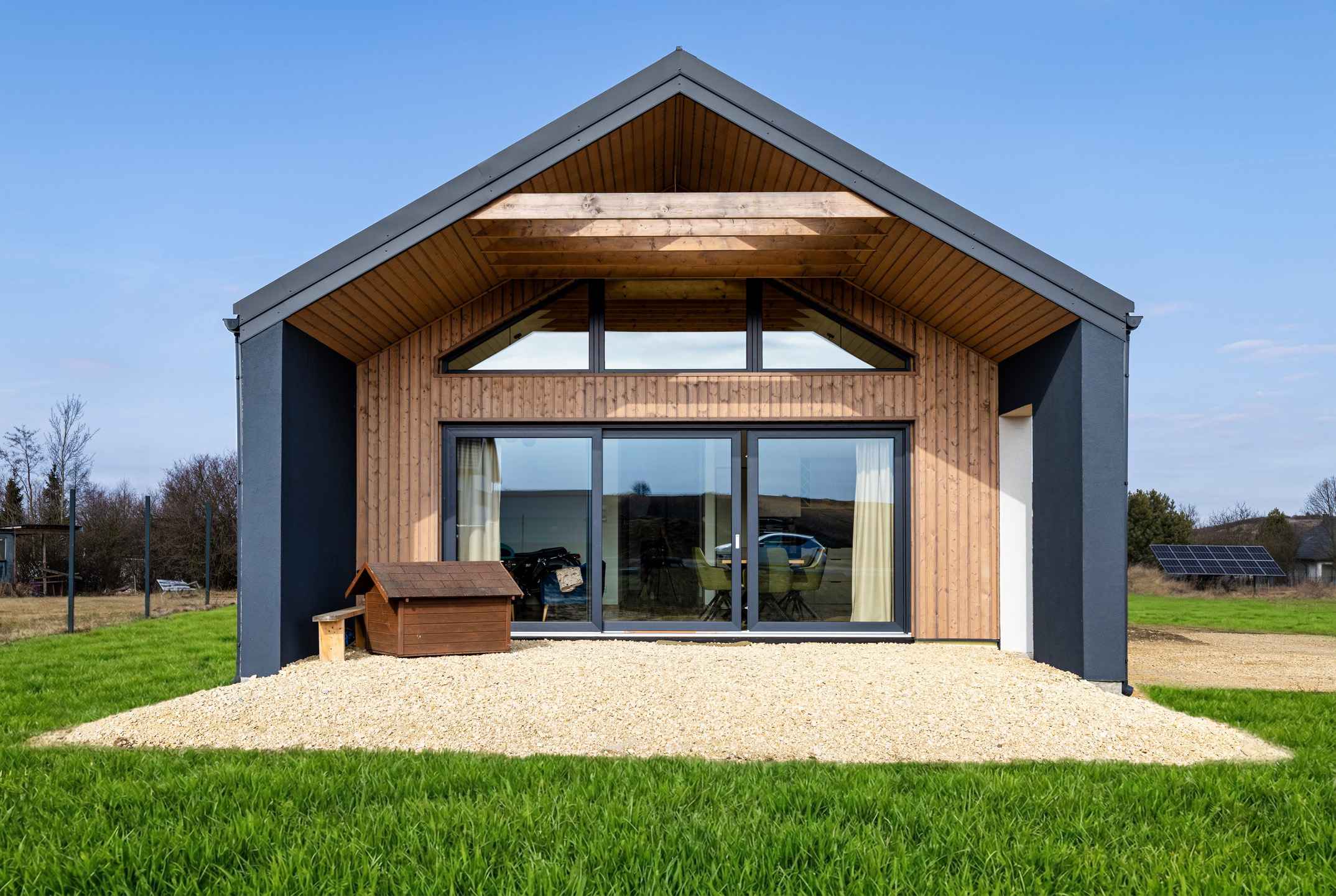 Budynek Nardos House w modelu NH80 to przykład architektury, w której prostota spotyka się z funkcjonalnością codziennego życia. Ten projekt doskonale wpisuje się w trend, jakim jest nowoczesna stodoła, łącząc tradycyjną formę z minimalistycznym podejściem do designu. Charakterystyczna nowoczesna bryła z dwuspadowym dachem oraz dużymi przeszkleniami sprawia, że dom świetnie komponuje się z otaczającym krajobrazem.
