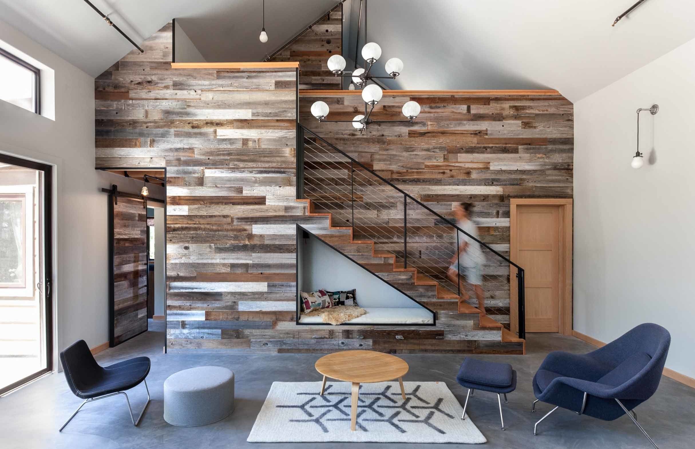 Zadaszone tarasy, idealne na umiarkowany klimat, odwołują się do lokalnej architektury. Tylna weranda może pełnić funkcję dodatkowej sypialni na ciepłe letnie noce. Wnętrze łączy wiejską prostotę z miejskim stylem loftowym. Salon o podwójnej wysokości nawiązuje do przestrzeni loftowych z Seattle, a deski wykończeniowe inspirowane są estetyką japońskiego wabi-sabi. Przytulny kącik do czytania pod schodami pozwala optymalnie wykorzystać przestrzeń.