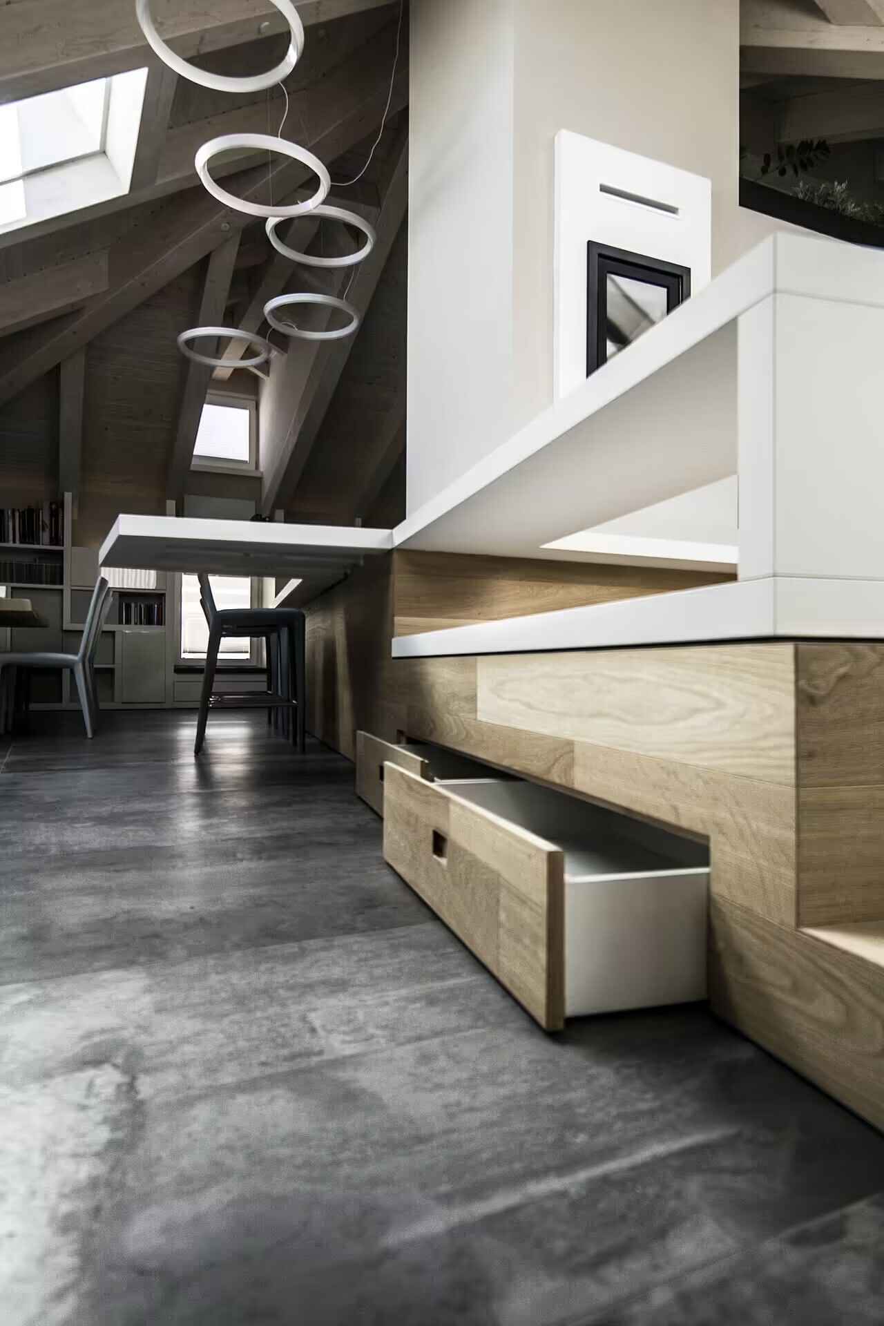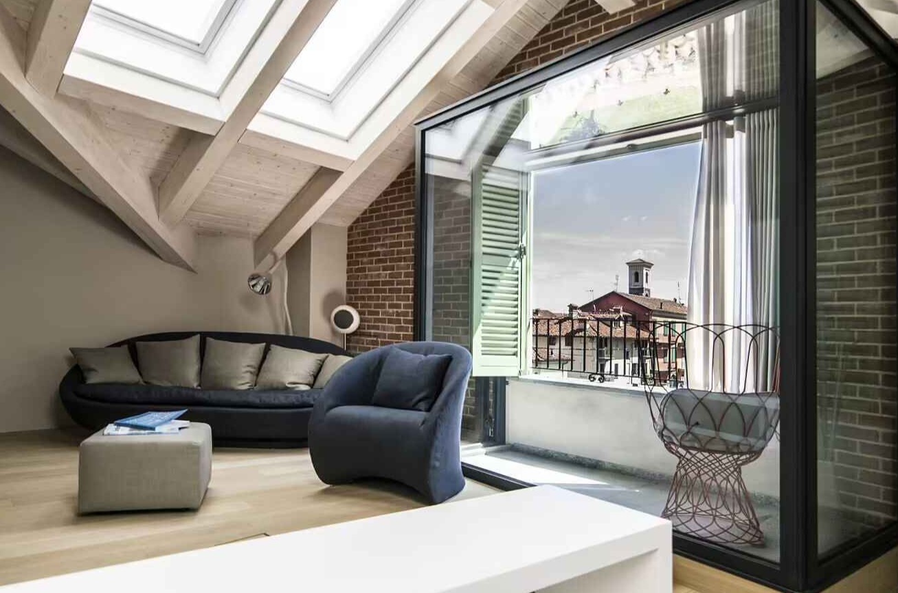W środku dominuje minimalistyczna elegancja i inteligentne rozwiązania przestrzenne. Kuchnia płynnie łączy się z salonem, a funkcje poszczególnych stref wyznaczają same meble. Na drewnianej antresoli znalazł się przytulny salon z małą loggią, która poprzez przeszklenie otwiera wnętrze na panoramę zabytkowego Fossano i pobliskie wzgórza. Transparentne i półprzejrzyste ściany wprowadzają lekkość, a nowoczesne detale współgrają z klasycznym charakterem budynku. Projekt Chiary Armando to przykład, jak architektura z duszą i nowoczesna stodoła mogą współistnieć w miejskim kontekście, tworząc przestrzeń pełną światła, drewna i spokoju.