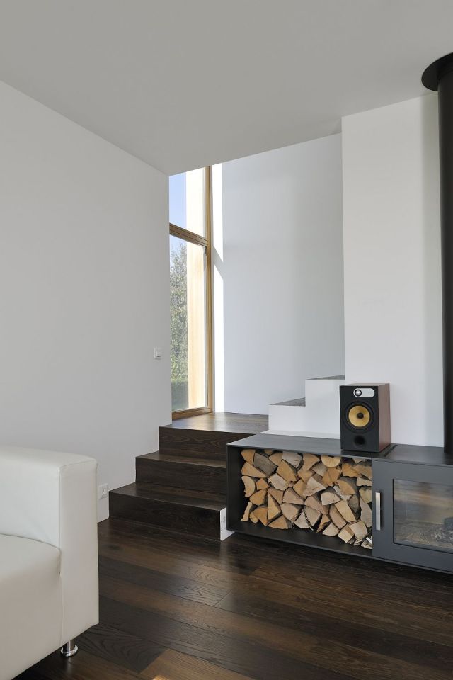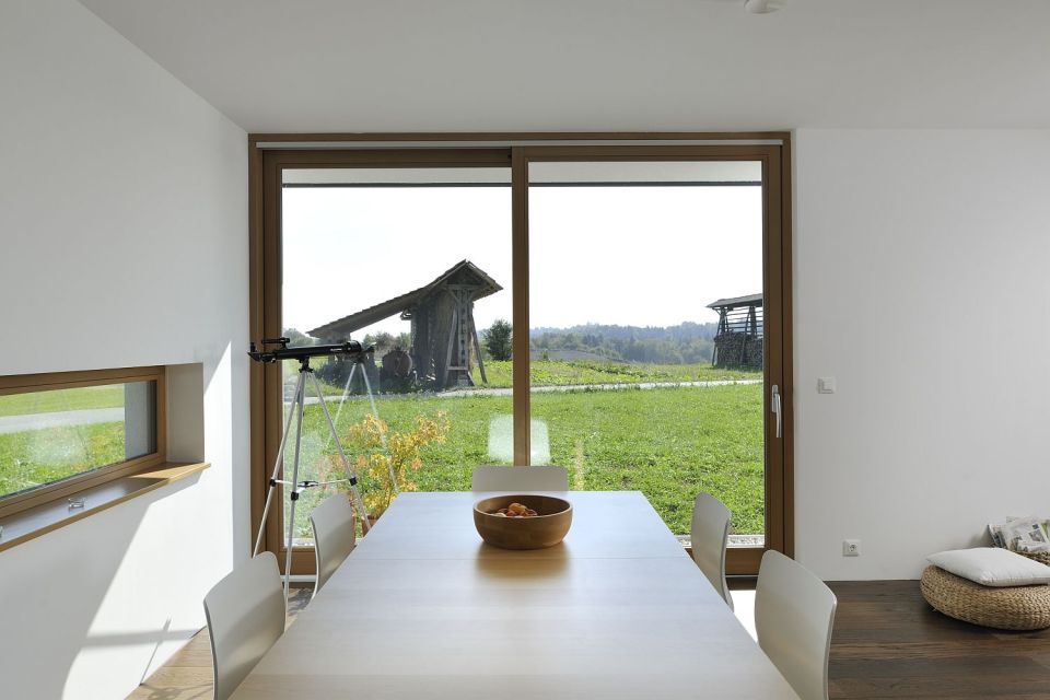 Dom młodego małżeństwa z córeczką, zaprojektowany przez architekta Mateja Gasperica w słoweńskiej wiosce, łączy ekonomię, ekologię i funkcjonalność. Budynek powstał jako niewielka, prefabrykowana konstrukcja o tradycyjnym dachu szczytowym i elewacji z naturalnych materiałów, która harmonijnie wpisuje się w otoczenie starszych domów. Wyższe piętro umożliwia przyszłe podzielenie pokoju córki na dwie mniejsze sypialnie, co daje elastyczność w przypadku powiększenia rodziny. Okna, mimo pozornego przypadkowego układu, zostały przemyślane tak, aby maksymalnie wykorzystać widoki i naturalne światło, zapewniając komfort w jadalni, łazience i przy schodach. Drzwi na patio od strony południowej wpuszczają do wnętrza ciepło zimowego słońca, a zadaszenie chroni przed przegrzaniem w lecie, a woda deszczowa z dachu jest zbierana do zbiornika 8 tysięcy litrów i wykorzystywana w toalecie oraz ogrodzie.