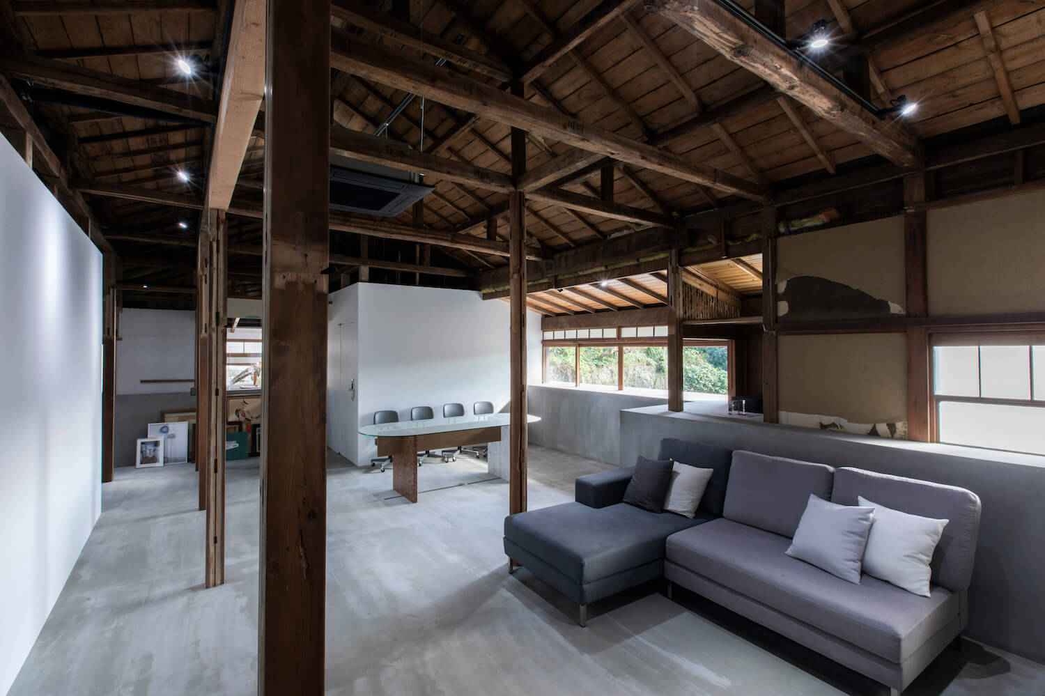 Ważnym aspektem projektu jest warstwowość przestrzeni – dolna część budynku została urządzona w minimalistycznym, nowoczesnym stylu z białą betonową ścianą, która funkcjonuje jako niezależny obiekt. Z kolei górna część domu pozostała niemal nienaruszona – z widocznymi konstrukcjami i izolacjami, tworząc wrażenie autentycznego minka. Kontrast pomiędzy starym i nowym, między surowym a luksusowym, oraz eksperymentalne podejście do materiałów i przestrzeni, czynią ten projekt architektoniczną opowieścią o współczesnej Japonii, widzianej przez pryzmat multidyscyplinarnego projektowania.