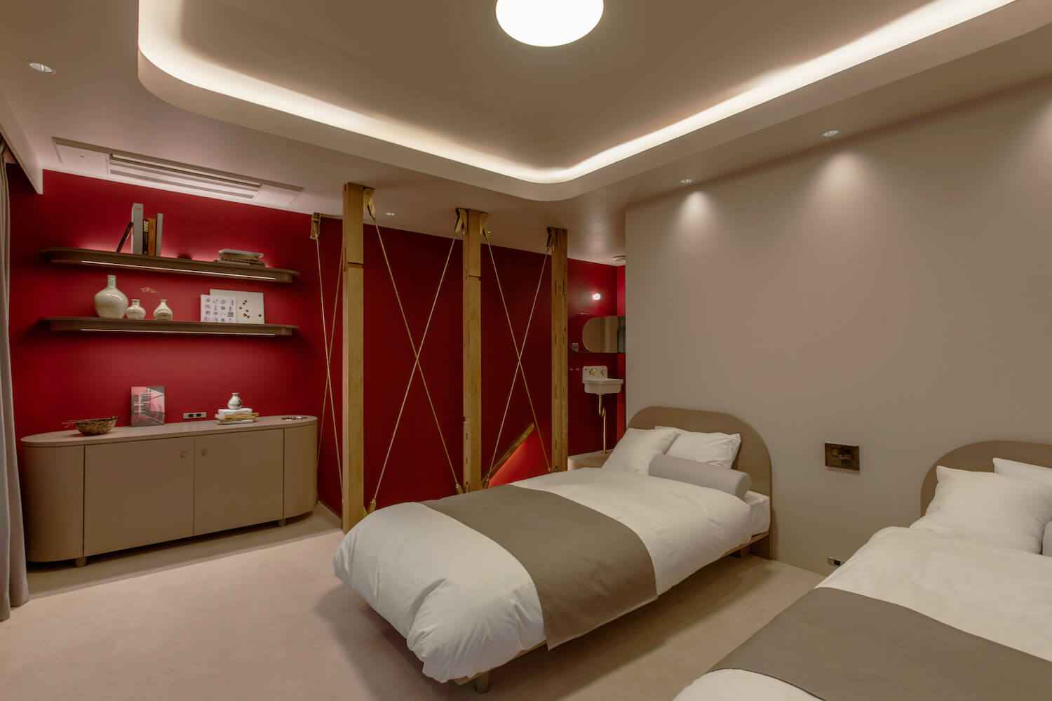 Projekt wyróżnia się nielogiczną, a jednocześnie artystyczną koncepcją – Kondo zdecydował się „wypełnić” dom zaprawą murarską, która oplata drewniane ściany i tworzy betonowy blok o szerokości 100 cm. Ten element silnie wpływa na tożsamość wnętrz i prowokuje gości do interakcji. Przestrzeń balansuje pomiędzy surowością a luksusem: półluksusowe pokoje gościnne, wbudowane półki, zaokrąglone meble i pozłacane detale kontrastują z rustykalną formą drewnianej bryły. Niektóre detale, jak poręcze o krzyżowej strukturze, nie wynikają z funkcji, lecz z czysto estetycznego rytmu, który nadaje przestrzeni dynamiczny charakter. Yutorie Atami House podważa normy architektoniczne i redefiniuje pojęcie renowacji.