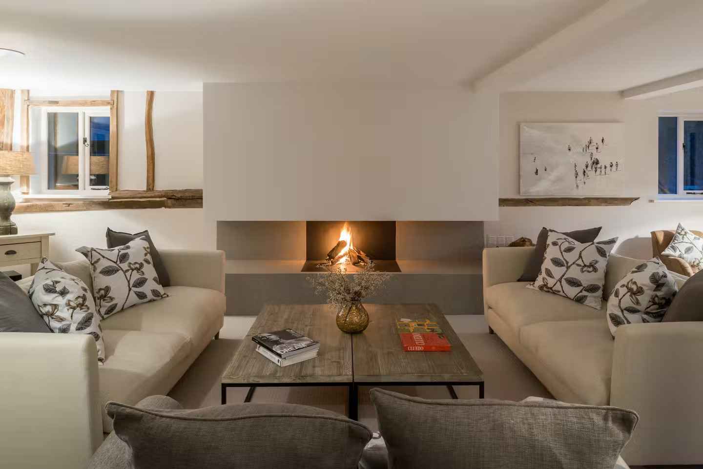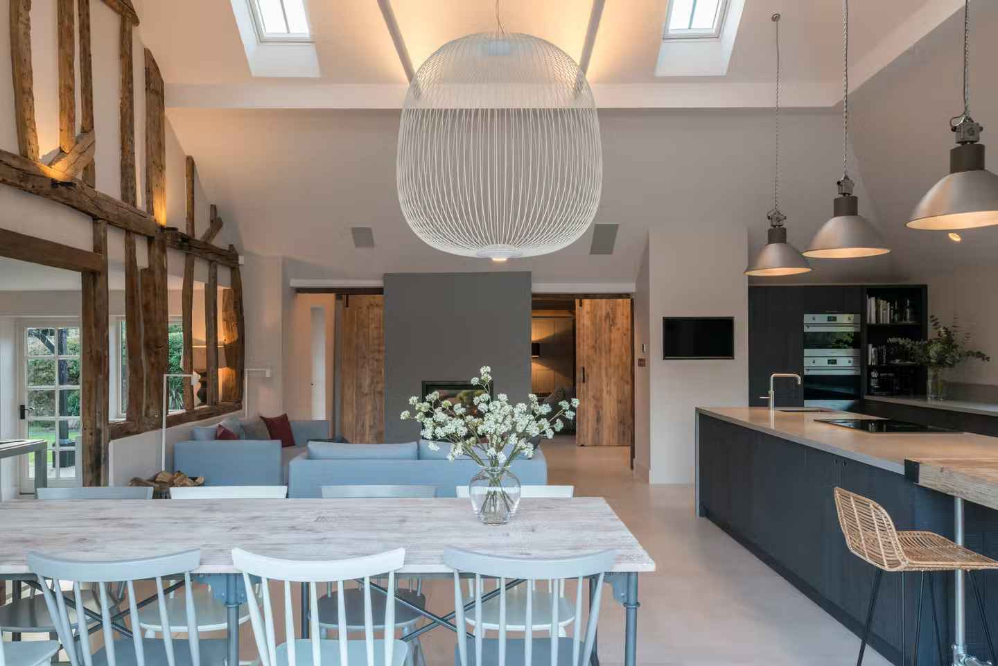 Przebudowane zachodnie skrzydło kryje obecnie przytulną wnękę z boazerią i ukrytymi schodami prowadzącymi do gościnnej sypialni na poddaszu. Cały dom oferuje trzy sypialnie z łazienkami, każda z odsłoniętymi belkami i indywidualnym charakterem. Salon z kominkiem i niższym sufitem kontrastuje z jasną częścią dzienną, podkreślając strefowy charakter domu. Ta renowacja stodoły pokazuje, jak można połączyć przeszłość, teraźniejszość i przyszłość pod jednym dachem, tworząc komfortową i funkcjonalną przestrzeń z duszą.