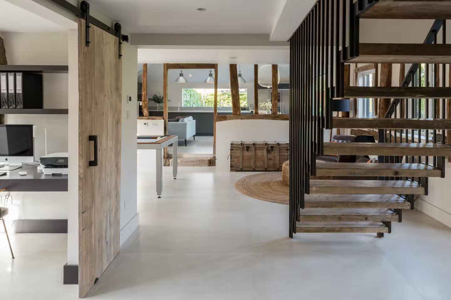 Renowacja zakładała usunięcie nieudanych przeróbek z lat 90. i ponowne odkrycie oryginalnej, drewnianej konstrukcji. Projektanci z Gresford Architects wykorzystali ją jako fundament do stworzenia nowej, harmonijnej przestrzeni mieszkalnej. Jasna paleta kolorystyczna, naturalne materiały i otwarty plan tworzą atmosferę nowoczesnego, a zarazem przytulnego domu. Duże przesuwne drzwi od wschodu otwierają wnętrze na ogród, łącząc dom z naturą. Rustykalne belki, ręcznie wykonane schody i detale z litego drewna to ukłon w stronę dziedzictwa tego miejsca – idealnie wpisują się w trend adaptowania tradycyjnych budynków do stylu nowoczesnej stodoły.