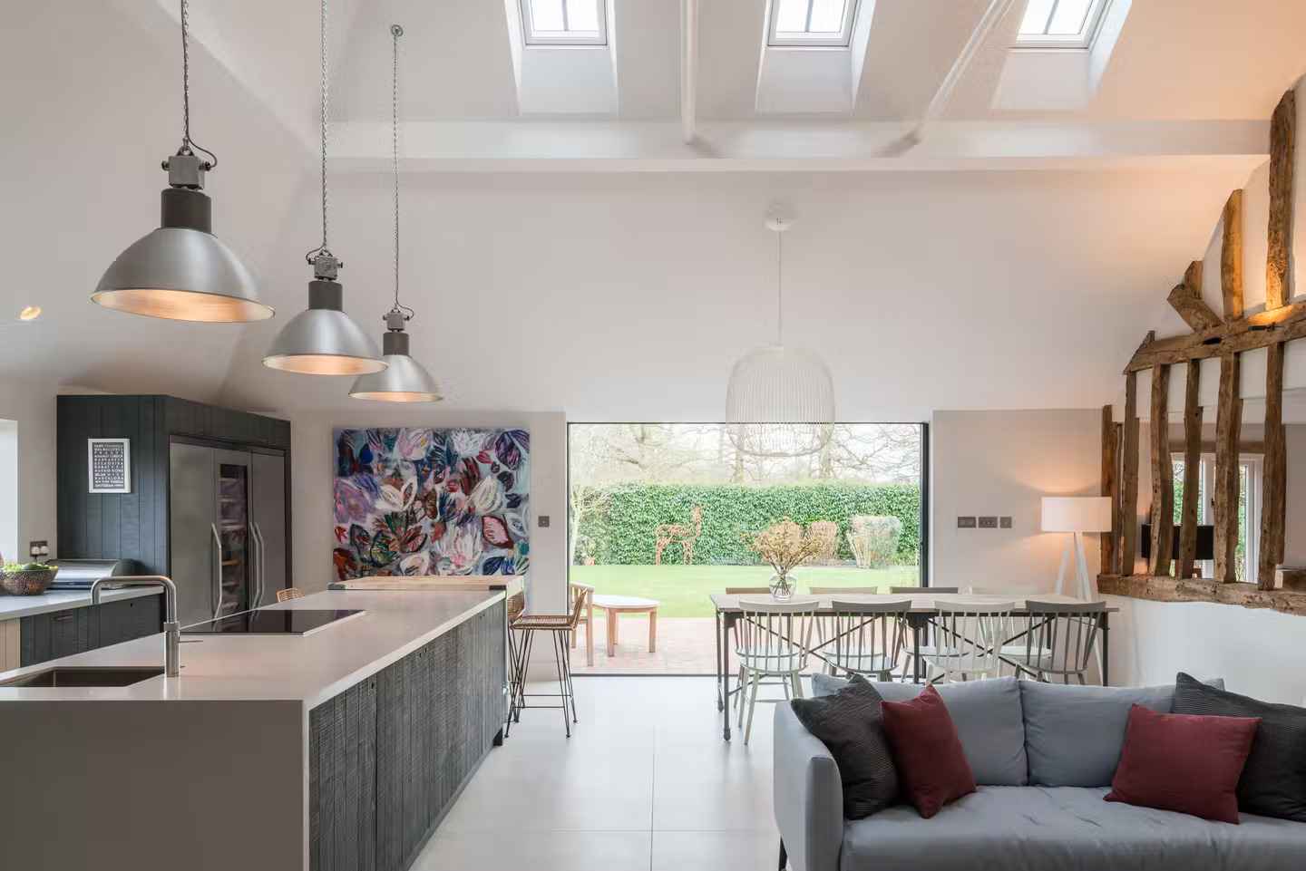 Great Barn to wyjątkowy przykład, jak przemyślana renowacja może tchnąć nowe życie w zabytkową zabudowę. Położona w malowniczym hrabstwie Buckinghamshire, w zielonym pasie Beaconsfield Old Town, stodoła została przekształcona w pełen charakteru dom rodzinny. Gdy dzieci właścicieli opuściły dom, nadszedł czas na zmiany – nowy projekt, zrealizowany przez pracownię Gresford Architects, miał przywrócić dawny urok budynku i dopasować przestrzeń do potrzeb pary, która chciała cieszyć się spokojnym życiem z dala od miejskiego zgiełku. Odważne otwarcie przestrzeni nad kuchnią aż po dach, użycie oryginalnej stolarki oraz dodanie nowoczesnych rozwiązań w duchu nowoczesna stodoła nadało wnętrzom unikalny klimat.