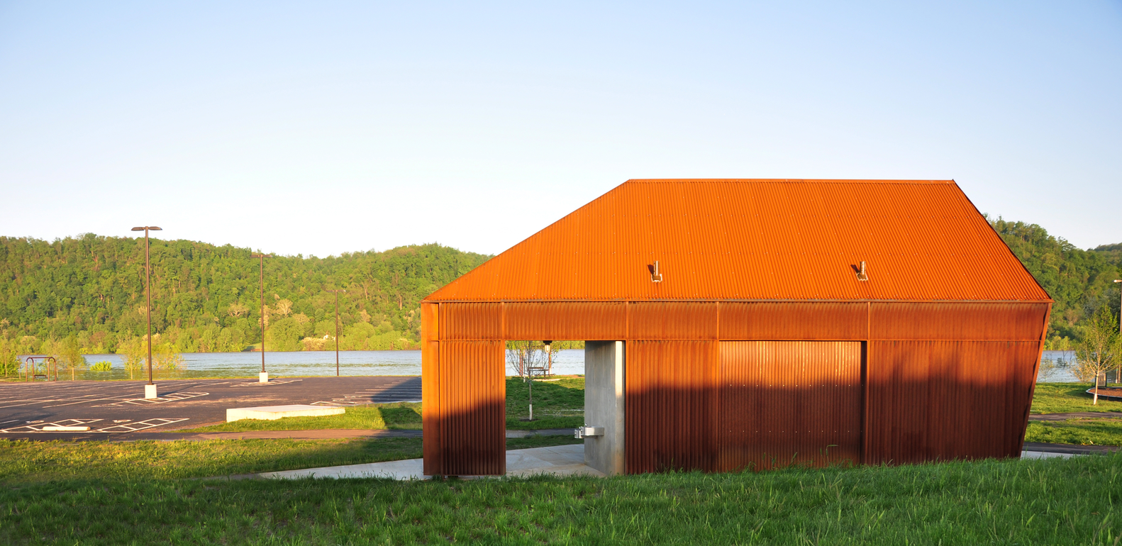 W Louisville w stanie Kentucky powstał innowacyjny budynek publiczny w Riverview Park, który jest efektem współpracy architektów z De Leon & Primmer Architecture Workshop nad udoskonaleniem miejskiej przestrzeni rekreacyjnej. Projekt miał trzy cele: stworzenie ikonicznej konstrukcji, która nada charakter zaniedbanemu obszarowi, wizualne powiązanie różnych stref parku oraz zaprojektowanie budynku trwałego, który nie będzie wymagał dużych nakładów na konserwację, nawet w miejscu zagrożonym powodziami. W nowym budynku znajdują się toalety, fontanny, pomieszczenia na sprzęt parkowy oraz systemy sterujące nawadnianiem i oświetleniem, a jego konstrukcja łączy stal kortenowską, kraty z ocynkowanej stali i beton wylewany na miejscu, tworząc minimalistyczną estetykę przypominającą nowoczesną stodołę w prostych formach i wytrzymałych materiałach.