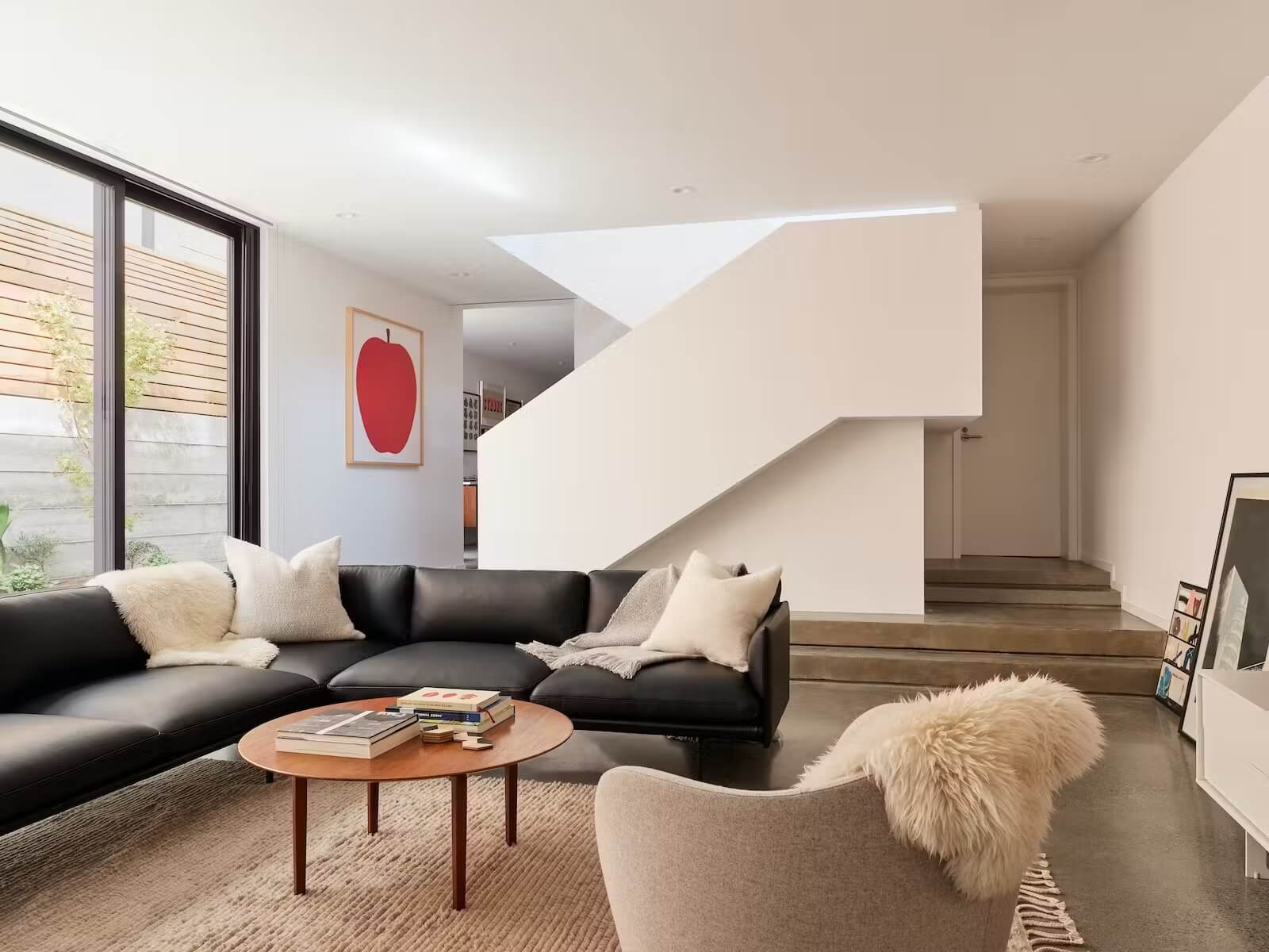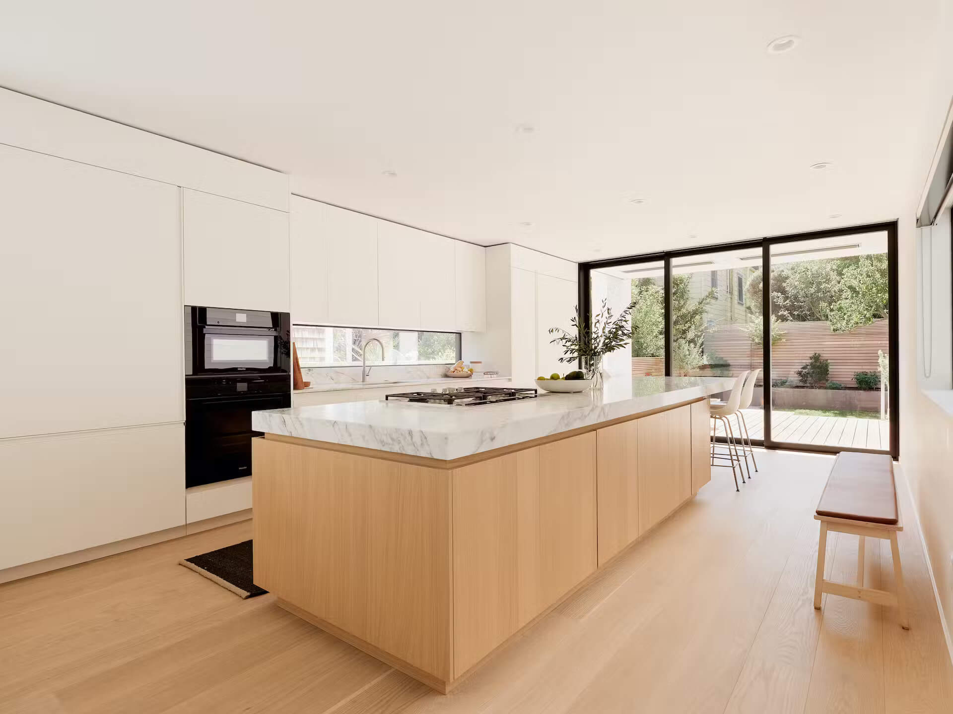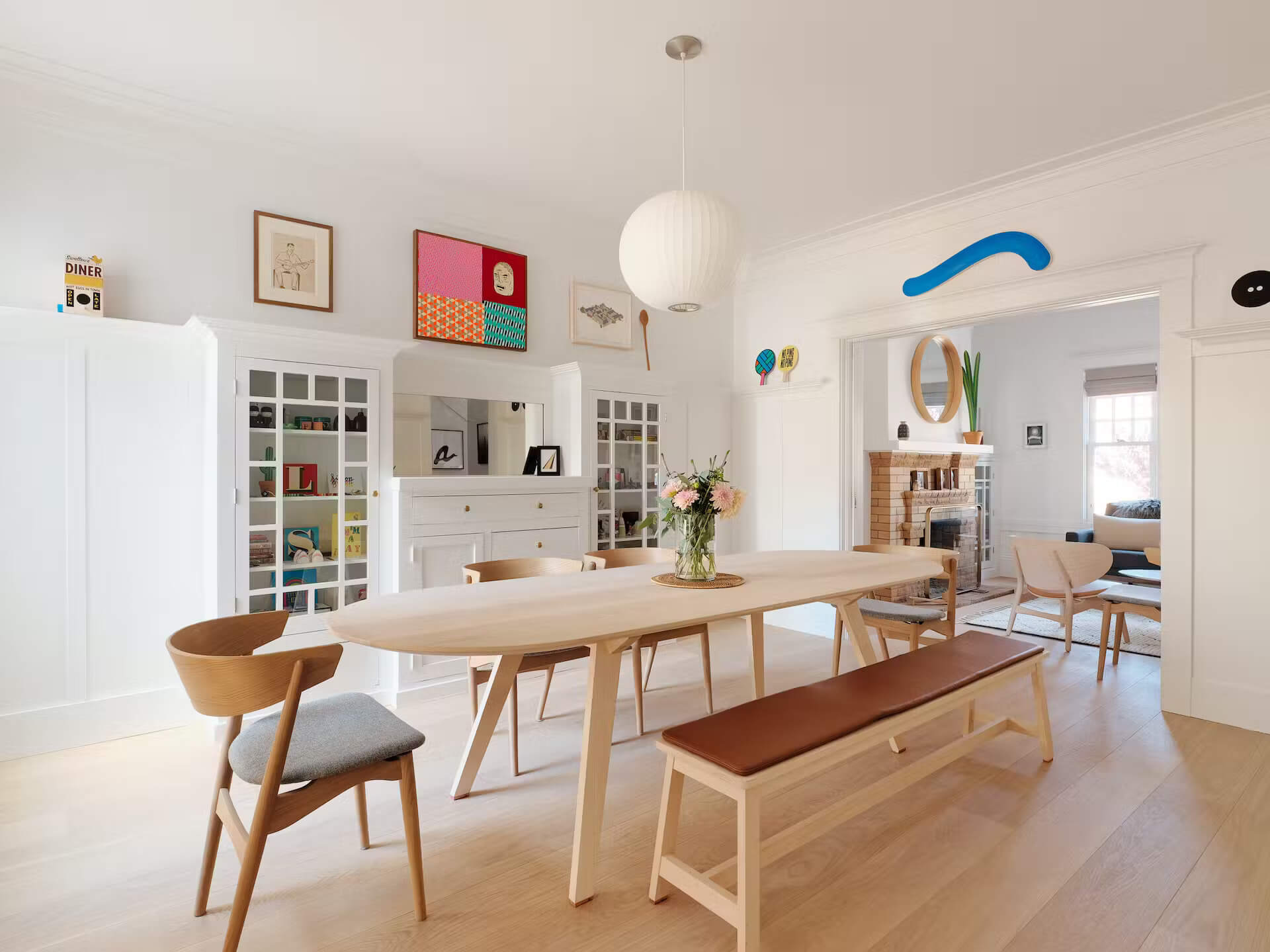 Gdy rodzina się powiększyła, brakowało przestrzeni – kuchnia była za ciasna, apartament w piwnicy niedostępny od wewnątrz, a sypialnie rozmieszczone na dwóch piętrach. Lokalna firma Edmonds + Lee Architects zaprojektowała przebudowę, zachowując historyczne detale w frontowej części domu i urok podwórka.