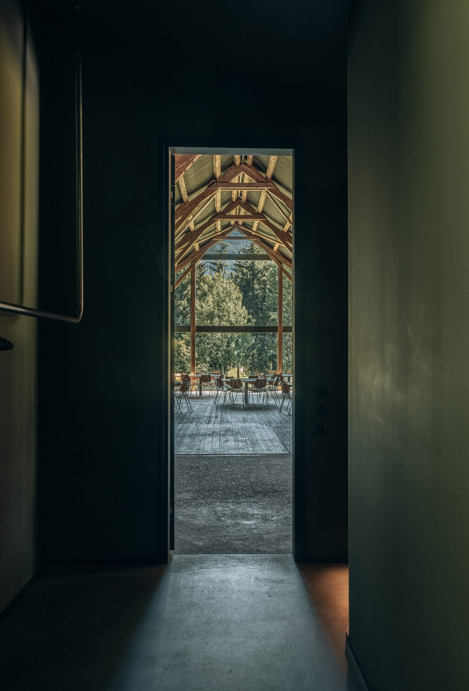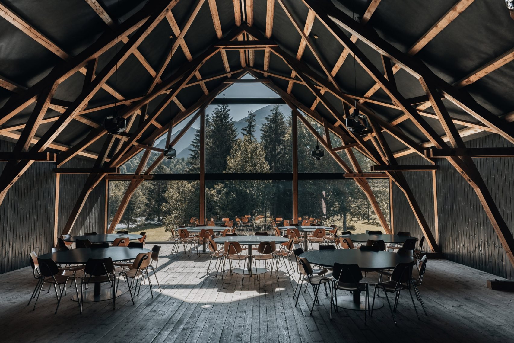 Rozmieszczone w sali okrągłe stoły otoczone są rytmem drewnianych belek i trawersów, a subtelnie zaprojektowane przeszklenia kadrują widoki bez zaburzania proporcji budynku. Jak podkreśla autor projektu, Maksymilian Sawicki: „Timber offered low embodied impact, local craft and supply, and a material compatibility that keeps the structure as the project’s character.”