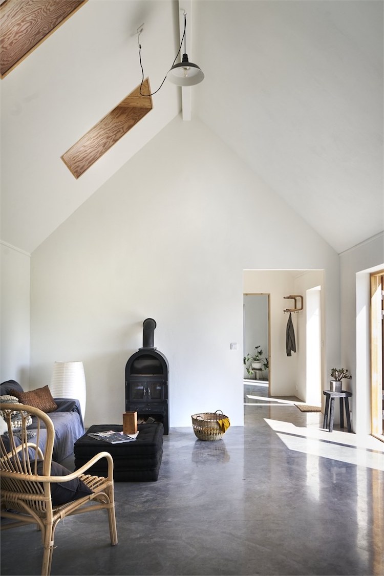 Charakterystyczne wysokie sufity w kształcie litery A nadają wnętrzom przestronny i przewiewny charakter, tak typowy dla nowoczesnych stodół. Drewniane akcenty harmonijnie łączą się z surową, minimalistyczną estetyką, tworząc ciepłą i przytulną przestrzeń. Naturalne materiały, proste formy i skandynawska elegancja sprawiają, że dom jest doskonałym miejscem do odpoczynku i życia w zgodzie z naturą.