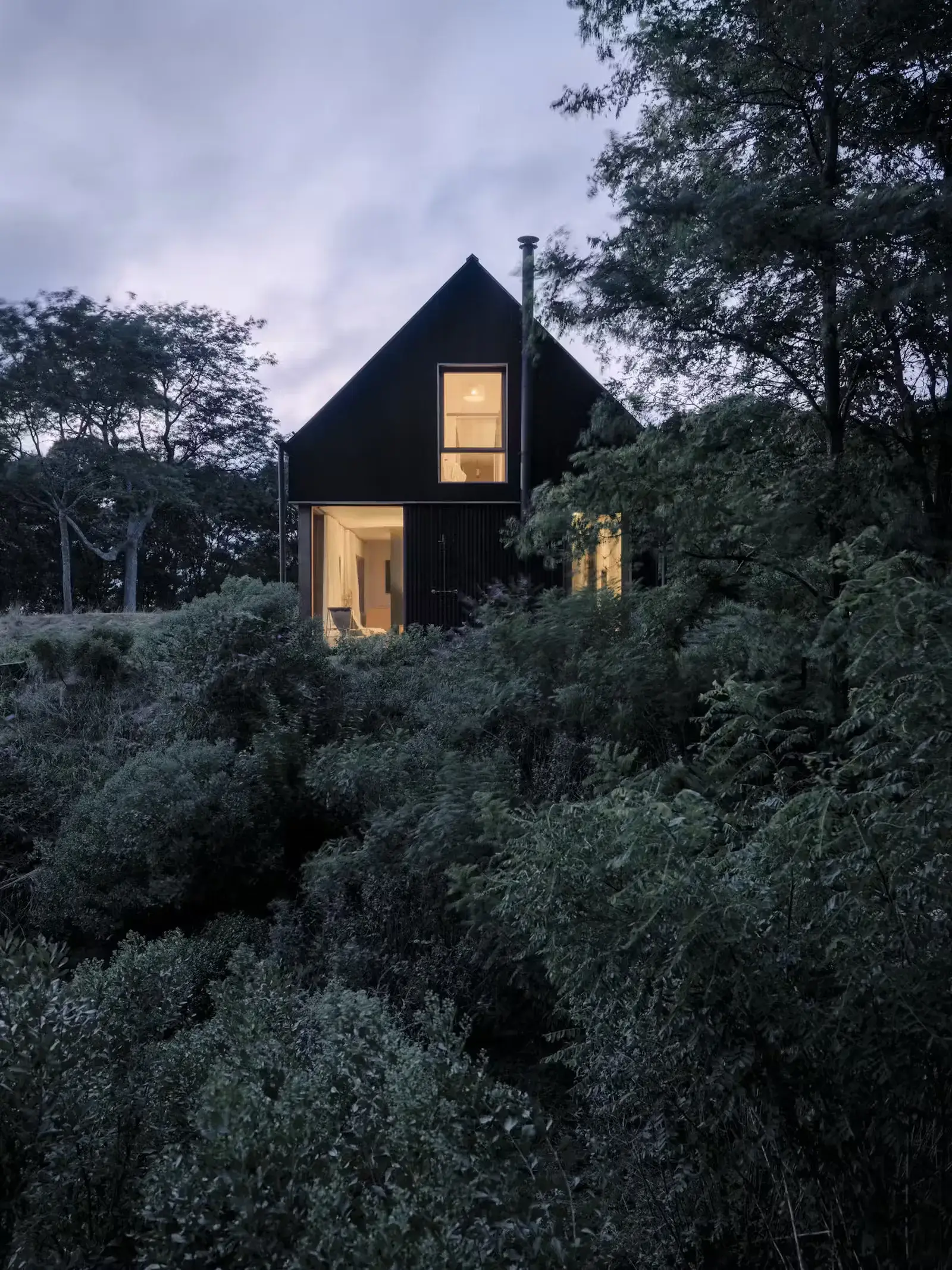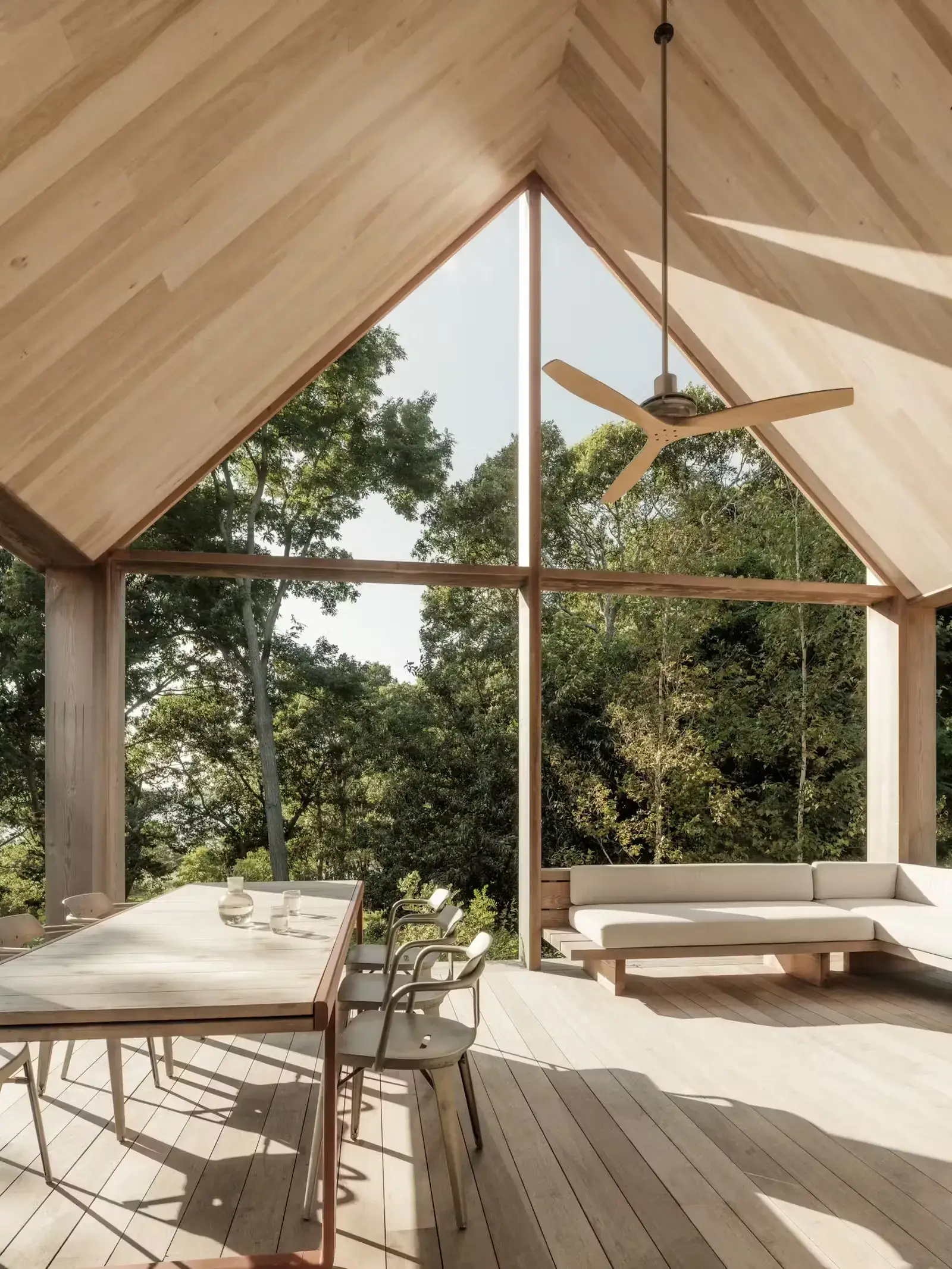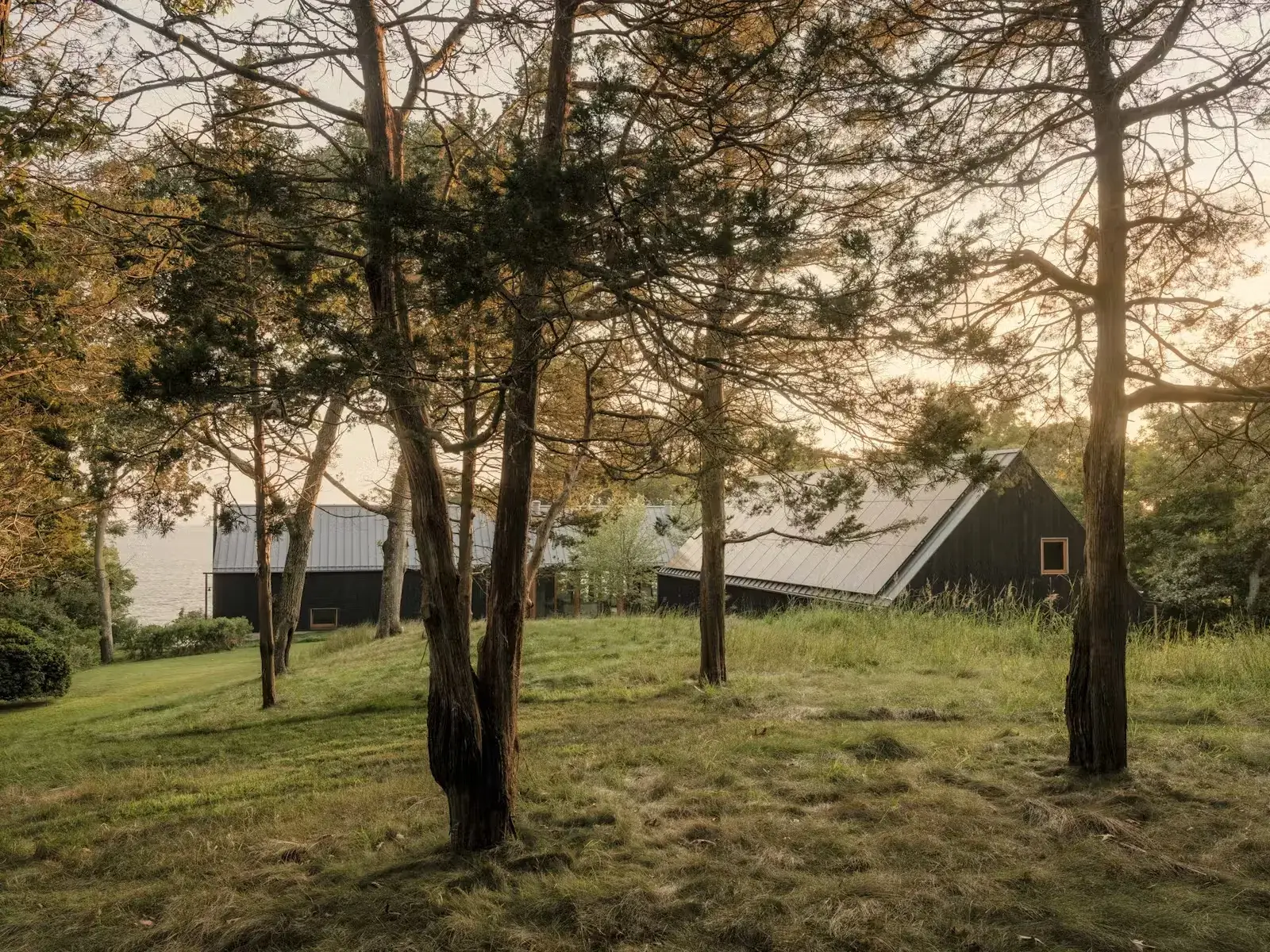 „Wyobrazili sobie obóz, w którym oni i ich goście będą mieli swoje prywatne przestrzenie” – mówi założyciel firmy Lake|Flato z Teksasu. Powstały dom to trójdzielny plan obejmujący trzy przypominające stodołę konstrukcje szczytowe, rozmieszczone w półkolu wokół otwartego dziedzińca. Budynki wkomponowano w zalesiony teren o powierzchni 4,5 hektarów, przy czym główna konstrukcja wychodzi na dziedziniec z jednej strony i oferuje widoki na wodę z drugiej. Ścieżka łączy główny dom z innymi konstrukcjami – garażem i salą do ćwiczeń oraz domem piętrowym z trzema sypialniami i kompaktową częścią dzienną. Ta konstrukcja pomocnicza została przebudowana na miejscu z istniejącej wozowni. Wzdłuż południowej krawędzi kompleksu nowoczesnych stodół rozciąga się basen.