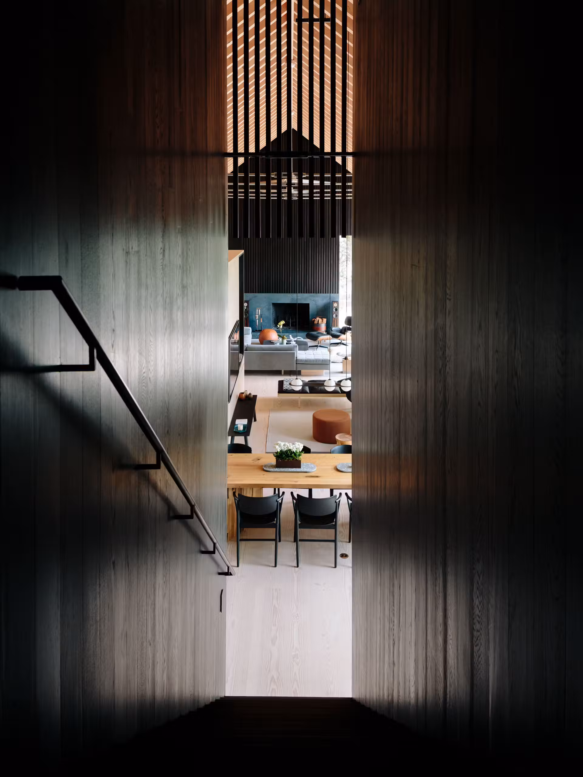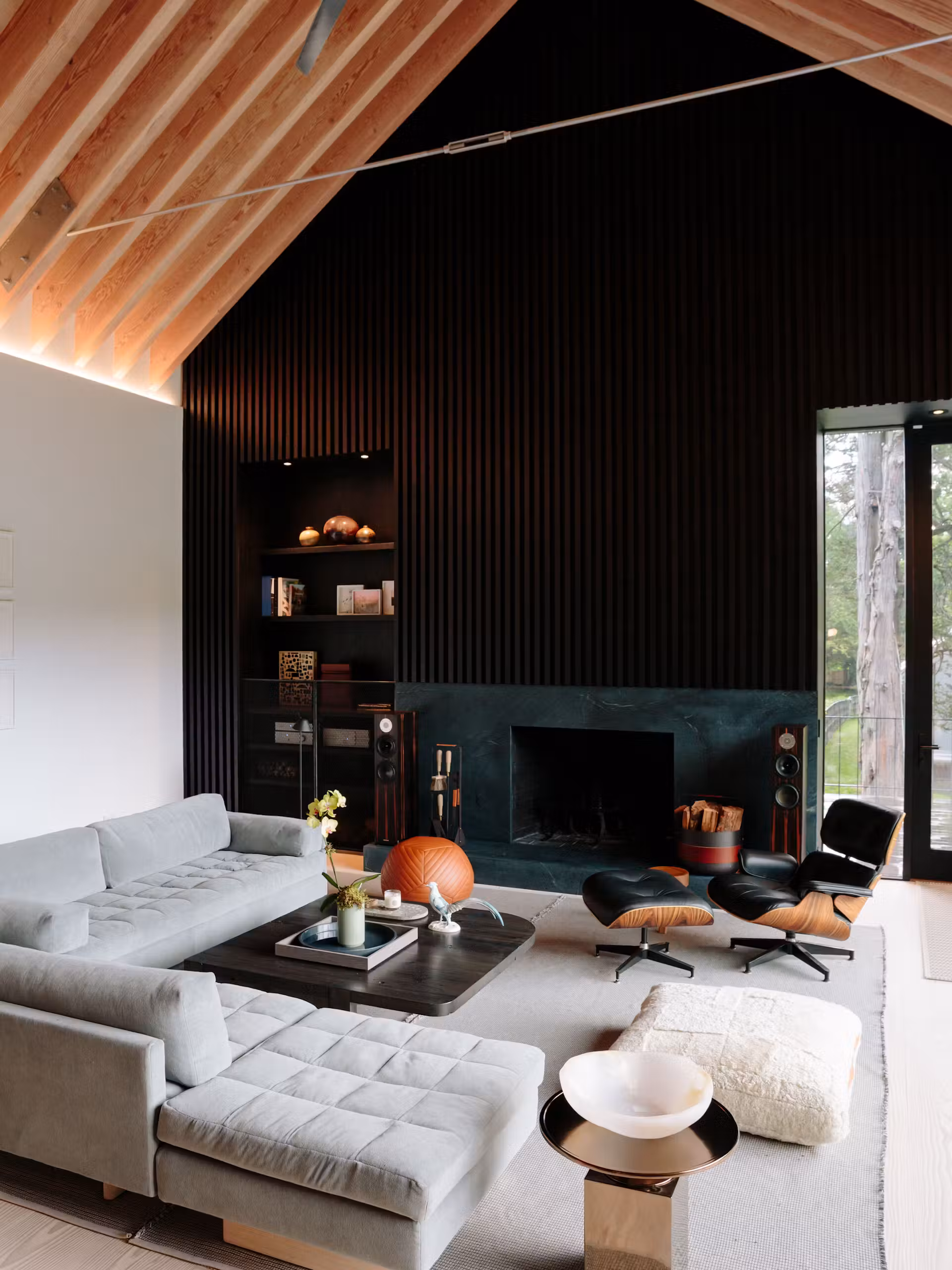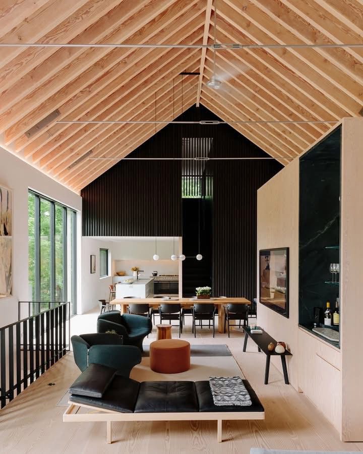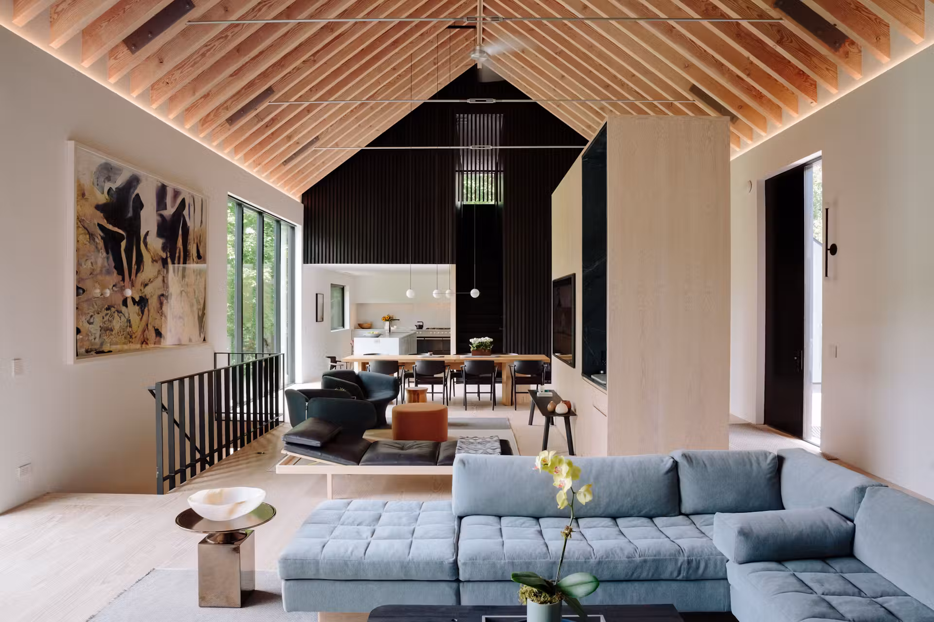 Wnętrze zachowuje przestronność dawnej stodoły, z wysokimi, ponad 6-metrowymi sufitami z widocznymi belkami. Podłogi wykonano z szerokich desek daglezji, a Douglas-fir został również użyty do zabudowy przy wejściu, gdzie ukryto szafę na płaszcze i barek. Centralny kominek, obłożony steatytem, stanowi punkt odniesienia w salonie, który płynnie przechodzi w jadalnię i kuchnię.