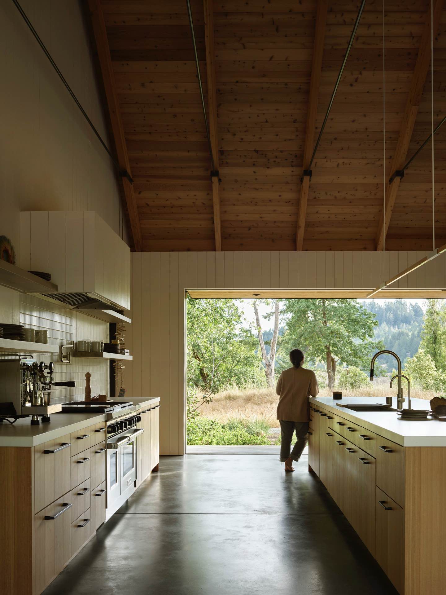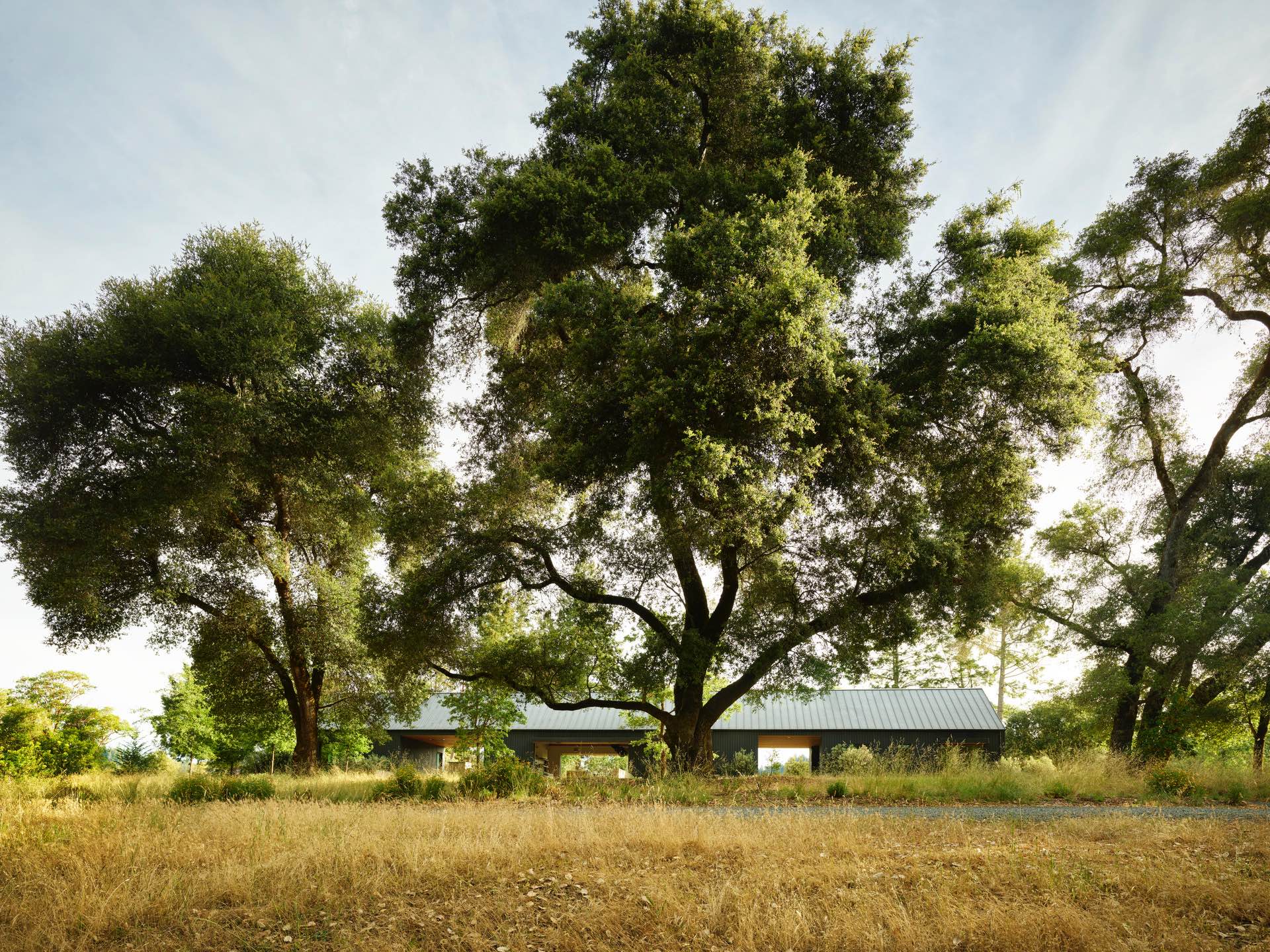 Na 450-akrowej działce w północnej Kalifornii powstała prywatna rezydencja, w której architektura i wnętrze tworzą spójną opowieść o relacji człowieka z naturą. Projekt opiera się na idei wizualnej i fizycznej harmonii z otoczeniem – przestrzeń domu nie tylko wtopiona jest w krajobraz, ale wręcz wyrasta z ziemi, czerpiąc z niej materiał i rytm.