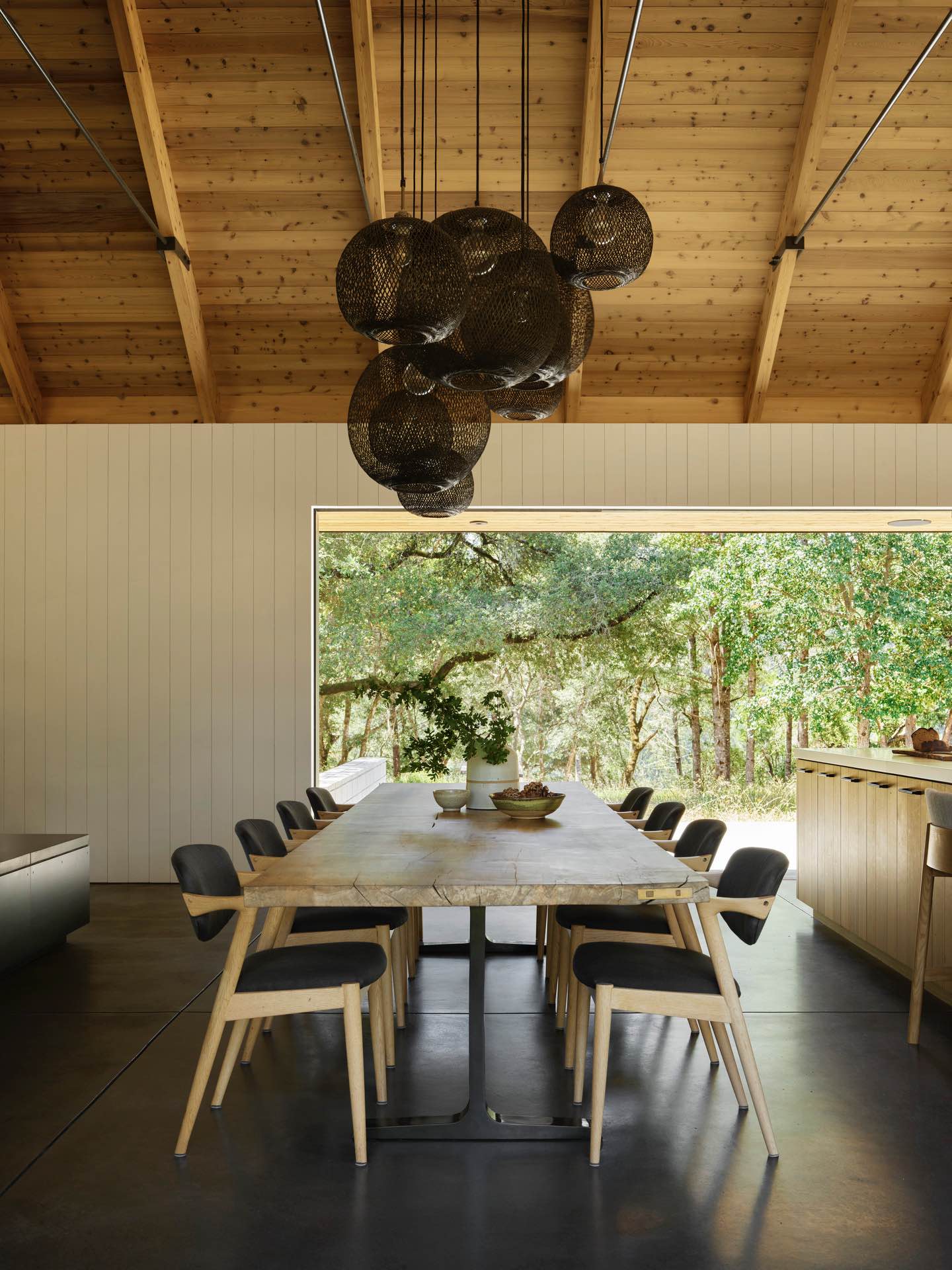 Pomiędzy nimi znajduje się główna przestrzeń dzienna – kuchnia, jadalnia i pokój zabaw w jednym otwartym planie. Szerokie przeszklenia wsuwane w ściany pozwalają dosłownie otworzyć wnętrze na łąkę i gaj dębowy, zamieniając dom w półotwarty pawilon wtopiony w krajobraz.