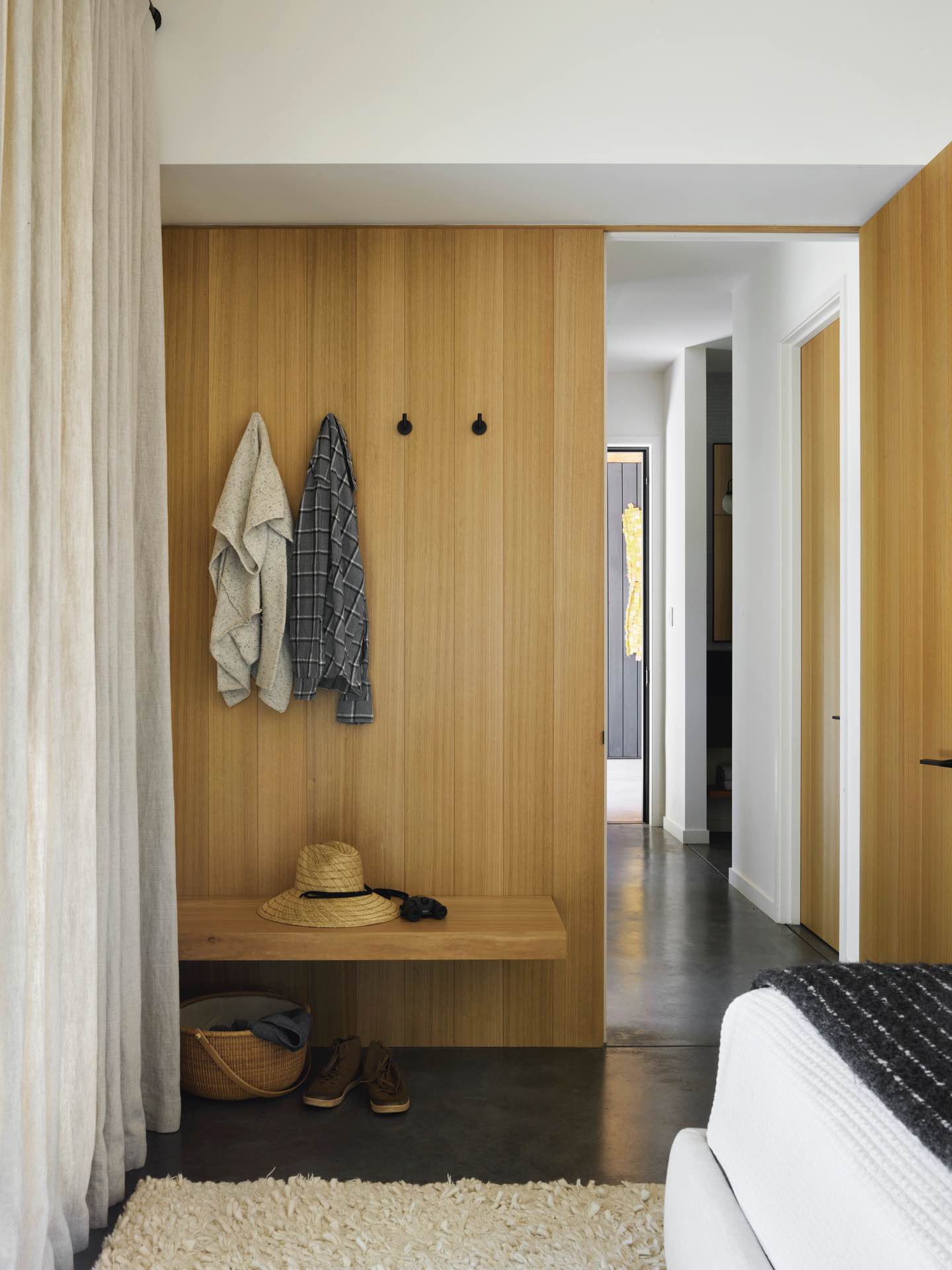 Układ domu zorganizowano wokół dwóch otwartych pasaży – tzw. „dog trots”, które stanowią przejścia między strefami prywatnymi a wspólnymi. Pełnią one funkcję nie tylko wejść, ale i zewnętrznych salonów, w których można odpocząć na świeżym powietrzu.