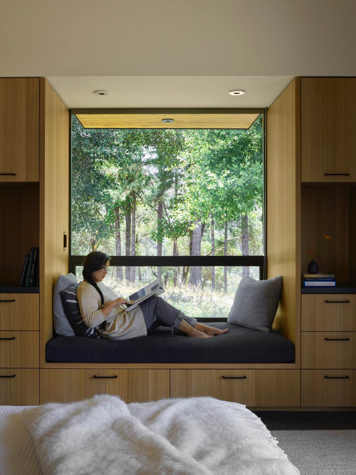 Sypialnia główna i pokoje gościnne umieszczone po obu stronach części wspólnej pozwalają zachować równowagę między bliskością a prywatnością. W domu znalazły się też kameralne zakątki – jak niewielka czytelnia, w której można schować się z książką lub obserwować przyrodę przez panoramiczne okno.