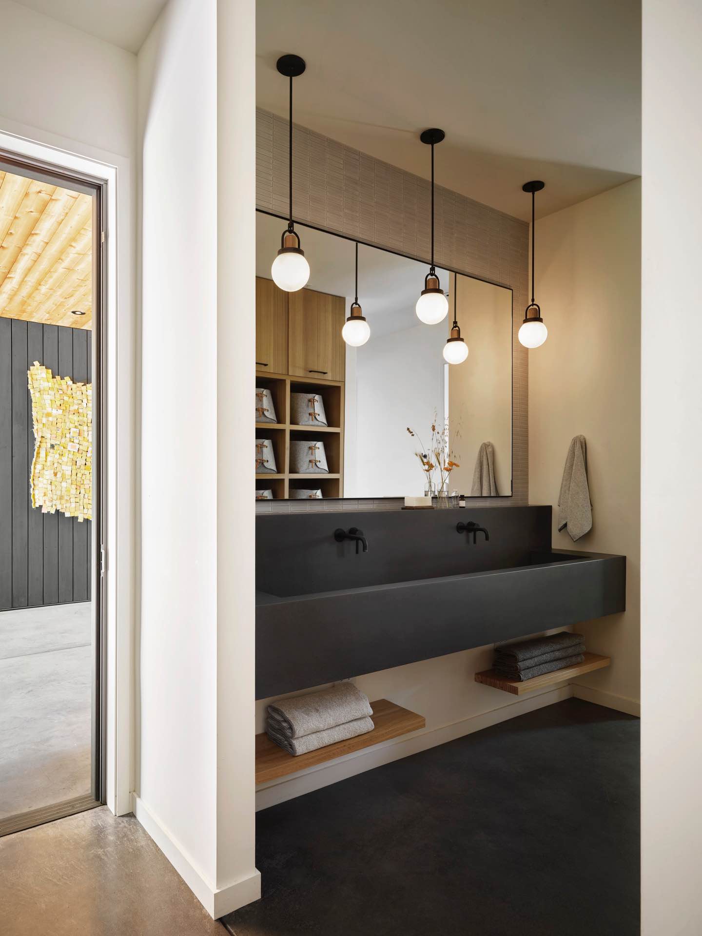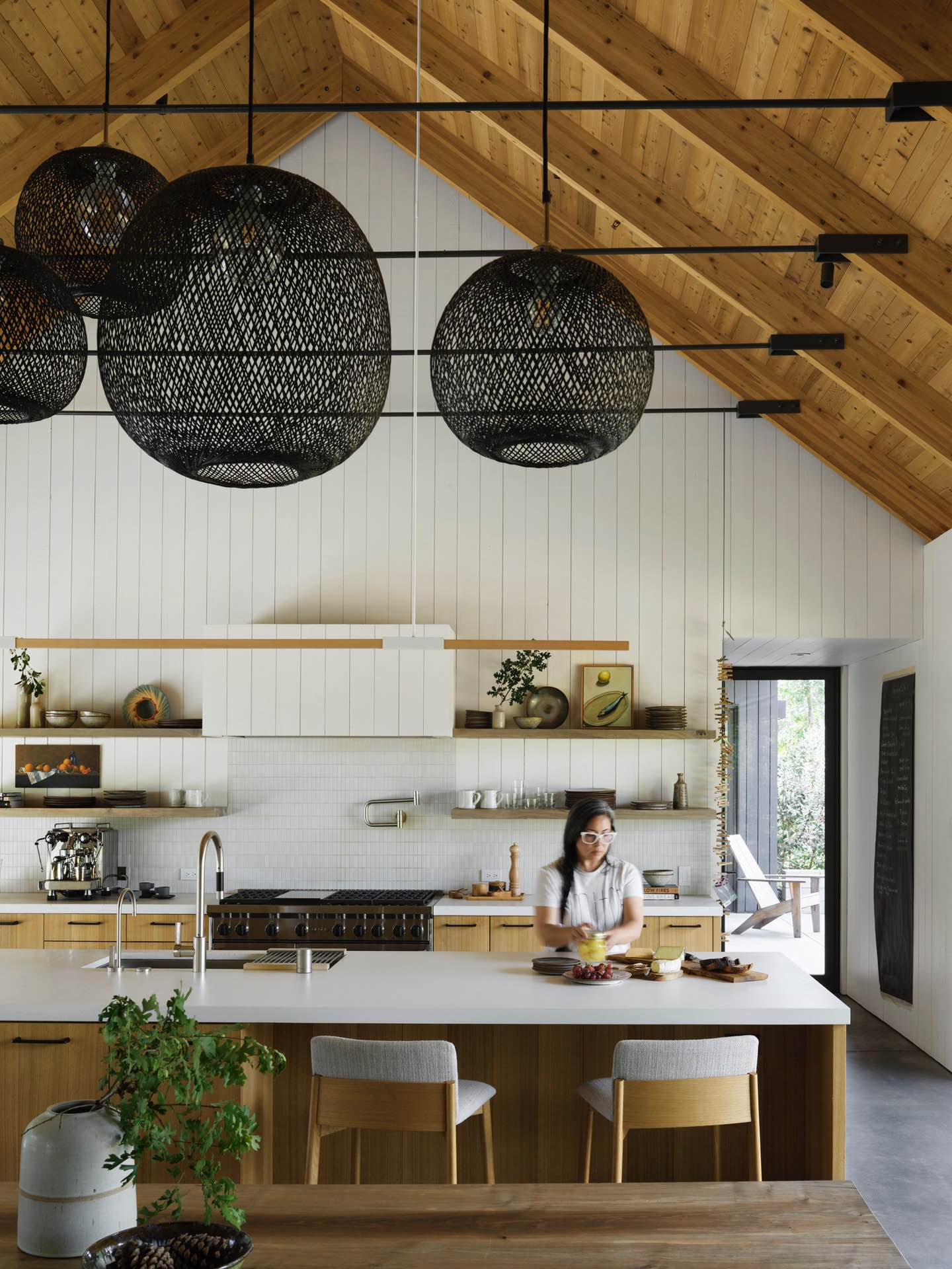Bryła o prostej formie dachu dwuspadowego osadzona została z naturalną elegancją na szczycie wzgórza. Ciemna elewacja współgra z korą okolicznych drzew, sprawiając, że dom niemal stapia się z lasem. Wewnątrz dominują naturalne odcienie drewna i kamienia, które przywołują kolory kalifornijskiej ziemi. Stonowana paleta barw tworzy atmosferę spokoju i skupienia, idealną dla aktywnej rodziny szukającej oddechu od miejskiego życia.