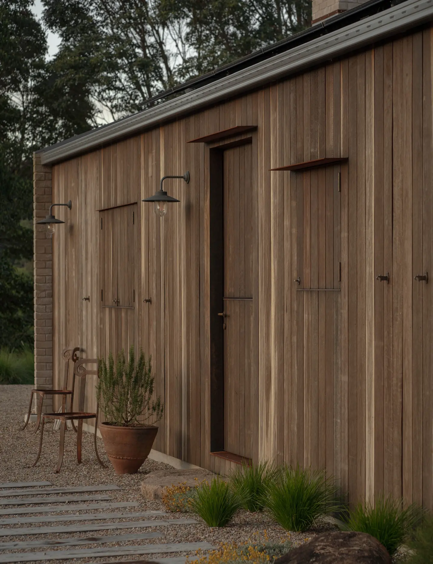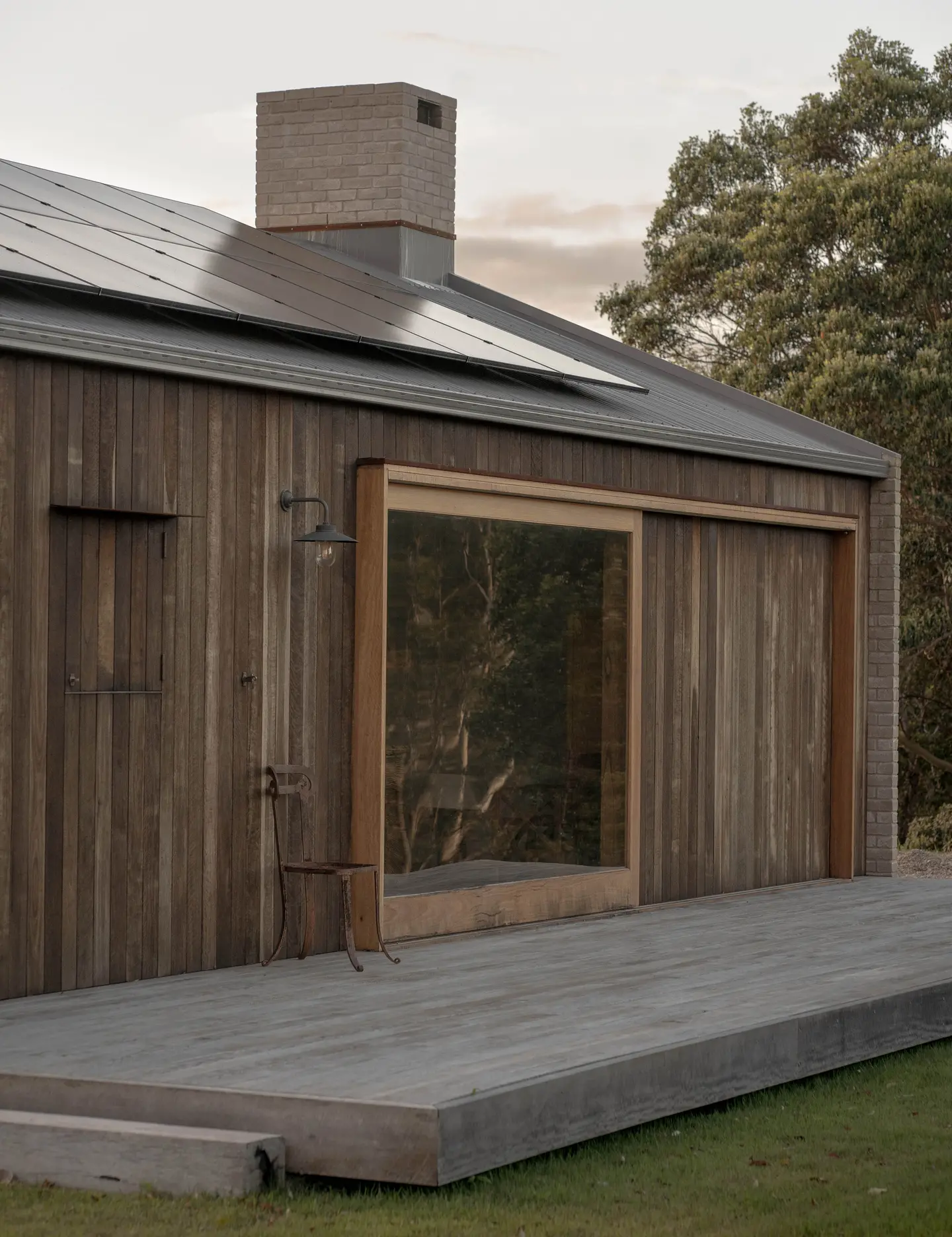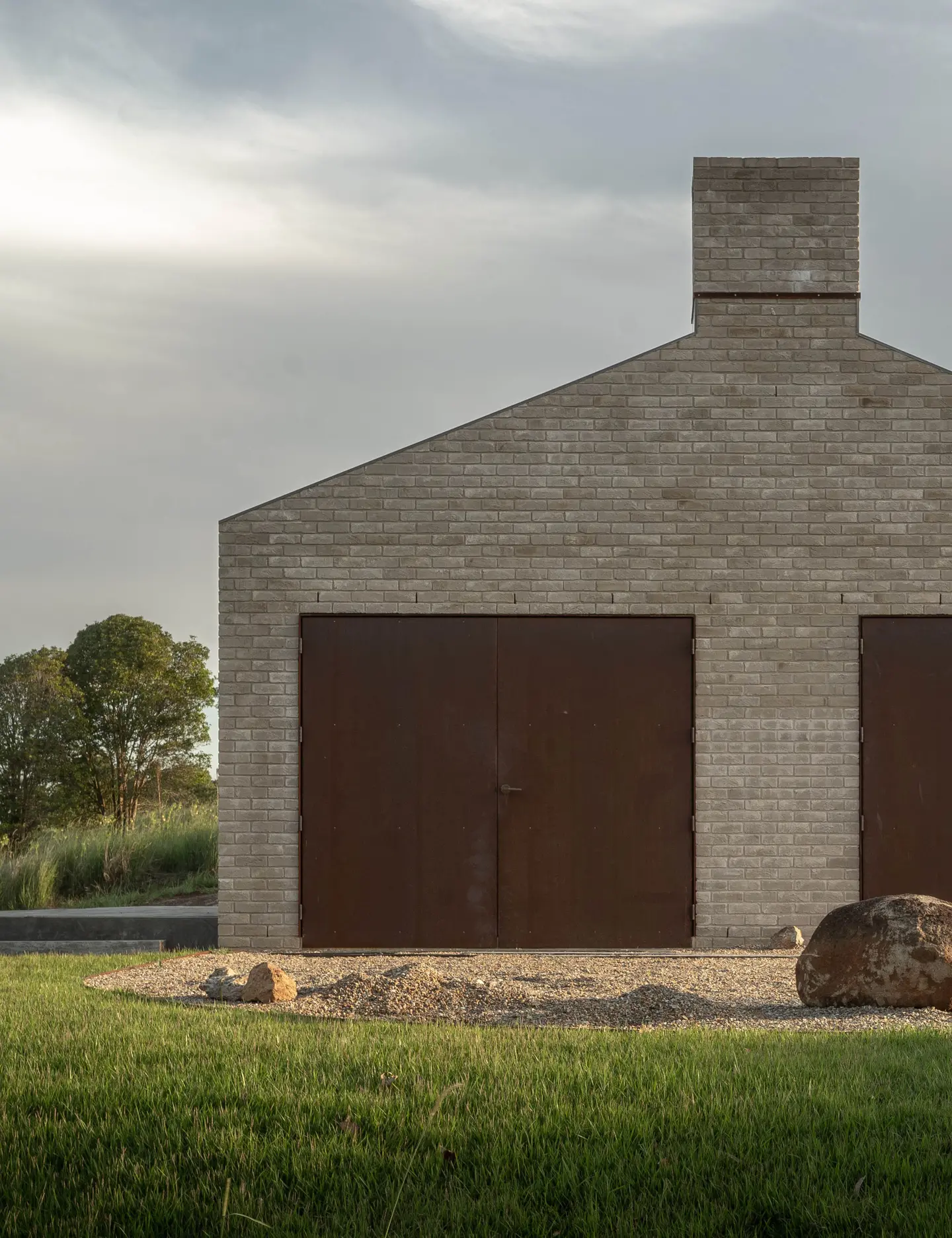 Bryła przypomina współczesną stodółkę z dwuspadowym dachem, nawiązującą do wiejskiego krajobrazu regionu. Elewacje pokryto ciemnym drewnem spotted gum, uzupełnionym fragmentem muru z cegły po stronie północnej, gdzie znajduje się kominek. Dzięki temu całość nabiera naturalnej, ziemistej tonacji, która harmonizuje z otoczeniem.