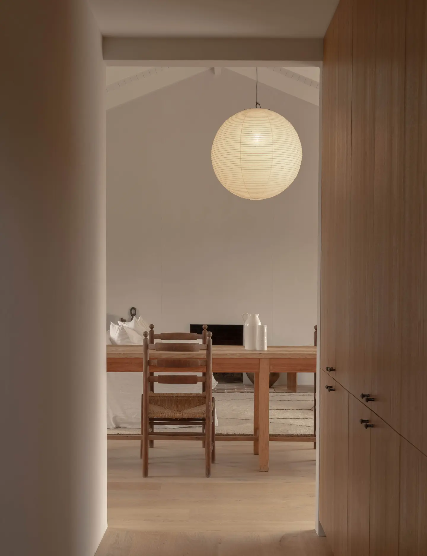 Wnętrze to kwintesencja minimalizmu – białe ściany, jasne podłogi z drewna i proste, ciepłe meble, uzupełnione stalową kuchnią o nowoczesnym charakterze. Wnętrze jest zarazem surowe i przytulne – pełne światła, ale bez zbędnych detali.