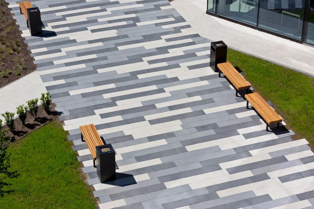 Geometryczne podziały i rytm płyt tworzą wrażenie porządku i nowoczesności. Dzięki modularnym formatom można budować różnorodne układy, które podkreślają liniowość otoczenia i nadają mu współczesny charakter.