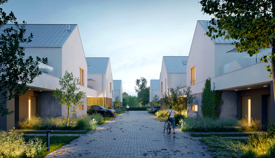 Kameralne osiedle składające się zaledwie z czterech budynków zostało zaprojektowane na podstawie dwóch głównych założeń, gdzie nowoczesny charakter rozwiązań materiałowych splata się z układem funkcjonalnym pozwalającym odpowiedzieć na potrzeby użytkowników i możliwości działki. Poprzez zastosowanie schematu przesunięć i uskoków jesteśmy w stanie urozmaicić fasadę zespołu, kreując tym samym tożsamość i charakter miejsca. Dzięki zastosowaniu podcieni i zróżnicowanych wykończeń, użytkownik z poziomu wejścia i ogrodu, może obserwować ciekawą grę świateł ślizgających się po elewacji. Wyraźne odcięcie parteru ukształtowane poprzez wspomniane zabiegi, harmonizuje jednolita, biała wstęga górnej kondygnacji.