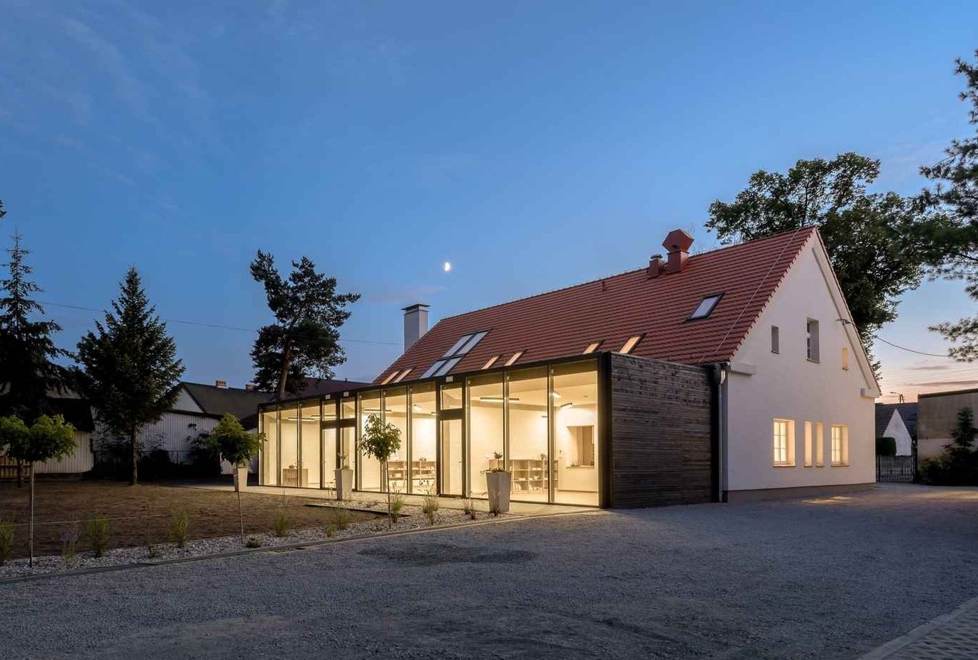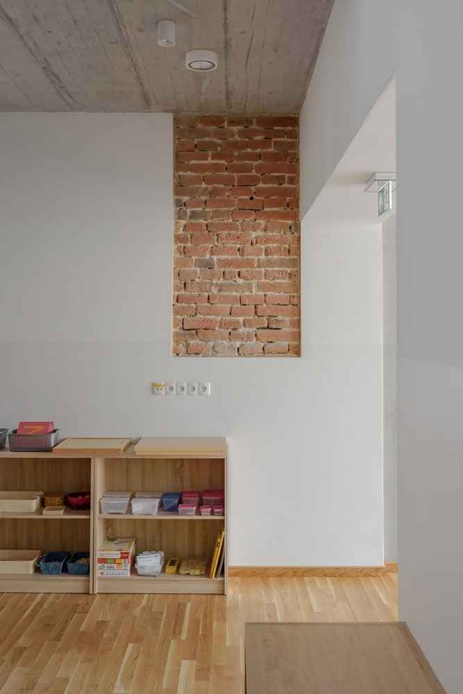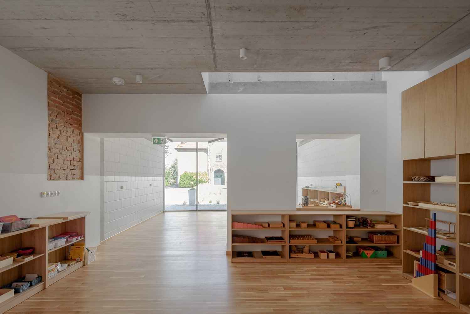 Istniejący budynek został rozbudowany i przekształcony w dynamiczną przestrzeń przedszkola. Zachowano pierwotną kubaturę obiektu, poszerzając ją o przeszkloną strefę wewnętrzną, która działa jak wewnętrzne podwórko. Dzięki temu dzieci mają stały kontakt z naturą, światłem dziennym i zmieniającymi się porami roku. Transparentna architektura zaciera granicę między wnętrzem a otoczeniem, co w duchu filozofii Montessori pozytywnie wpływa na rozwój sensoryczny i emocjonalny najmłodszych.
