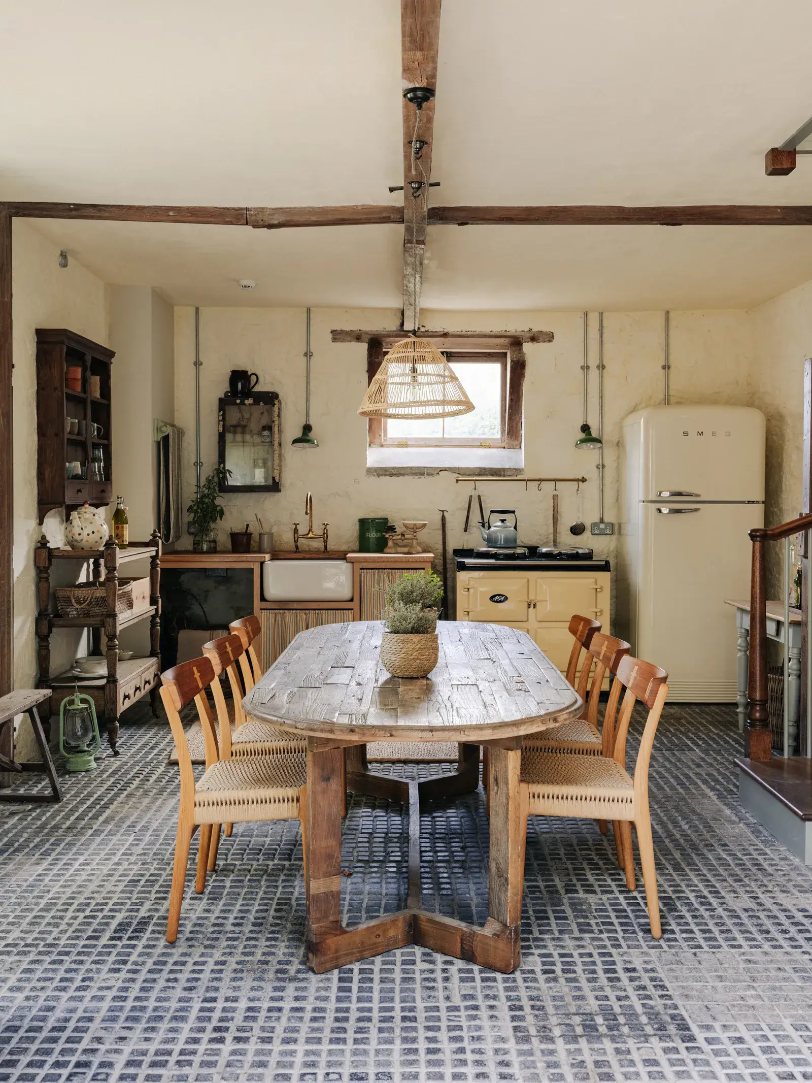 Wzdłuż tylnej ściany Anna dodała niezabudowaną kuchnię. Na środku pokoju umieszczono zabytkowy stół jadalny i krzesła pochodzące z głównego budynku. „Chcieliśmy, aby ten pokój sprawiał wrażenie, jakby zawsze tak był” wyjaśnia Anna, wskazując ściany wykończone teksturowanym wapnem w kolorze pergaminu. Zabytkowa ławka stoi pod schodami tak schludnie, że można by pomyśleć, że została stworzona specjalnie do tego miejsca. Na górze Anna wygospodarowała miejsce na łazienkę. Deski podłogowe były dość zniszczone, dlatego zamontowano nową podłogę w łazience. Udało się jednak zachować oryginalne deski sosnowe w sypialni.