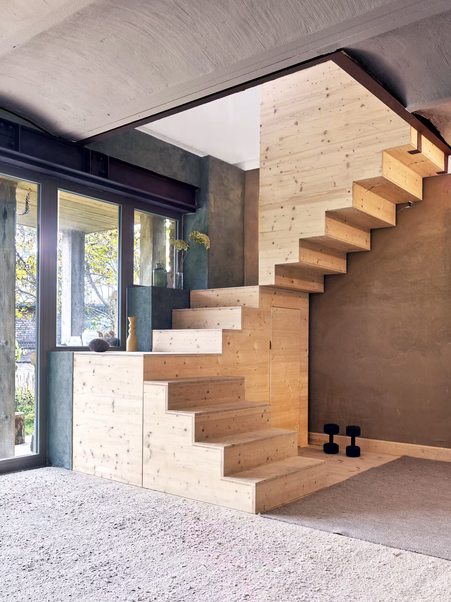 Schody, będące centralnym elementem wnętrza, nie tylko łączą kondygnacje, ale także tworzą subtelną granicę prywatności – górna część biegu schodowego działa jak pionowa zasłona, która odcina prywatną strefę piętra. Ich forma łączy się z dolną częścią schodów w punkcie wspólnego lądowania, tworząc wyrafinowaną kompozycję przestrzenną.