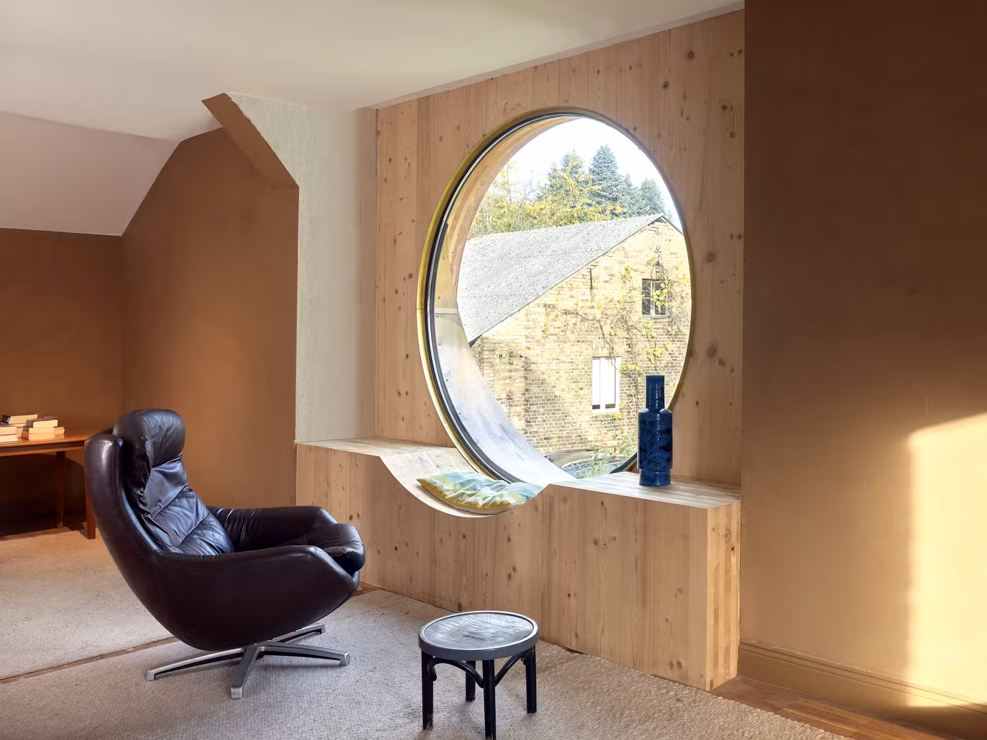 Jednym z najważniejszych elementów tej realizacji jest nowy, okrągły otwór okienny w ścianie szczytowej – dotychczas zupełnie pozbawionej okien. Teraz wschodzące słońce swobodnie wpada do wnętrza, a ręcznie wykuta z mosiądzu ramka okienna odbija światło i chroni drewnianą konstrukcję przed wodą. Szyba osadzona została bez klasycznej ramy – bezpośrednio w prefabrykowanym drewnie warstwowym, co podkreśla precyzję wykonania i rzemieślniczy charakter projektu.